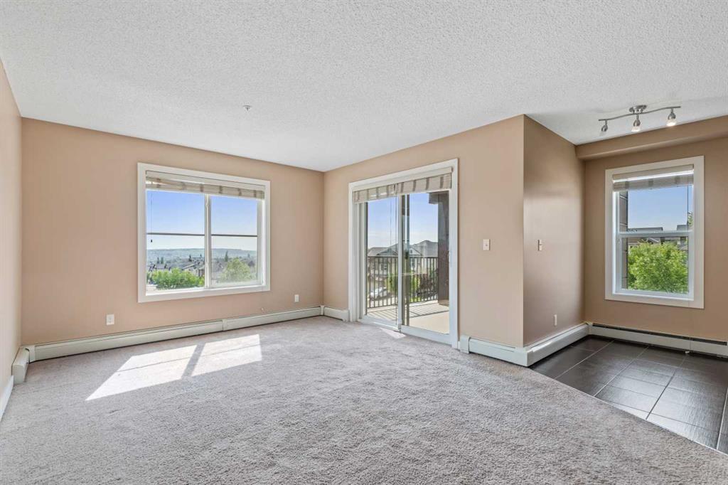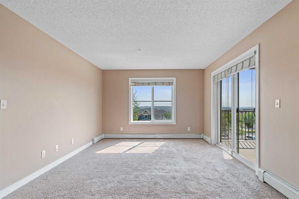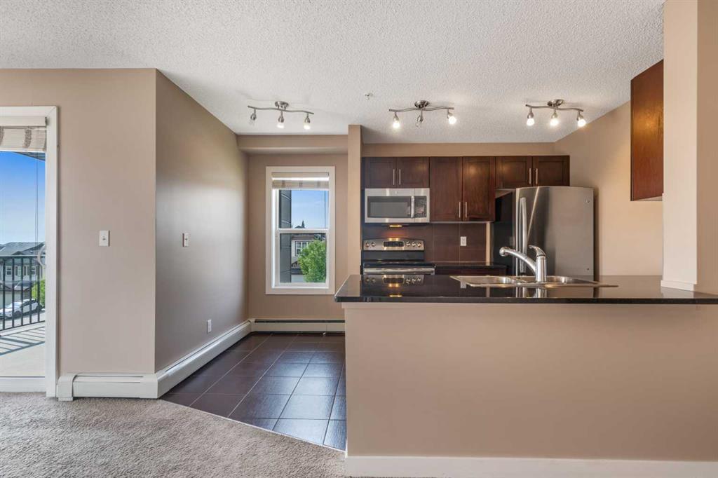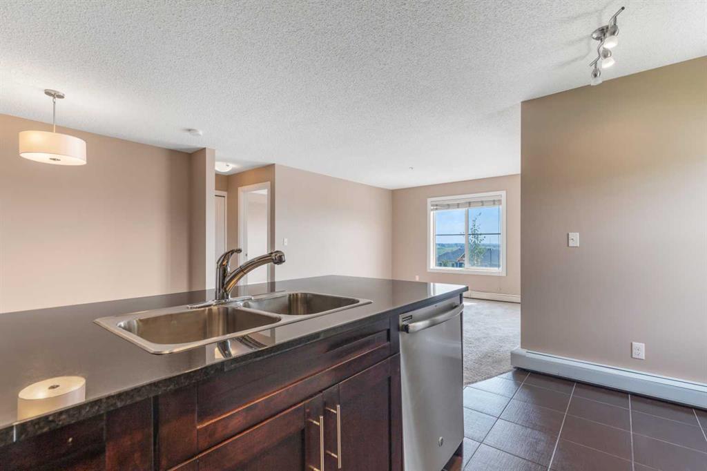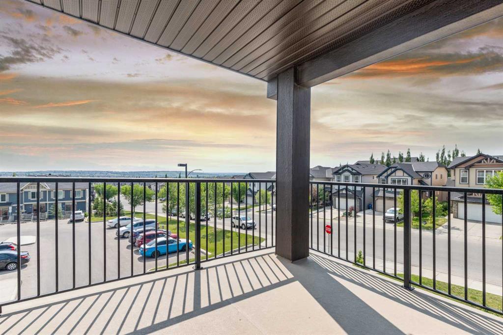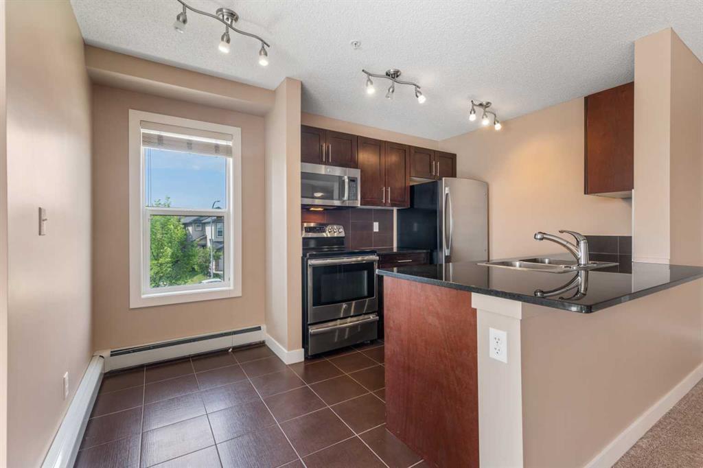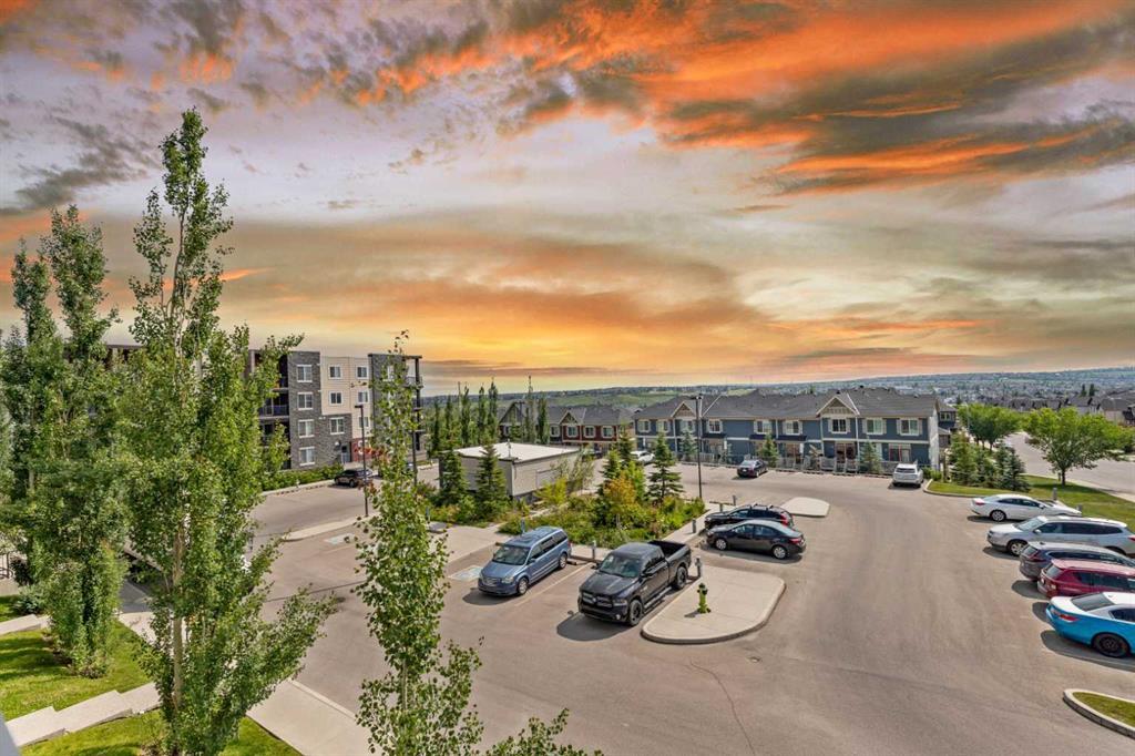 Welcome to this bright and spacious CORNER UNIT with a spectacular view in Kincora. Open concept layout with Living & dining room, kitchen, and office den. Large windows in Living room that brings tones of natural light fill in all corners of the house all year round. Chef’s dream LUXURY kitchen with upgraded GRANITE countertops, stainless steel appliances, Spacious cupboard space with upgraded soft-close cabinetry. Fresh paint throughout with upgraded raised baseboards. Large Master bedroom with walk through closet and a 4 pieces ensuite full bath. There is abundant space with 964 square feet of livable area including 2 bedrooms, 2 full bathrooms, In-suite laundry plus a HUGE covered patio with large sliding glass door direct access from Living room. One assigned under ground heated parking stall with many Visitor parking available. This third-floor corner unit is adjacent to only one other unit providing increased privacy and quietness with a breathtaking view of the hilly vista outside. Short distance walk to pathways, trails, ravines, bus stop and all other amenities; Creekside Shopping Centre, Co-op, Sage Hill Plaza, and Beacon Hill Centre. Easy access to downtown and the mountains via Stoney Trail & Deerfoot Trail. This surely a rare find beautiful & well kept Large Unit in one of the most convenient location in the north west. (id:22211)
