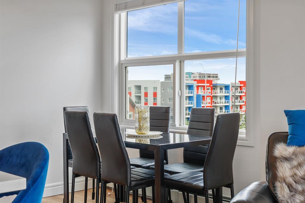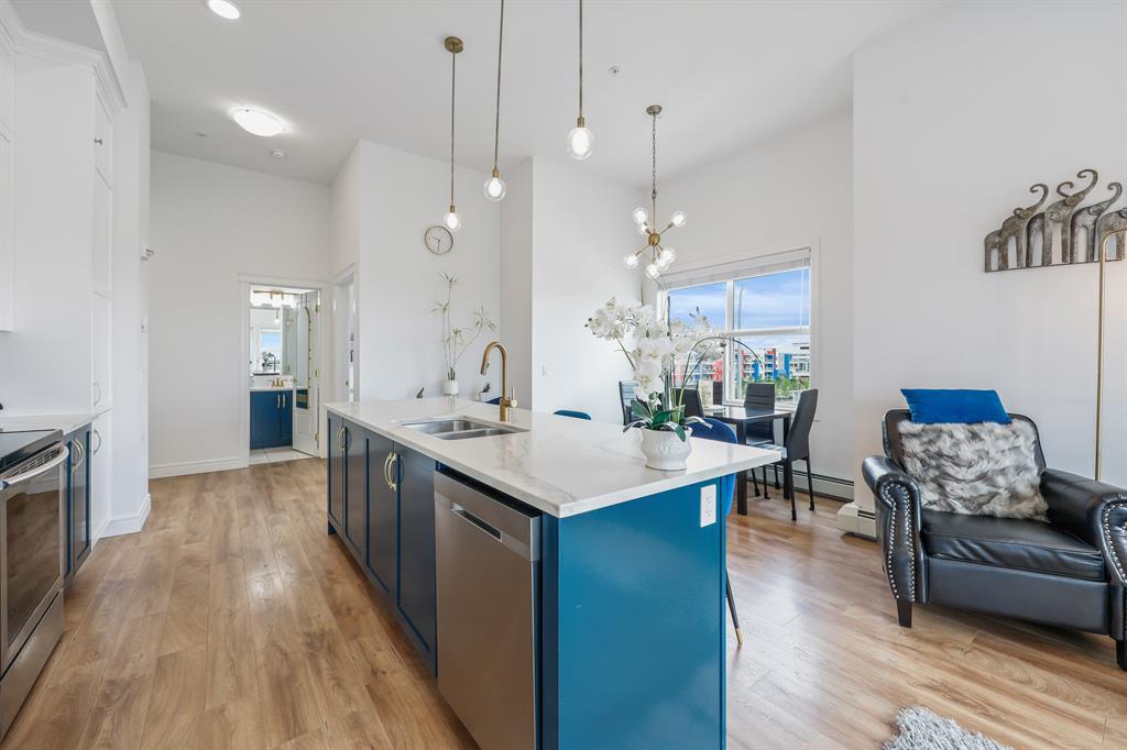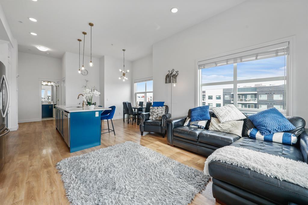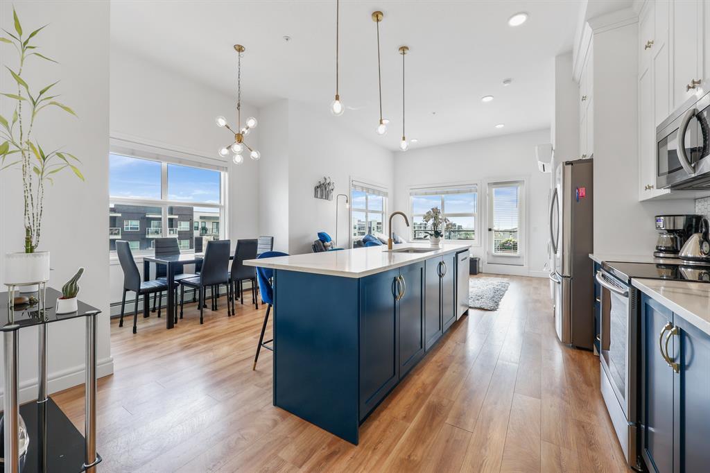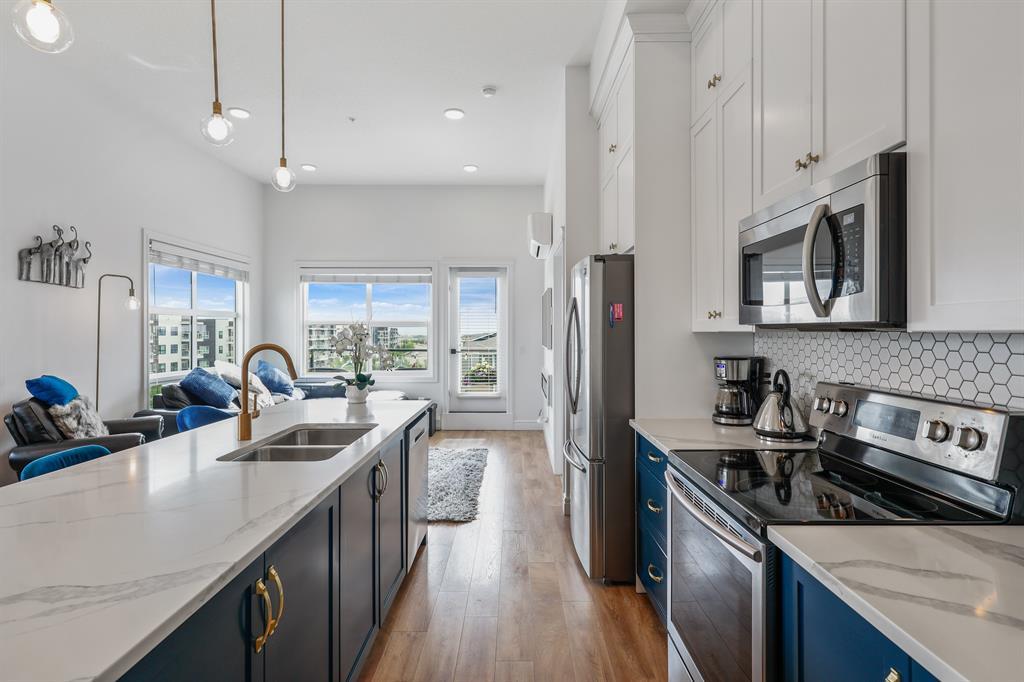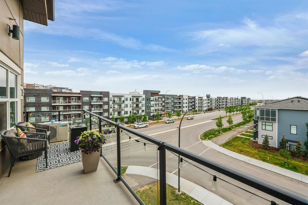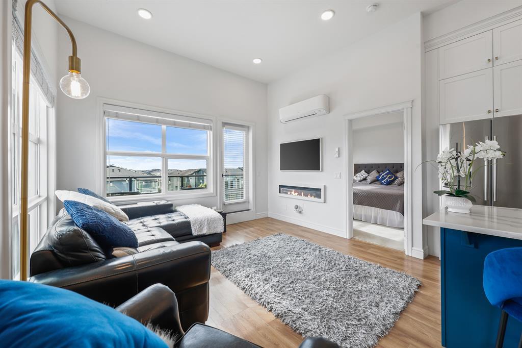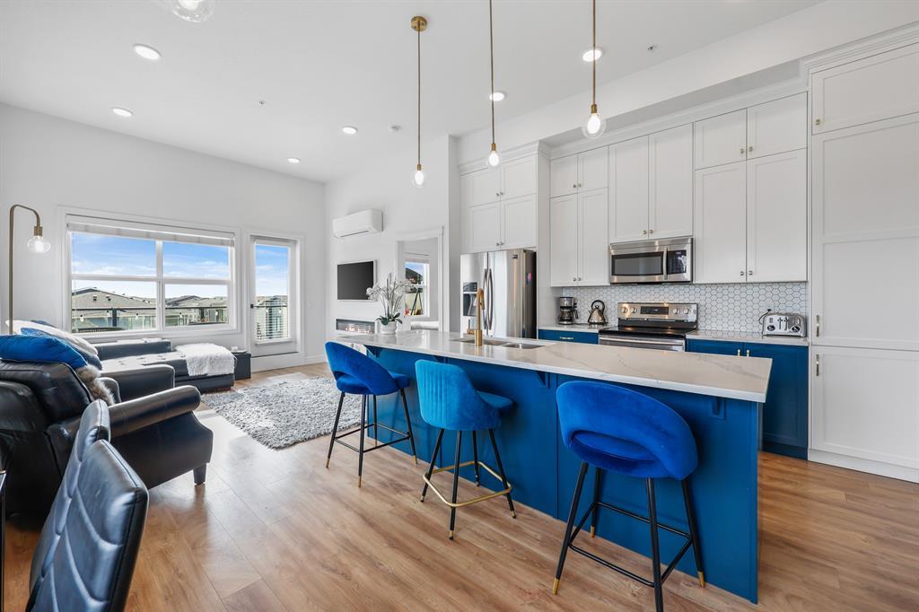 Experience the best of executive penthouse living in the heart of Seton. Prepare to be captivated by this remarkable top floor, corner unit, touched with luxurious finishes from the moment you step inside. 12ft ceilings extend the open living space and oversized windows provide natural light throughout. A sophisticated colour palette with bright whites and striking blue cabinetry, combines with upscale quartz counters throughout to highlight the quality craftsmanship of the original design.The fully equipped chef’s kitchen is provides a visual centre for the open living space. Highlighted by the generous quartz island, you’ll appreciate the custom hexagonal tile backsplash and full height cabinetry, including the built in pantry. Stainless steel appliances complete the high end focus of this space. A full dining area provides convenient entertainment space, fully open to the comfortable living room overlooking the largest patio available in the building.Enjoy the ambiance of the slimline electric wall fireplace on crisp fall evenings, while Central Air Conditioning and custom Hunter Douglas Blinds keep you comfortable during hot summer days. Step out onto the spacious 24'3" x 5'7" deck, complete with a Gas line for a BBQ, and create an additional outdoor living space for your enjoyment.High-end flooring is featured throughout, including beautifully tiled bathrooms and luxury textured laminate that is both aesthetically pleasing and easy to maintain. Both bedrooms feature upgraded carpeting for year round warmth and comfort.With 2 bedrooms and 2 full bathrooms, this executive condo offers the perfect retreat. The Master Suite features a spa-like 5 piece en suite, with a generous soaker tub, walk-in shower with exquisite ceiling-height tile, quartz tile flooring, dual vanities, and walk-in closet. The secondary bedroom offers a private entry to the 4 pc main bathroom, ensuring the utmost privacy for guests.Located minutes from the Seton Urban District, you’ll lov e the walkable convenience of a grocery store, VIP movie theatre, and not to mention a public library and the largest YMCA in the world. You’re also only a short walk to the South Health Campus and satellite medical facilities.Schedule your private tour today and envision your own penthouse lifestyle in the heart of Calgary’s newest urban community. (id:22211)