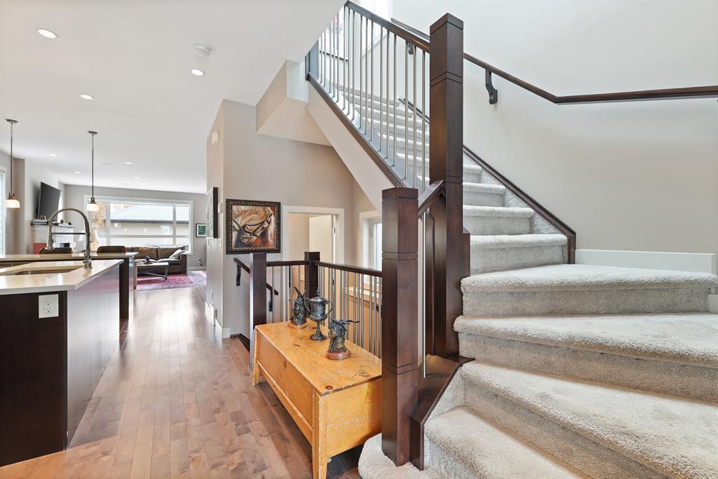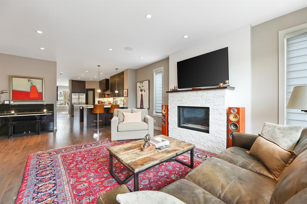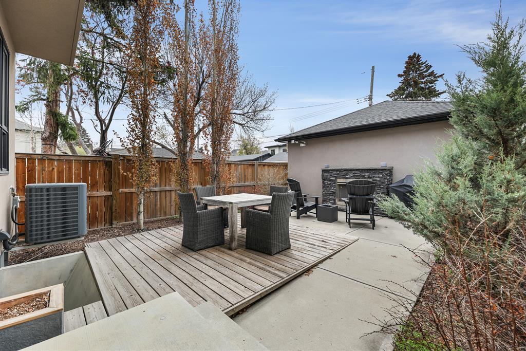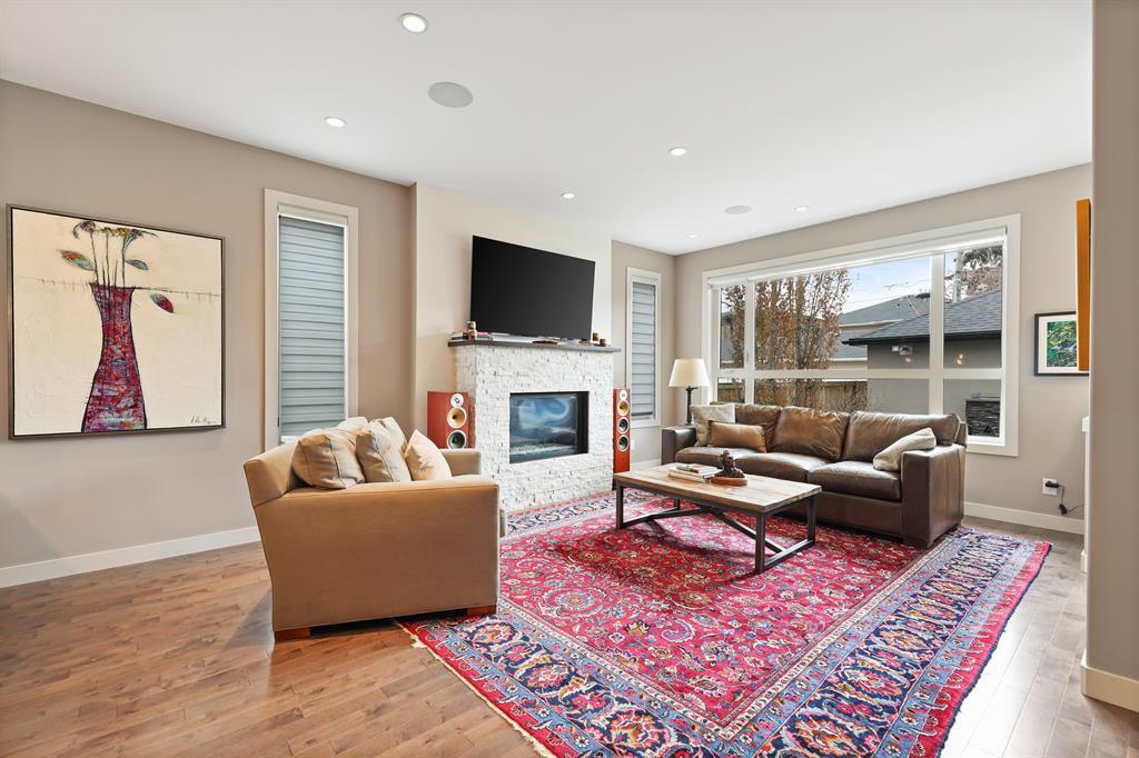 Located in Altadore, within walking distance to the shops and restaurants of Marda Loop, as well as schools, parks, and more, this beautiful home offers over 2,800 sq.ft of total living space. As you step inside, you'll immediately notice the quality construction and attention to detail throughout. The high flat ceilings, rounded drywall corners, triple hinge doors, and large industrial-sealed windows fill the home with bright natural light.The oak hardwood floors flow seamlessly from the formal dining room into the open concept kitchen. The spacious kitchen boasts Quartz countertops, a subway tile backsplash, a large pantry, ample cabinetry, and high-end appliances, including a Wolf gas/induction range, Miele dishwasher, and Dacor double refrigerator. Whether you're entertaining family and friends in the living room around the gas fireplace or taking the party outside to the outdoor patio with its own outdoor gas fireplace, this home is perfect for hosting gatherings.Make your way upstairs, illuminated by skylights, where you'll find three bedrooms and the laundry room. The master bedroom is a tranquil retreat with vaulted ceilings, large south-facing windows, and a double-sided fireplace shared with the luxurious ensuite bath, featuring a deep soaking tub and oversized shower. And let's not forget the walk-in closet, providing ample storage space.The lower level, equipped with in-floor heating and high ceilings, offers a recreation/media room with a built-in audio system and wine bar. Additionally, there is a fourth bedroom, a full bath, and plenty of storage space to accommodate all your needs. Dimmable pot lights throughout the house, central AC, high-end window coverings, including blackout blinds in the bedrooms, and a finished heated garage with metal lockers and shelving are just a few more notable features of this remarkable home. (id:22211)