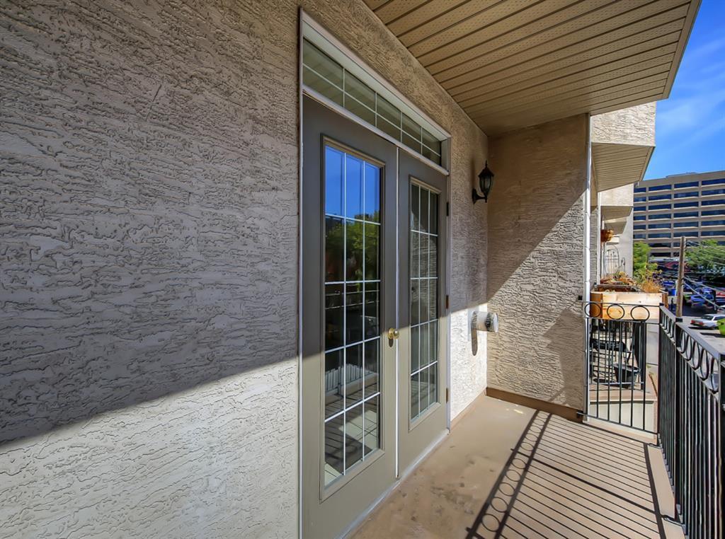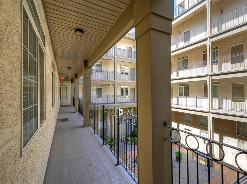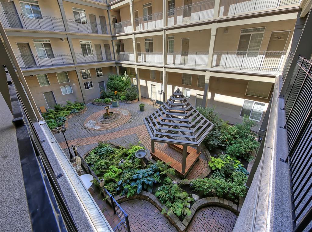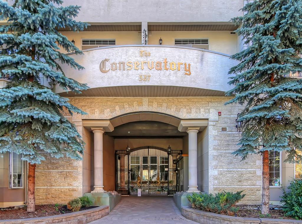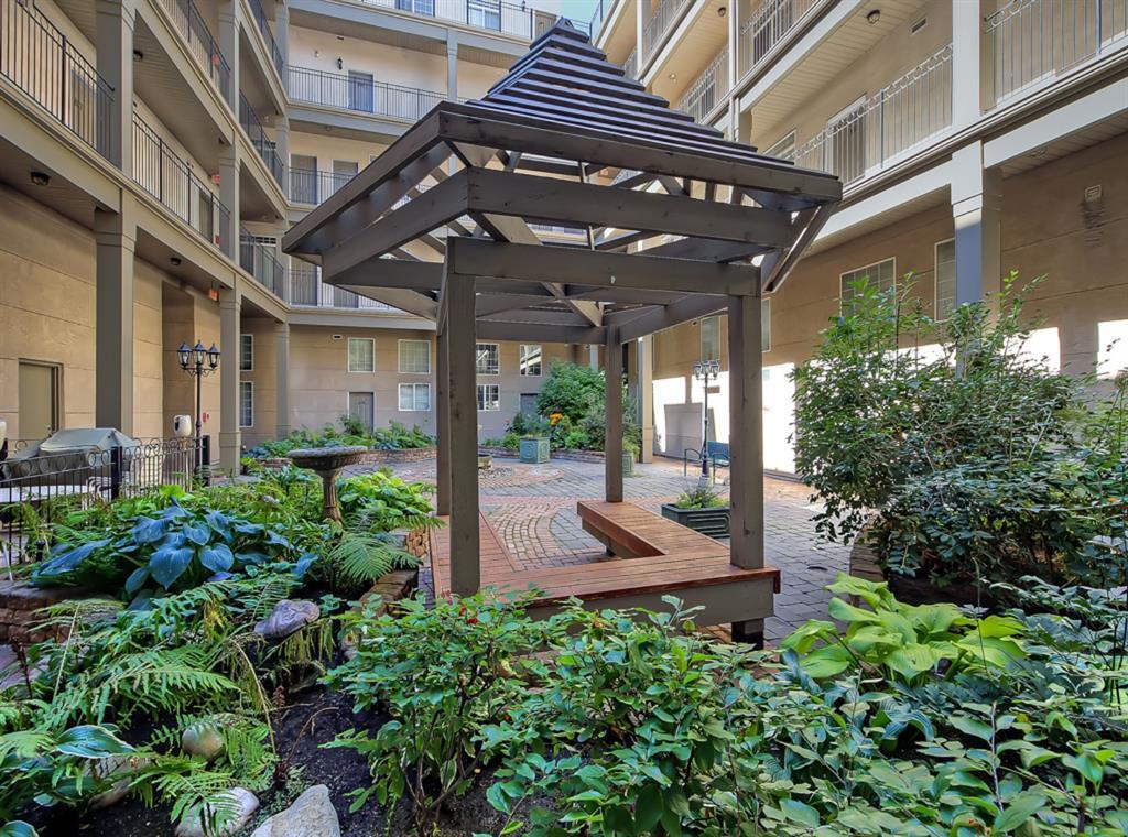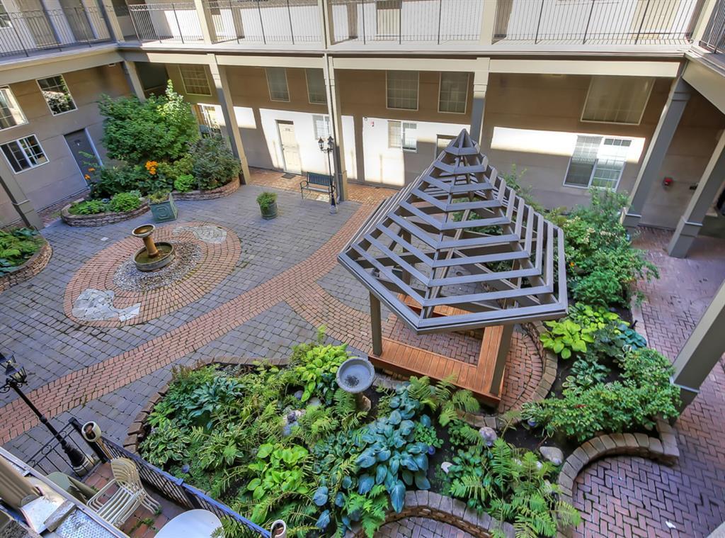 Welcome to "The Conservatory", this architecturally unique building is located in the heart of the Beltline and mere steps to all that 17 Av has to offer. The unit is a 1 bedroom plus a den, 1 bath, 613SF unit with titled underground parking, a separate storage locker, in-suite laundry and a south facing covered balcony. The open concept floorplan is excellent for entertaining with the well appointed kitchen opening up to the living/dining area as well as the balcony. The den is ideally placed away from the living space and close to the front door. The master bedroom is generously sized and provides access to the well appointed bathroom. The bathroom features a large walk-in shower and raised vessel sink. The conservatory features a stunning garden courtyard and gazebo that must be seen to be appreciated. This is a must see building and unit! (id:22211)