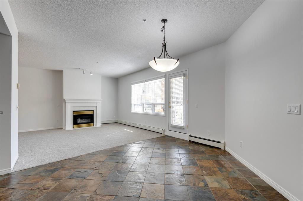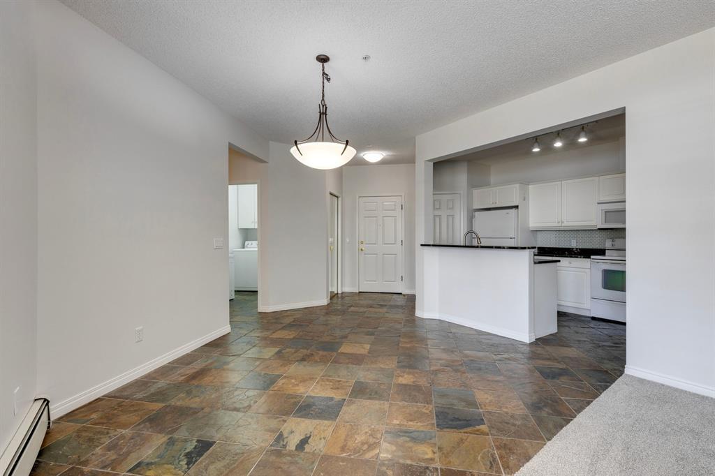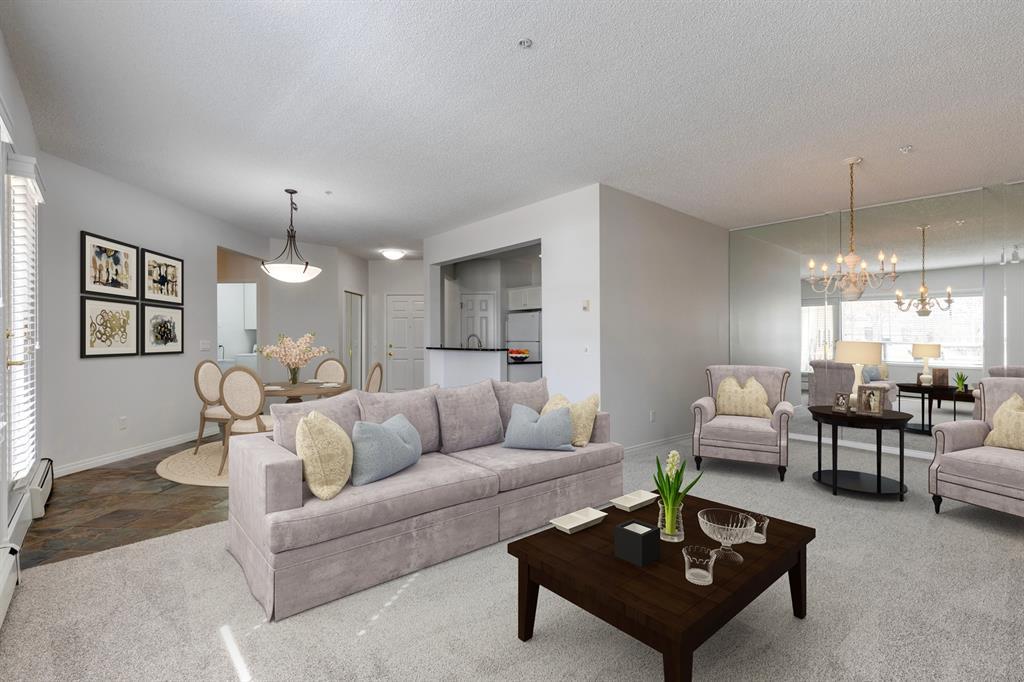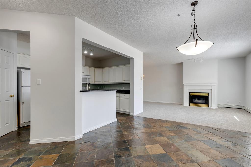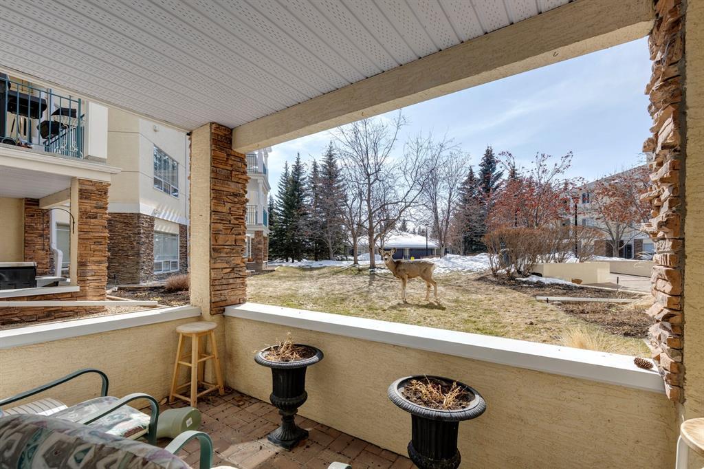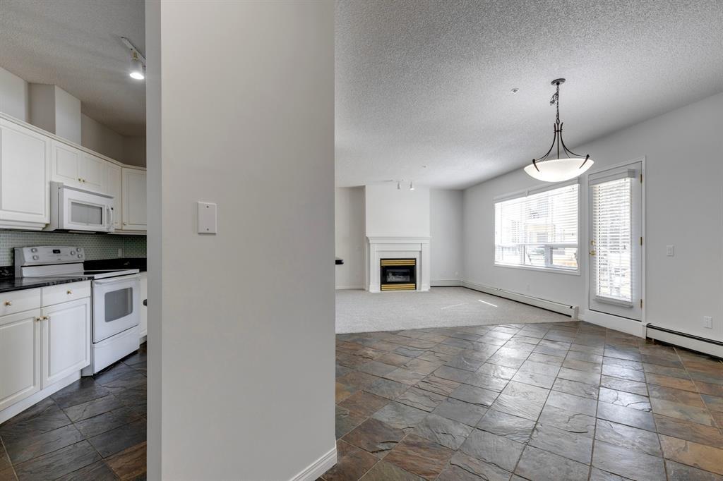 Now it's your turn to find out what all the excitement is about. There are many excellent reasons why 4 homes in The Courtyards of West Park have sold in the past couple of months! Located in the serene, prestigious enclave of Palliser, this main floor apartment, with private patio adjacent to the namesake central courtyard, is one of the largest (at 1227 sq ft) and best designs in the complex. The 2 generously sized bedrooms overlook the lushly landscaped courtyard, and feature plenty of cheerful sunlight, The primary bedroom enjoys a large walk-in closet and a 4-piece ensuite featuring a walk-in shower and large bathtub. The main bath is conveniently accessible to both the second bedroom as well as the public living spaces. The spacious laundry room with full-size side-by-side washer and dryer is tucked away out of sight but readily available as needed. The open-concept living area facilitates easy, relaxed entertaining with upgraded finishes and wide-open sight lines. A gas fireplace brings a cozy warmth to the nearly 300 sq ft living room, and note the huge windows in the living and dining rooms - making the spaces seem even larger. Even when you are the one doing the cooking, you won't be missing the festivities, since the kitchen is open to both rooms - perfect for actually getting to visit with your family and/or friends. Do take note of the finishes - slate tile floors and stone countertops in the kitchen, slate tile in the dining room, foyer and hallway, with plush carpet in the living room and bedrooms. The titled parking space is #116 - easily accessed close to the garage door, and as an end unit, only one vehicle is adjacent. The assigned storage locker (#33) is also on the parkade level. Building facilities include a Common Social Room complete with kitchen and courtyard, and a Rentable Guest Suite. NOTE: Hallway is currently scheduled to be refurbished. The Courtyards of West Park is within walking distance to South Glenmore Park and the shops at G lenmore Landing. (id:22211)