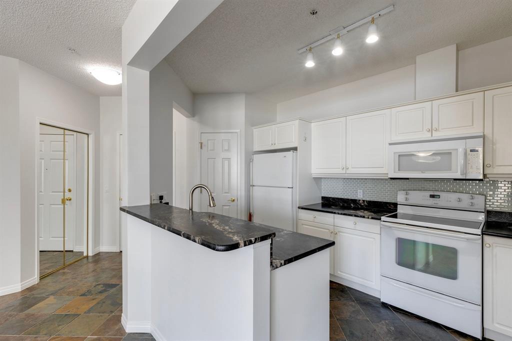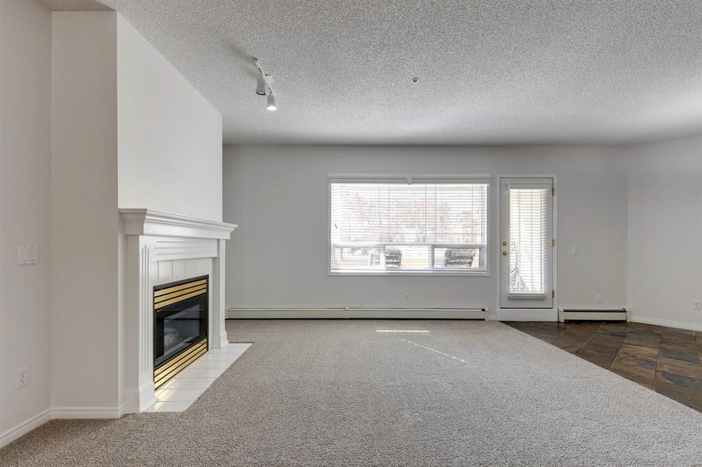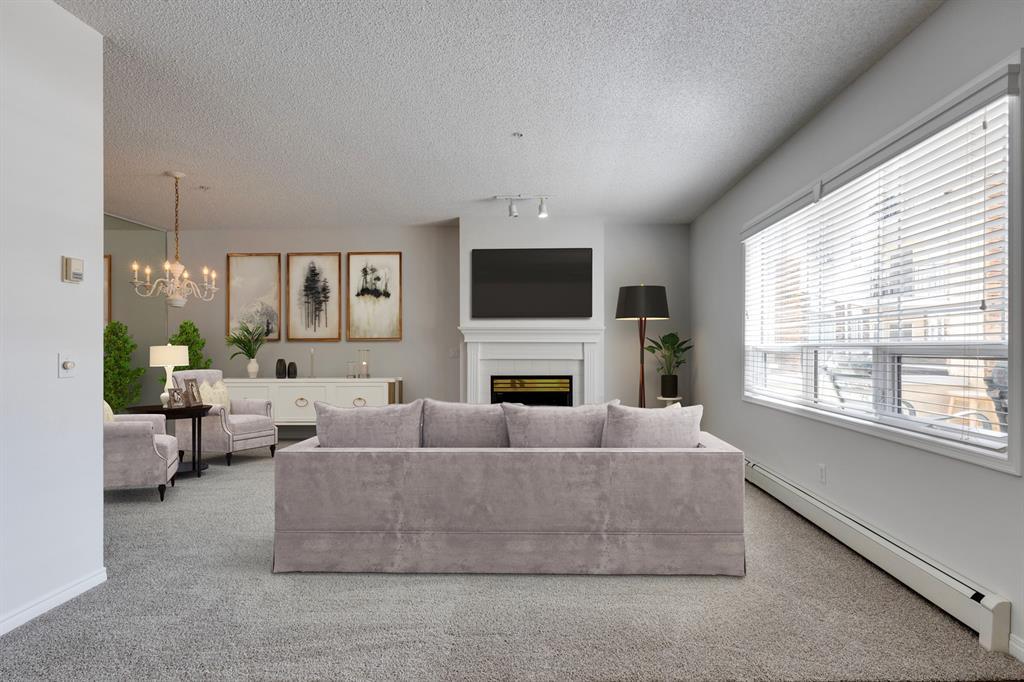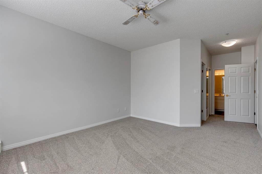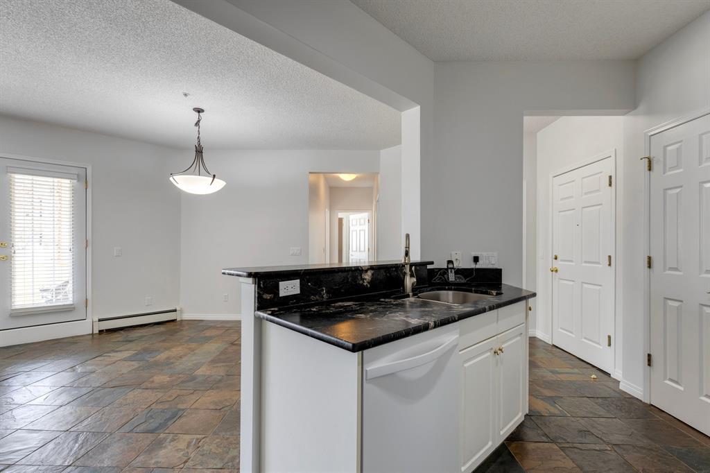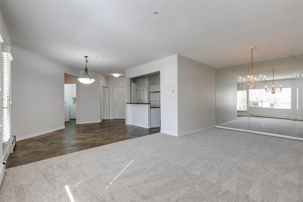 Now it's your turn to find out what all the excitement is about. There are many excellent reasons why 4 homes in The Courtyards of West Park have sold in the past couple of months! Located in the serene, prestigious enclave of Palliser, this main floor apartment, with private patio adjacent to the namesake central courtyard, is one of the largest (at 1227 sq ft) and best designs in the complex. The 2 generously sized bedrooms overlook the lushly landscaped courtyard, and feature plenty of cheerful sunlight, The primary bedroom enjoys a large walk-in closet and a 4-piece ensuite featuring a walk-in shower and large bathtub. The main bath is conveniently accessible to both the second bedroom as well as the public living spaces. The spacious laundry room with full-size side-by-side washer and dryer is tucked away out of sight but readily available as needed. The open-concept living area facilitates easy, relaxed entertaining with upgraded finishes and wide-open sight lines. A gas fireplace brings a cozy warmth to the nearly 300 sq ft living room, and note the huge windows in the living and dining rooms - making the spaces seem even larger. Even when you are the one doing the cooking, you won't be missing the festivities, since the kitchen is open to both rooms - perfect for actually getting to visit with your family and/or friends. Do take note of the finishes - slate tile floors and stone countertops in the kitchen, slate tile in the dining room, foyer and hallway, with plush carpet in the living room and bedrooms. The titled parking space is #116 - easily accessed close to the garage door, and as an end unit, only one vehicle is adjacent. The assigned storage locker (#33) is also on the parkade level. Building facilities include a Common Social Room complete with kitchen and courtyard, and a Rentable Guest Suite. NOTE: Hallway is currently scheduled to be refurbished. The Courtyards of West Park is within walking distance to South Glenmore Park and the shops at G lenmore Landing. (id:22211)