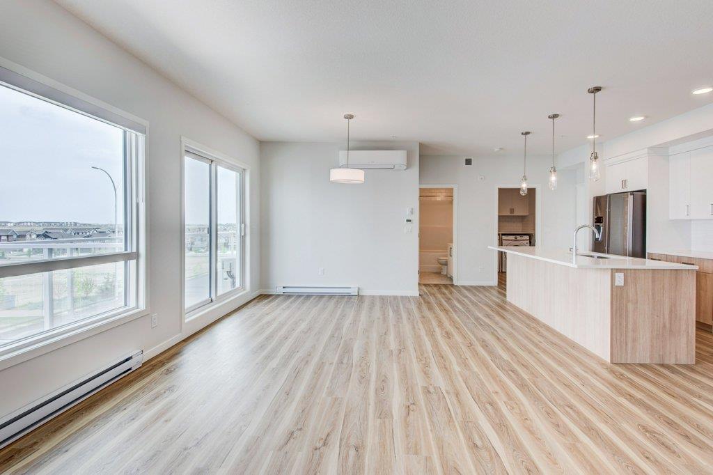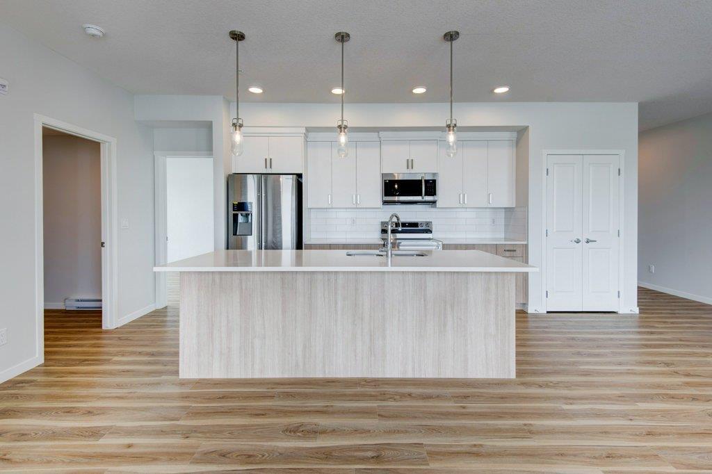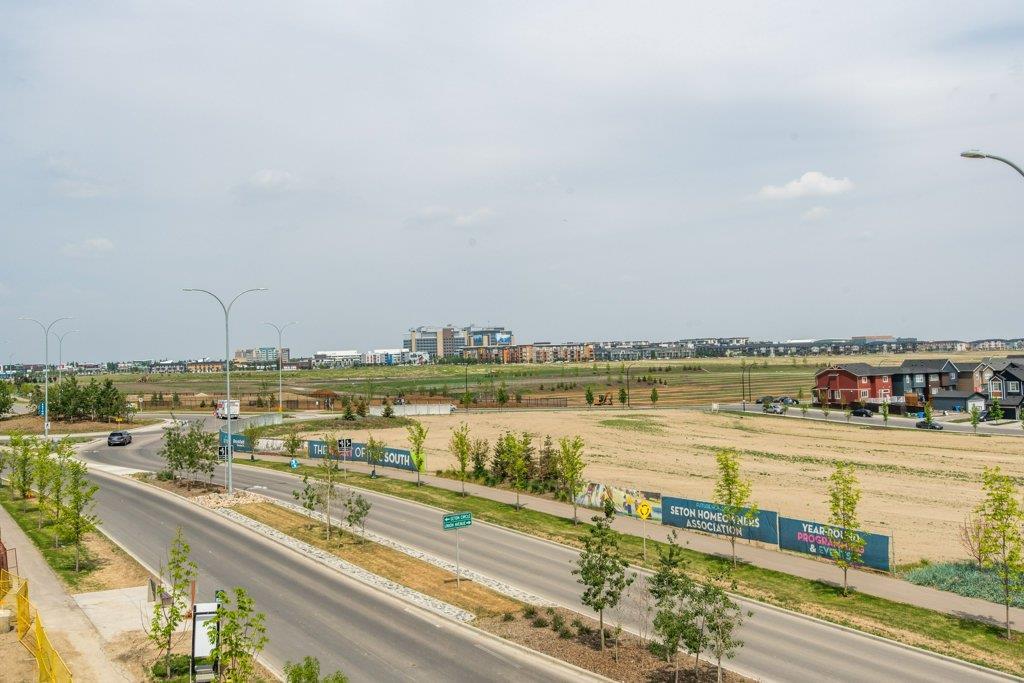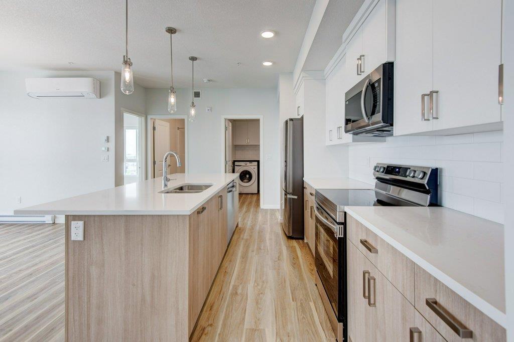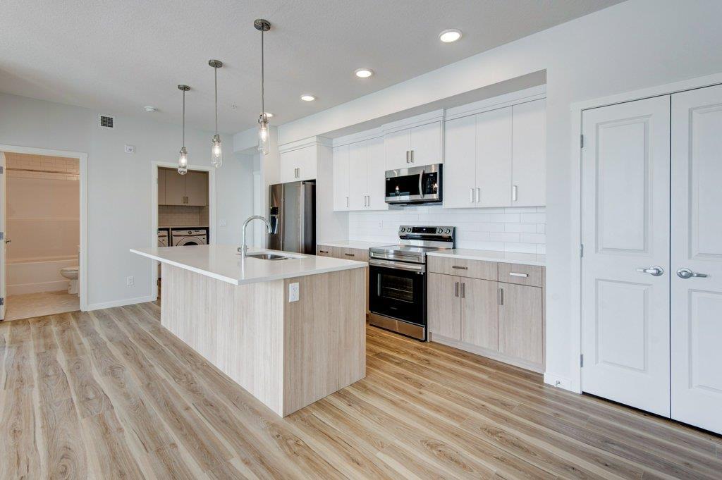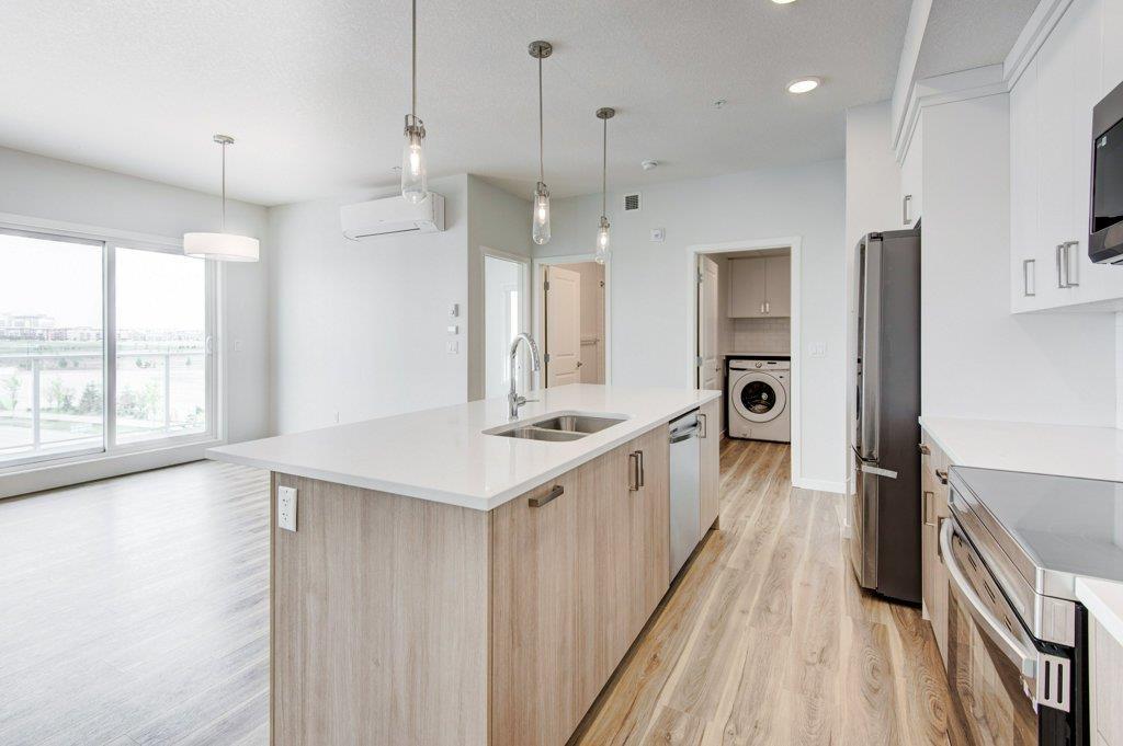 SETON SUMMIT, one of Calgary's most sought-after developments BUILT BY “BUILDER OF CHOICE” WINNER CEDARGLEN LIVING, 4 YEARS RUNNING! You’ll feel right at home in this spacious TOP FLOOR CORNER PENTHOUSE 1,052.70 RMS sq.ft. (1112 sq.ft. builder size) 2 bed, 2 bath home with open plan, 9' ceilings, knock down ceilings LVP & LVT flooring throughout the unit, and numerous upgrades (L3 PLAN). Amazing NE CORNER UNIT with wrap-around balcony and only 1 common wall. The kitchen is spectacular with two tone full height cabinets, recycle center to island, quartz counters, subway tile backsplash, undermount sink, upgraded refrigerator, and S/S appliances. The island is extensive which transitions into the spacious living area and large dining room, perfect for entertaining. The spacious primary bedroom has a large window (triple pane windows), sizeable walk-in closet (with upgraded built-ins) and plenty of space. The ensuite showcases dual vanities with a stand-up shower and upgraded full height tiles above. The additional bedroom is perfect for kids, guests, or an office. Nearby is the laundry/storage room (washer & dryer included), fully upgraded with stone counter top, tile backslash and added upper cabinets. A 4pc bath with quartz counters, full height tiles above the tub and undermount sink is also located down the hall. Highlights include: A/C (1.5 ton unit), Hardie board siding, electric baseboard heating, BBQ gas line to balcony, FRESH AIR SYSTEM (ERV) included in every unit and much more. There are many bespoke amenities outside your front door, so park the car and put on your walking shoes. The LARGEST YMCA IN THE WORLD and the SETON HOA is just around the corner. SOUTH HOSPITAL, shopping, restaurants and cafes are all just a short stroll away. Underground titled parking completes this beautiful home. Storage lockers available for purchase (limited). PET FRIENDLY COMPLEX, UNIT IS READY FOR IMMEDIATE POSSESSION, VIRTUAL TOUR AVAILABLE - MOVE ON IN TODAY! (id:22211)