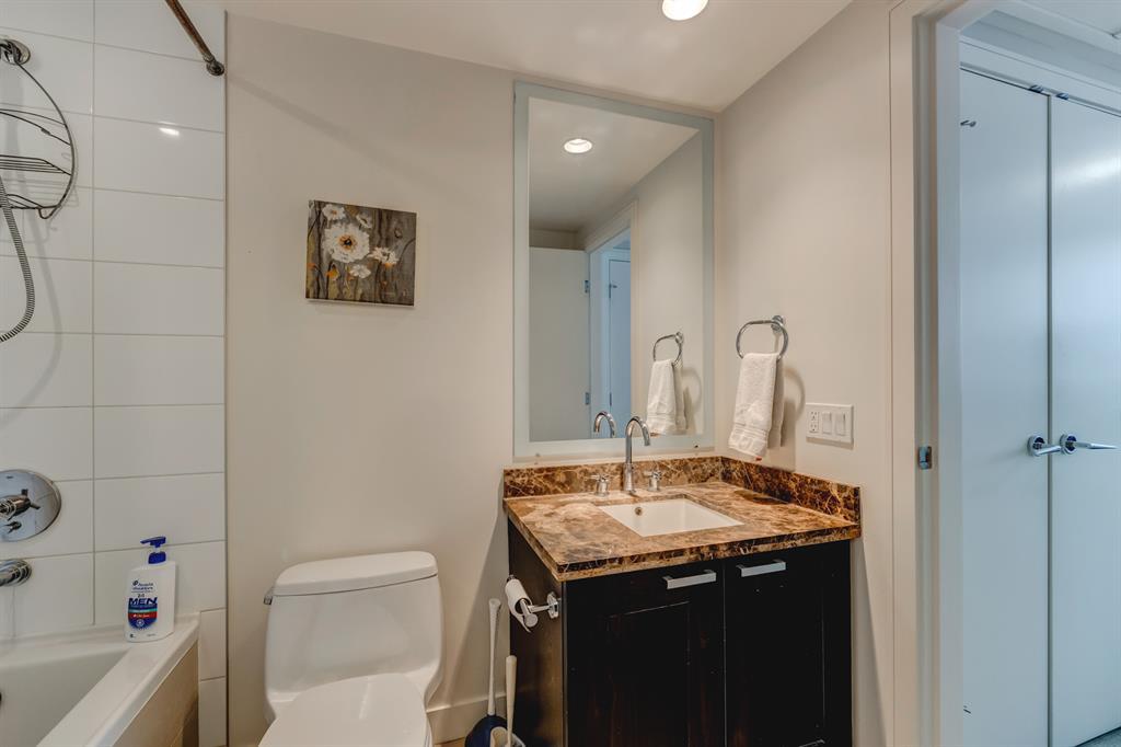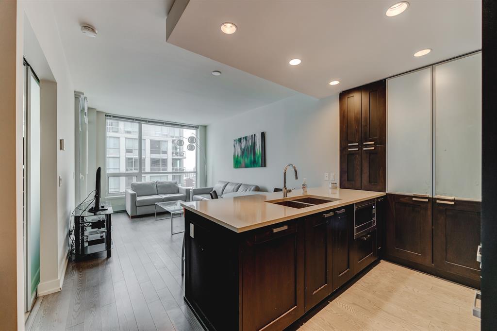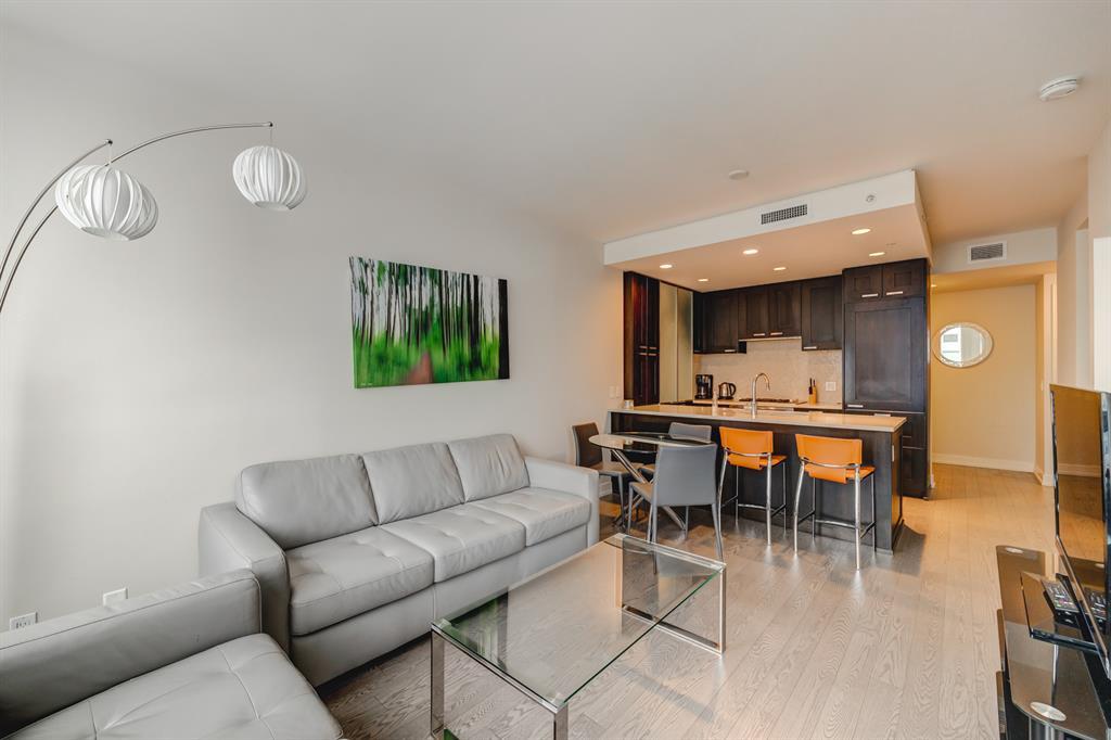 Welcome to the prestigious Waterfront condo in the heart of Downtown! This upscale complex offers over 6000 sq.ft. state of the art amenities including CONCIERGE SERVICE, FITNESS FACILITIES, INDOOR WHIRLPOOL, SAUNA, MOVIE THEATRE, PRIVATE OWNERS SOCIAL LOUNGE, OUTDOOR GARDEN PATIO, VISITOR PARKING, CAR WASH and so much more! Located along the Bow River and Princess Island Park. Walking distance to Chinatown, East Village, Eau Claire Market and amazing shops & restaurants. This charming 1 bedroom 1 bath unit located on the 19th floor features 533 sq.ft of living space, built-in computer desk, 9 ft. ceiling, hardwood floors, city and River views and a gourmet kitchen with Quartz counter-tops, full heights cabinetry, gas cook top and built-in features. A generously sized bedroom connects with a walk-thru closet and direct access to the 4 piece bathroom from the bedroom or the living room and the in-suite laundry completes this unit. Comes with 1 parking and 1 storage locker. It's perfect for families of any size or as an investment property (the last tenant was paying $2500/month fully furnished)! One other 1 bed unit available on the 21st floor as well call for more information. Book your private showing today! (id:22211)