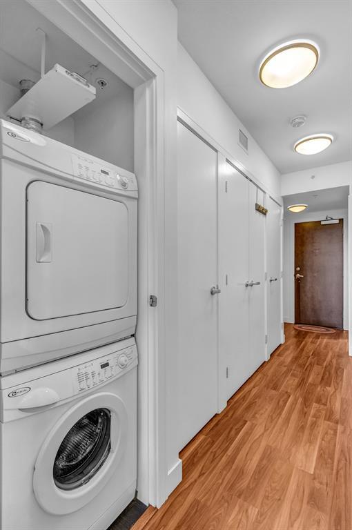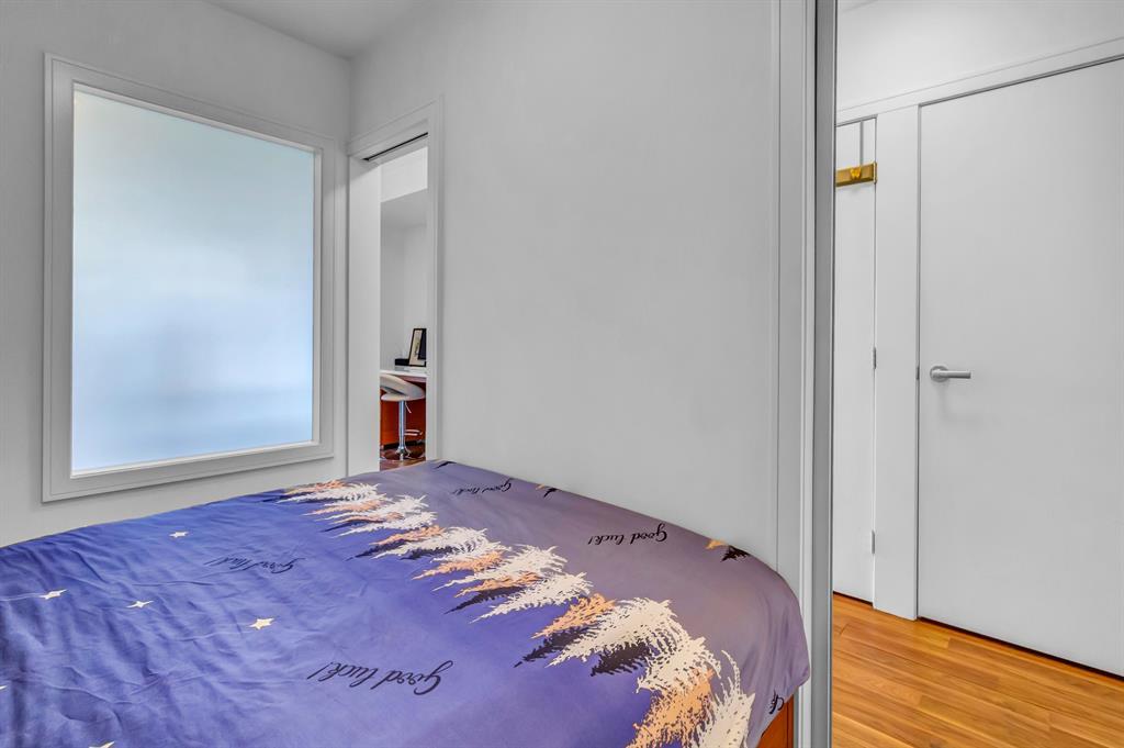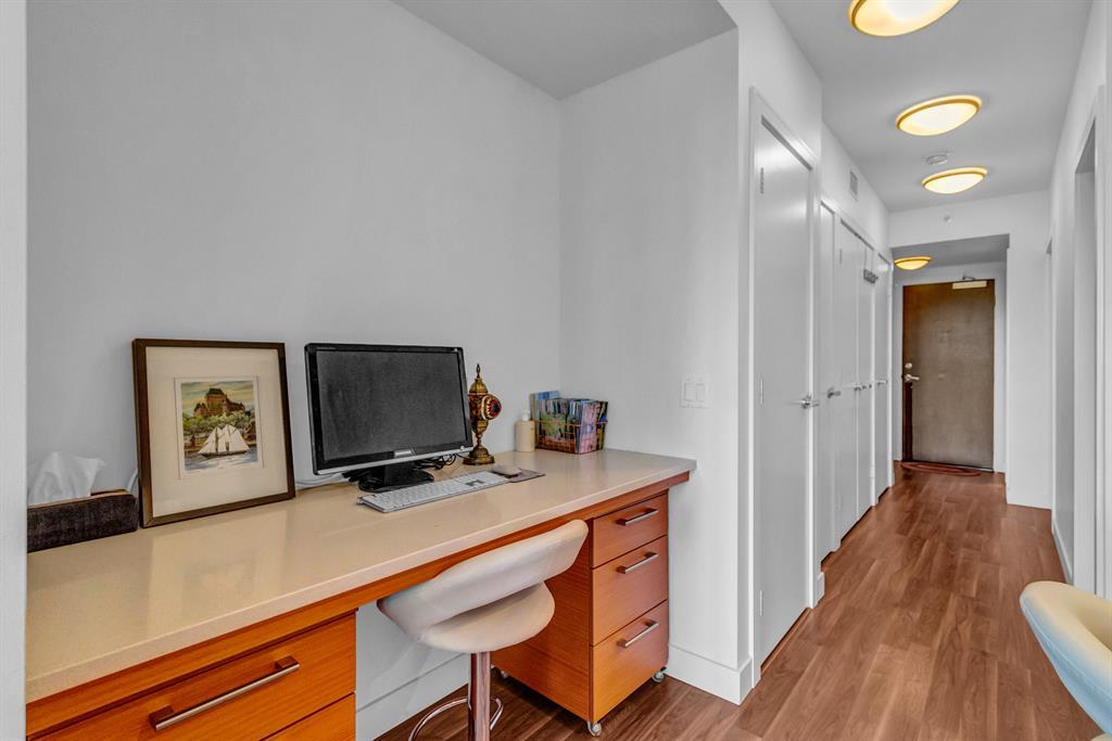Welcome to the Waterfront - a modern condo building in the heart of downtown. Enjoy inner-city living and proximity to the river, pathways, shopping, Prince's Island Park, YMCA, Eau Claire and more! This 1 bed, 1 bath unit offers a sleek open concept, living/kitchen area with large courtyard facing windows, contemporary kitchen with stainless appliances, and convenient office nook with built in desk. The bedroom provides plenty of storage space with a built in queen size bed frame with 6 pull out drawers. Extras in this unit include in-suite laundry, heated underground parking, central air conditioning, and a storage locker. The Waterfront features great amenities including a gym, indoor hot tub, steam rooms, movie theater, owners lounge/party room, car wash bays, concierge and more! This property is perfect for the first time buyer, downsizer or investor! Book a showing today! (id:22211)