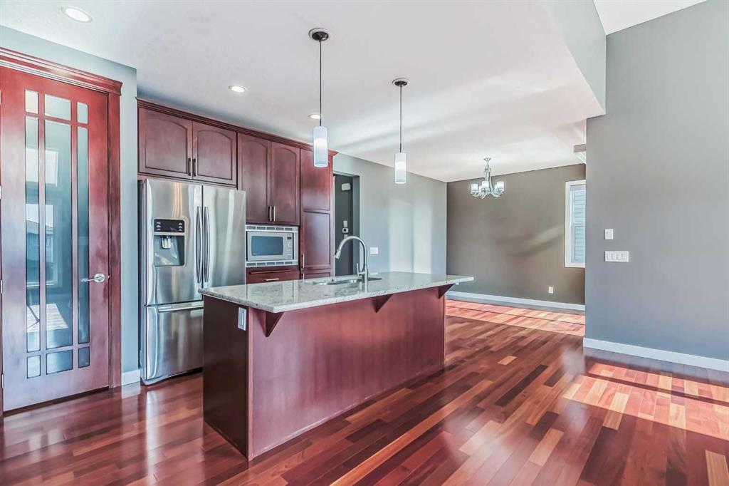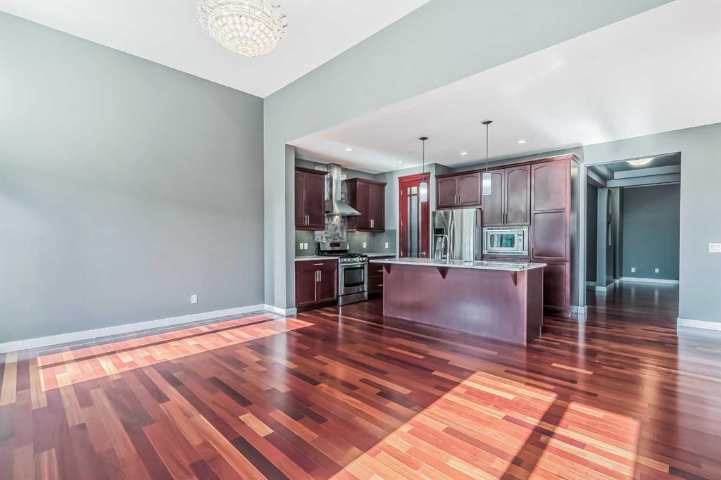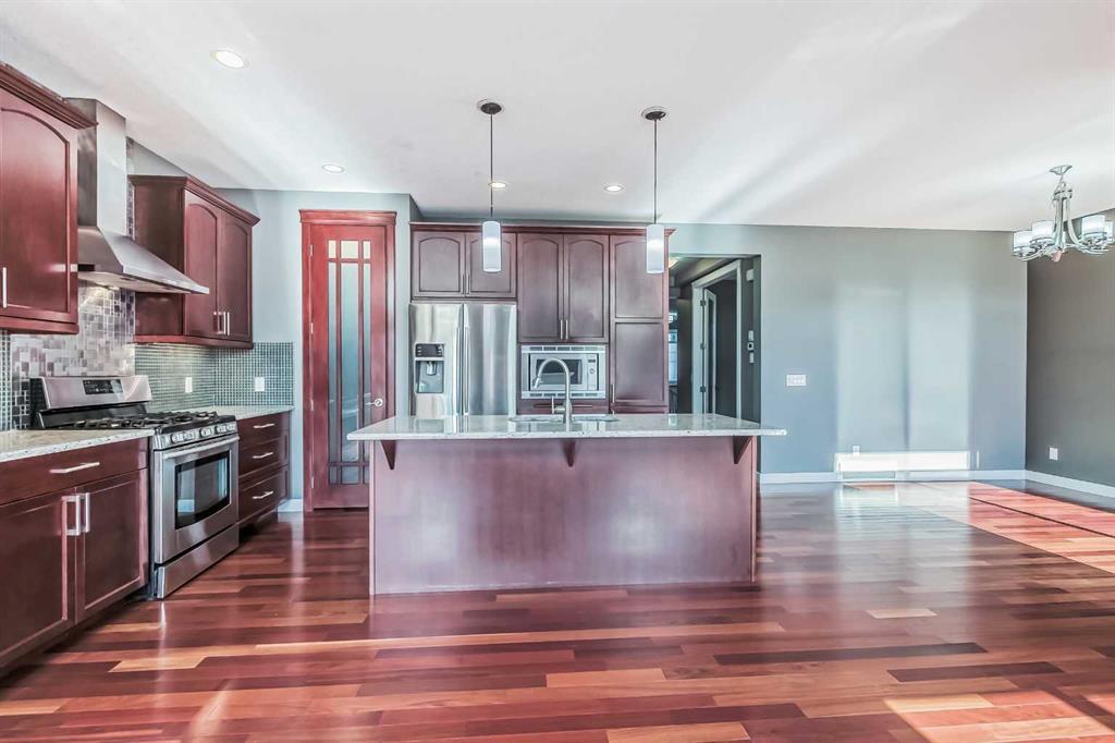 This walk-out fully finished home has it all as this house has over 3700 sq. ft of total living space. As you open door to a grand foyer, you find the main level has stunning Brazilian cherry engineered hardwood floors throughout. You walk into a chef-style kitchen with a stain-less gas range and built-in microwave oven. A large granite countertop on the island can easily have eat for 4 and a breakfast nook is just off the kitchen with a sliding patio door to a rear deck. The main level has a formal dining room and den with double French doors. A spacious family room offers a 12-foot ceiling with a gas fireplace which completes the main. The upper level has an oversized master bedroom with a walk-in closet and 5 pc ensuite, double shower stall, jetted tub, and his and hers sinks. Three additional good size bedrooms and a laundry room is on the upper level as well. There is a huge bonus room ( converted into the 5th bedroom) with big windows to allow lots of natural light. The fully finished WALKOUT basement has a 2nd family room & a Rec Room area with rough-in wet bar, 6th bedroom and full 4 pc bath, Large utility room with big storage space. Also there is a cold storage room (lower pantry). This home has central A/C, a built-in vacuum with attachments fully landscaped and fenced with a sprinkler system installed. Poured concrete walkways to the basement and a concrete patio. Excellent location with easy access to schools and major roads, transit, and shopping. Don't miss this beautiful custom home. (id:22211)