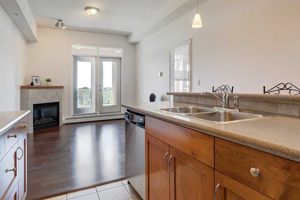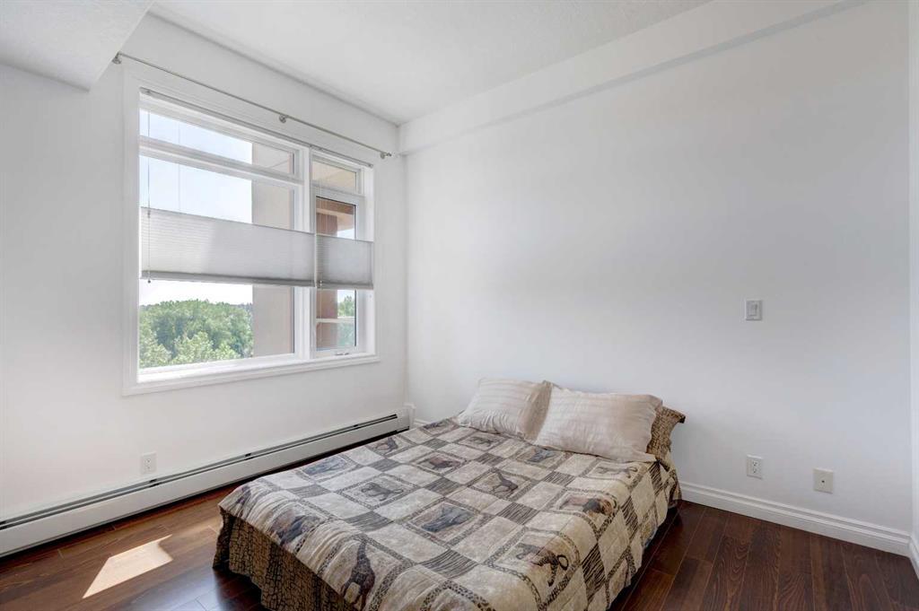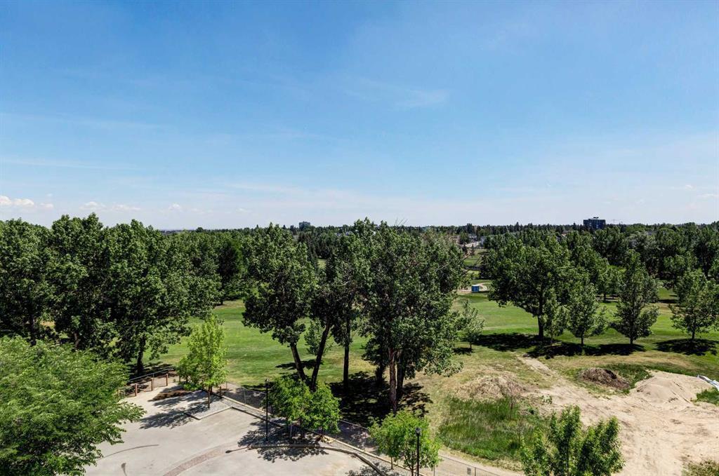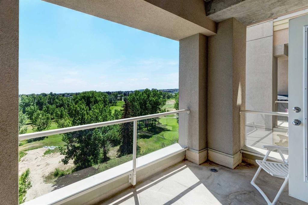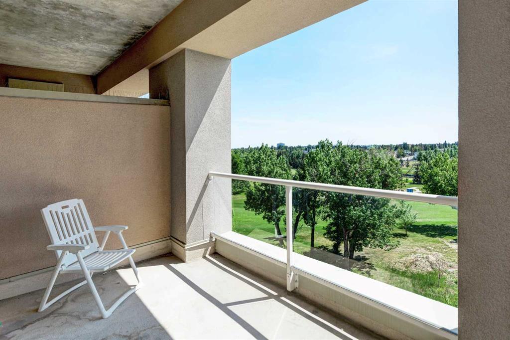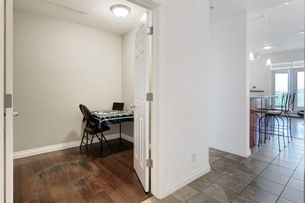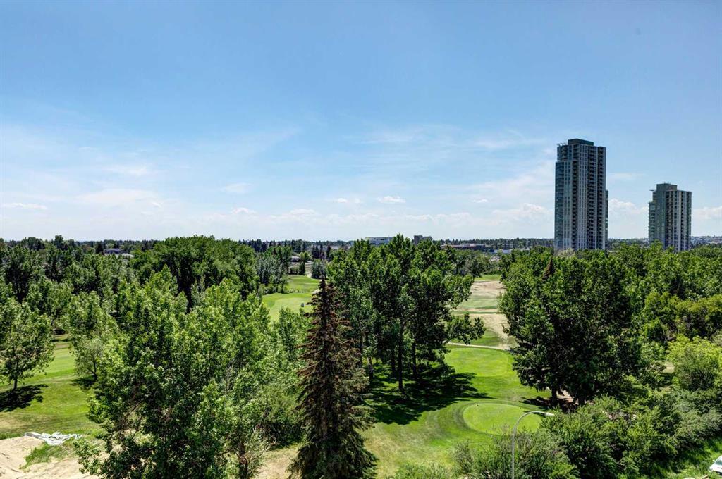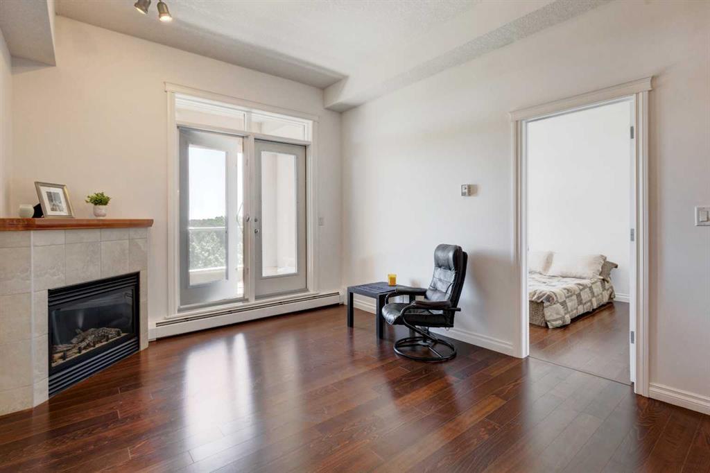 Fabulous Air Conditioned sixth floor unit with magnificent views & sunny south balcony in desirable Copperwood complex! Walk in & find a lengthy, tiled floor designated entryway with closet & room for a bench or table. Double doors encase the den perfect for a home office or flex room. Great layout offering mocha hardwood flooring & white painted walls for a nice contrast. Kitchen is excellent with central island with breakfast bar perfect for entertaining or quick meals. Dual sinks & garburator + stainless steel appliance package including space saving microwave/hood fan. Tile flooring & lots of counters & cupboards complete the kitchen. Living room is spacious & features a cozy corner fireplace. Views from the living room & bedroom are stunning! Large master bedroom with top down blinds allow the light to come in & views yet offer a sense of privacy. Double closets are very desirable. Cheater ensuite door opens to the bathroom with large vanity, soaker tub & shower combo & includes an over toilet shelving unit. Check out the laundry hatch too! Find the stacked washer/dryer enclosed in the hall. Balcony is the perfect place to enjoy summer with space for your patio furniture & a gas line for bbq. Titled parking stall is right beside the storage room which is so handy! Amazing complex includes car wash, workshop, party room & gym!! All this included in reasonable condo fees. Walk to c-train or mall. Fabulous location for this great unit. (id:22211)
