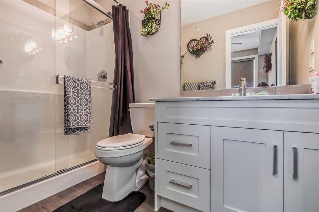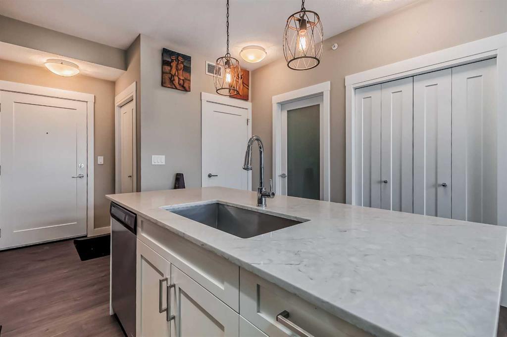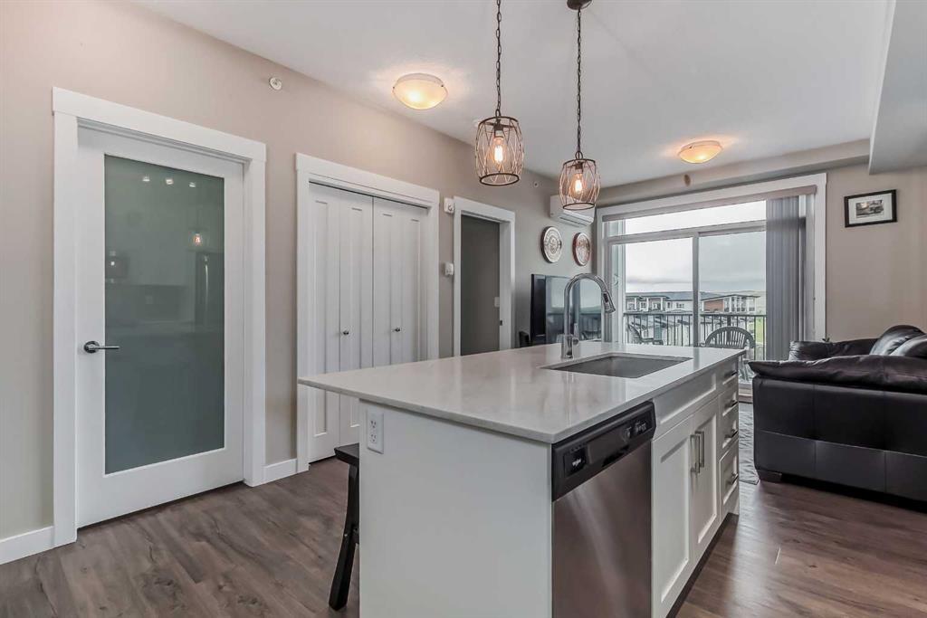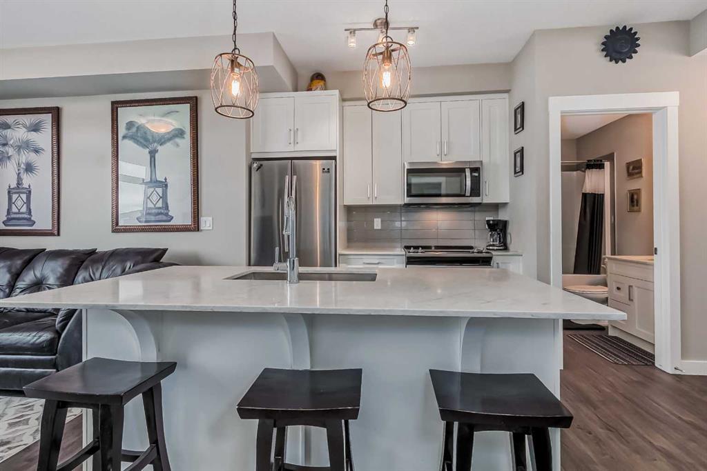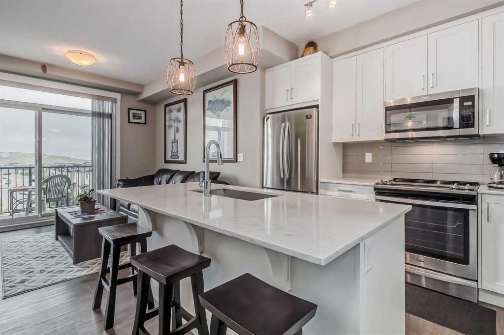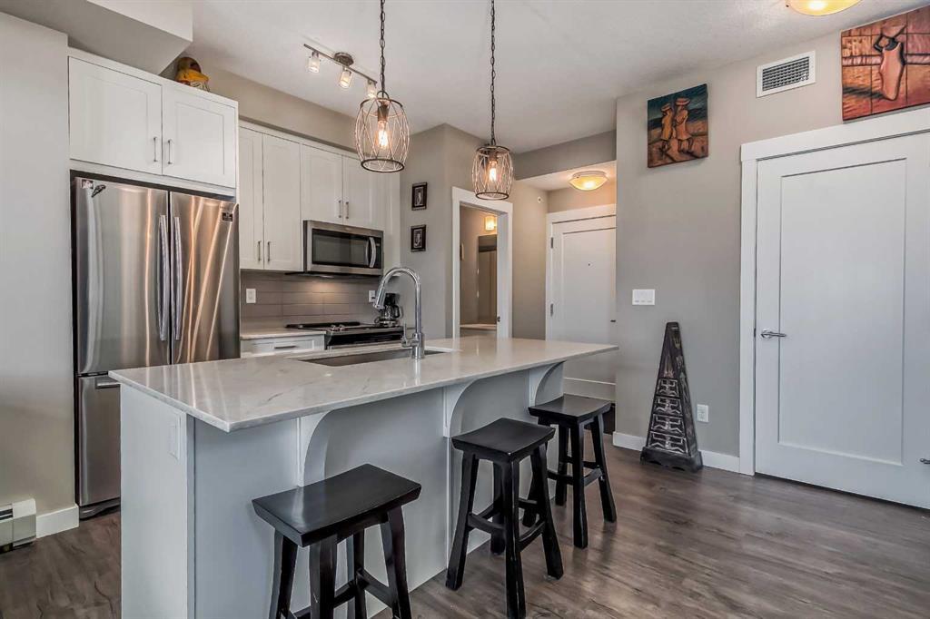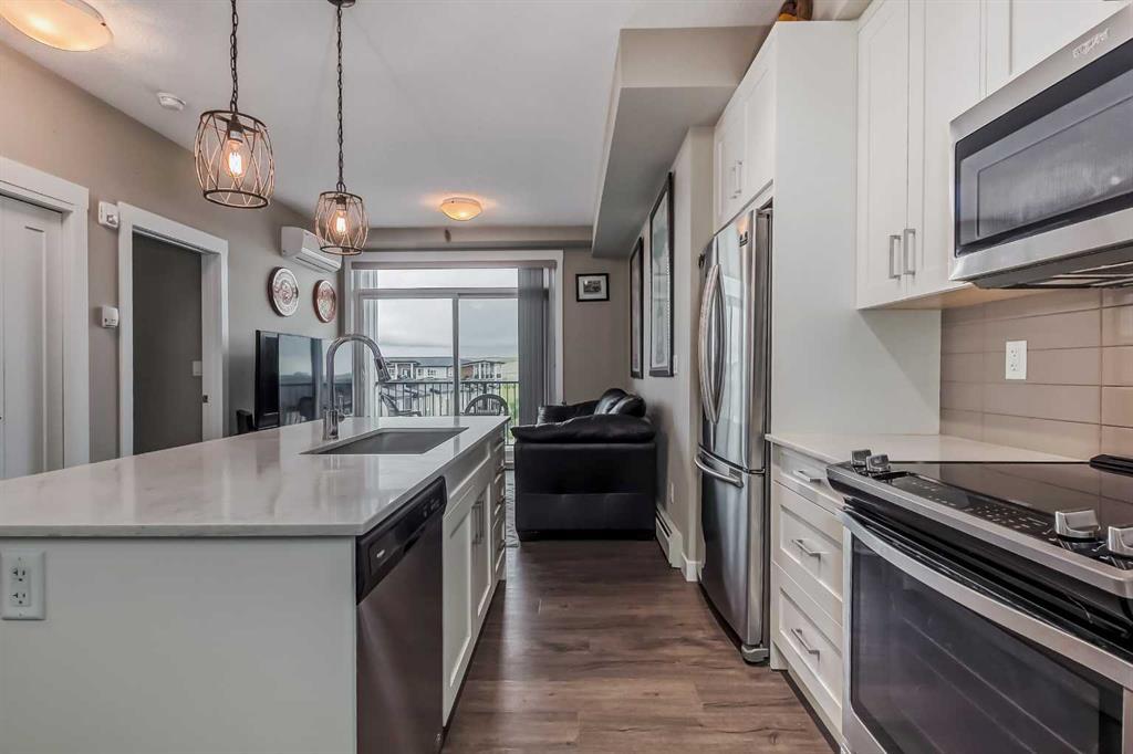 This is one of best loctions in the complex! Top Floor with Great veiws to the south & East. Featuring CENTRAL AIR two bedrooms with two bathrooms, UNDERGROUND titled parking stall, quartz counter tops throughout, pantry, upgraded stainless steel kitchen appliances which includes a built in microwave with trim kit, upgraded kitchen sink and faucet, large washer and dryer, large island with pendant lights, upgraded cabinets, ensuite bathroom, deck with roughed in gas bbq line, 9 foot ceilings, very large windows, luxury vinyl plank and tile throughout, fresh air intake, storage locker and more. This condo is moments away from community park and pathways, existing shopping and transit (more shopping and restaurants coming soon). (id:22211)