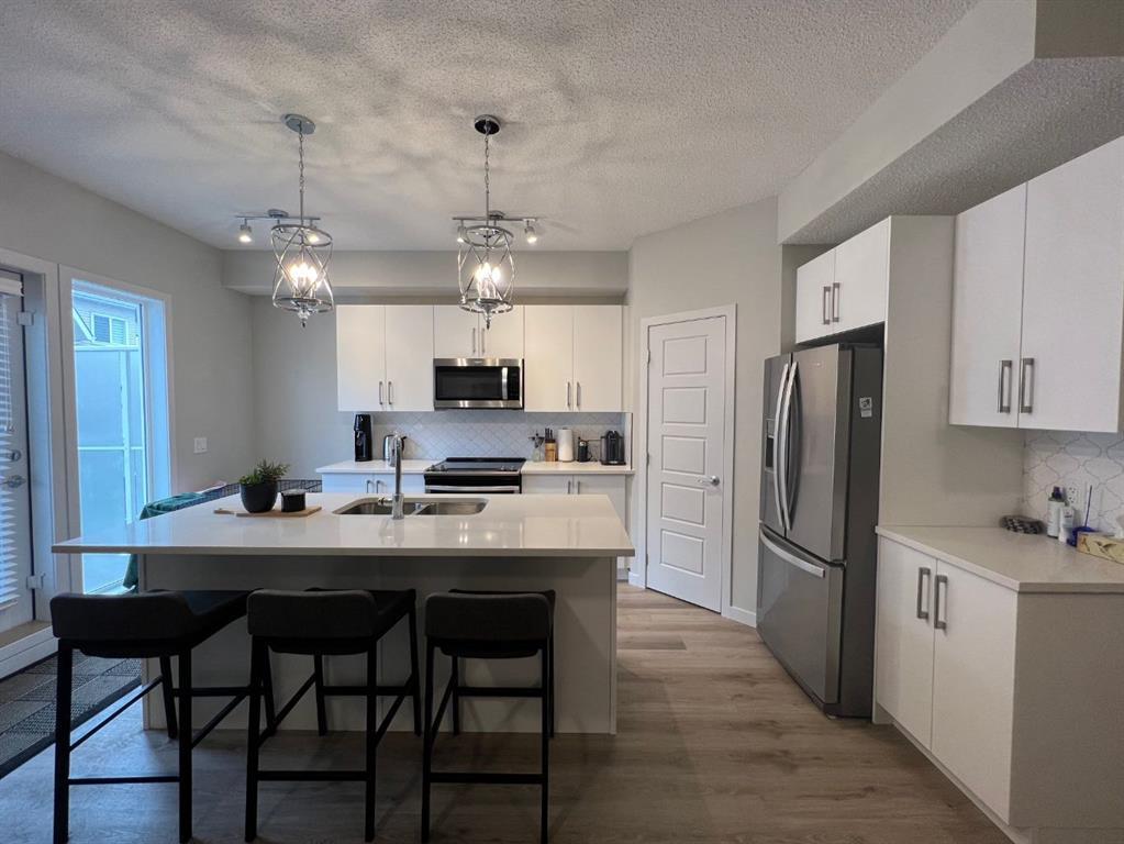 This newer 3 storey End Unit offers 2 Bedrooms, 2.5 Bathrooms and a Single Attached Garage. Main floor has an open foyer with a large coat closet and access to the single attached garage. The second floor features an open concept floor plan that boasts 9ft ceilings, upgraded luxury vinyl plank flooring, dining room, family room and spacious kitchen with a huge Quartz Island, modern cabinets and stylish backsplash, Stainless Steel Appliances and a large Walk-In Pantry. Kitchen leads on to a sunny South facing deck with natural gas hookup for those summer barbeques! The third level has a spacious primary bedroom with a walk-through closet leading to a 3-Piece Ensuite that has a huge shower and quartz counters. One additional bedroom, a 4-piece bath with soaker tub and quartz counters, linen closet and laundry closet with newer washer and dryer complete this level. Work is currently being done for greenspace siding on this end unit. Call now to view this fabulous home. (id:22211)