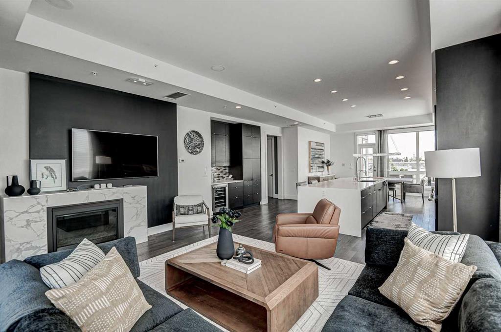 Luxurious Jayman built Penthouse in the Overture of Currie Barracks! True opulence immediately welcomes you into a stunning open floor plan with floor to ceiling windows, 180 degree views, 10 foot ceilings and over 1000 sq ft of outdoor living space. Thoughtful floorplan is built for entertaining and features a gourmet kitchen with rich dark cabinetry, 10ft waterfall island with quartz counters, a huge great room with gas fireplace, spacious dining room and entertainment bar with refreshment cooler. Outdoor living space is second to none with a large 500+ sq ft patio capturing the south sun and mountain views and another 500 sq ft patio on the north side with downtown views and a cozy gas fireplace. Both Bedrooms open up to their own terrace and offer private ensuites. The owners suite is stunning with a large walk-in closet and a ensuite that boasts a freestanding bath, a stand alone Glass shower and a large vanity with 2 sinks. Convenient powder room is tucked away near the front entry and there is full sized laundry room with sink. Quality finishing throughout with lots of extras like: Jenn Aire appliances, 2 titled underground parking stalls, private storage room, Central AC, high end ELAN system that controls all lighting and entertainment from your phone, closet organizers and Hunter Douglas blinds and custom draperies throughout. The Overture is a well managed upscale complex built in 2015 in a well-established community. Currie Barracks in Calgary is a vibrant community with a rich history. It was a former military base that has been transformed into a residential and commercial neighborhood. The community offers a mix of housing options, preserves historical buildings, and has amenities like parks and walking trails. Conveniently located with quick access to Crowchild Trail, Glenmore Trail and Mount Royal University. (id:22211)