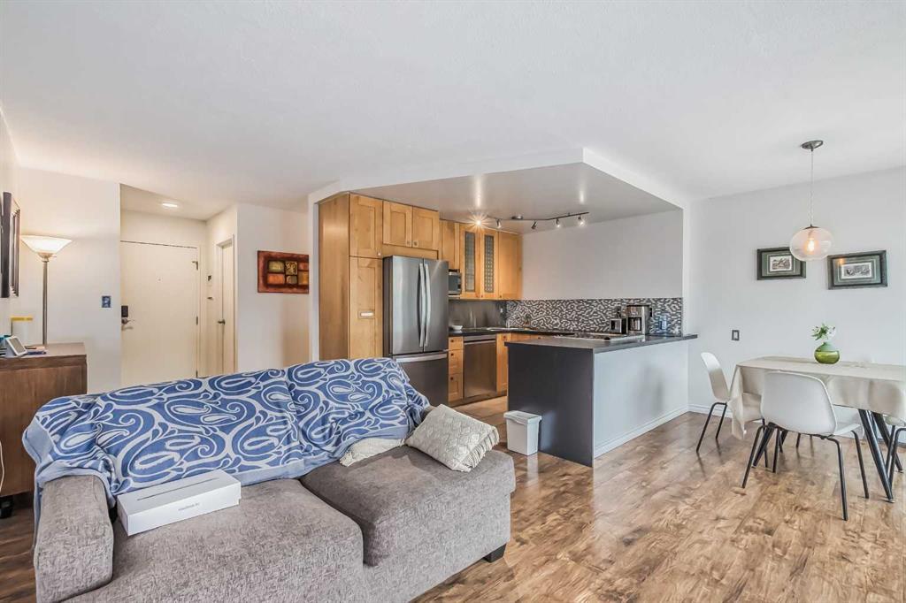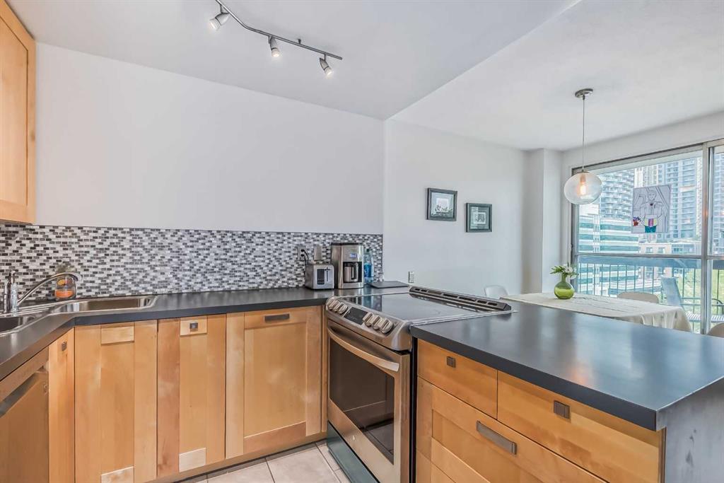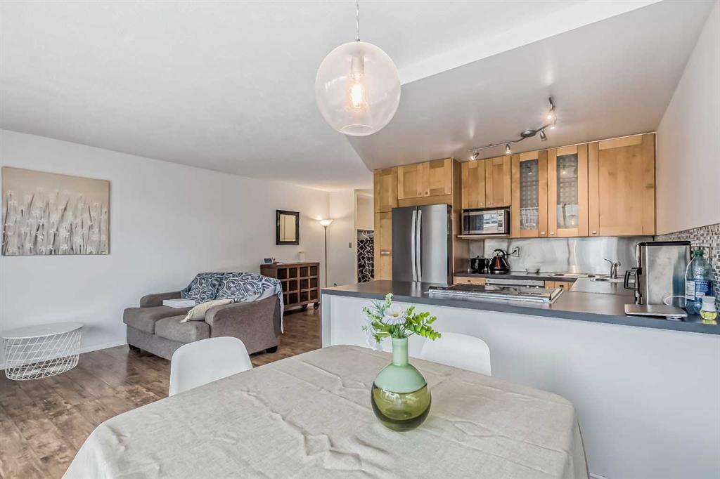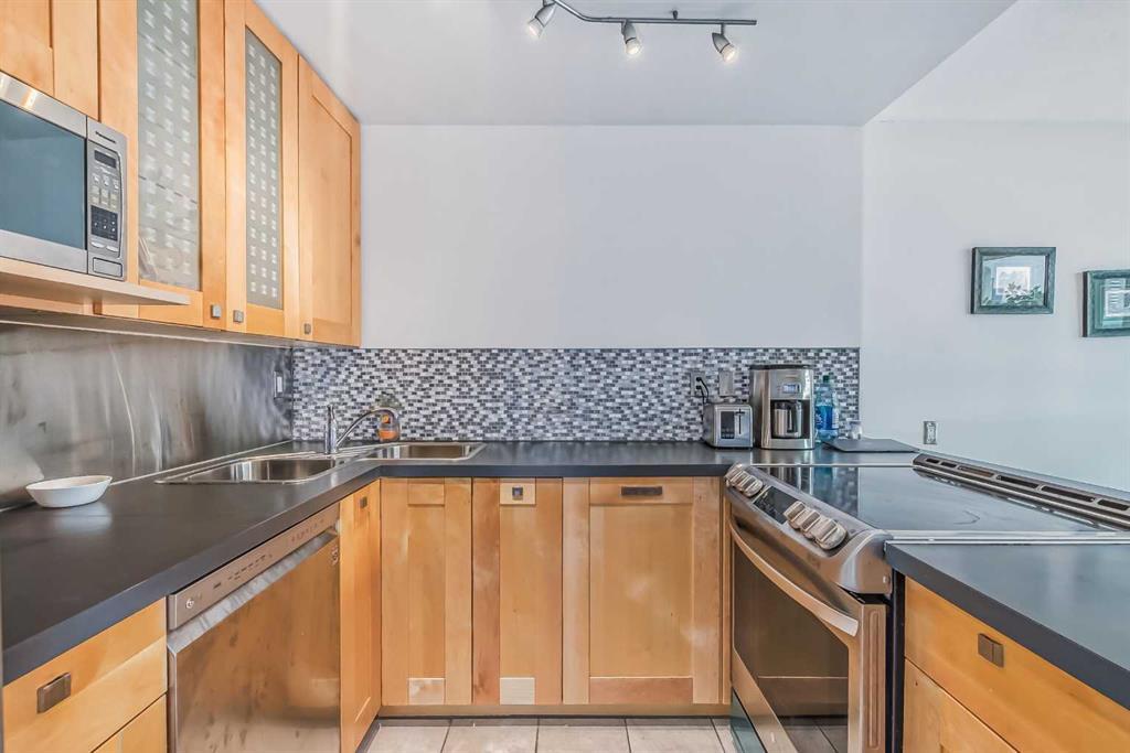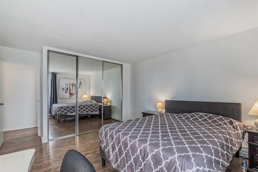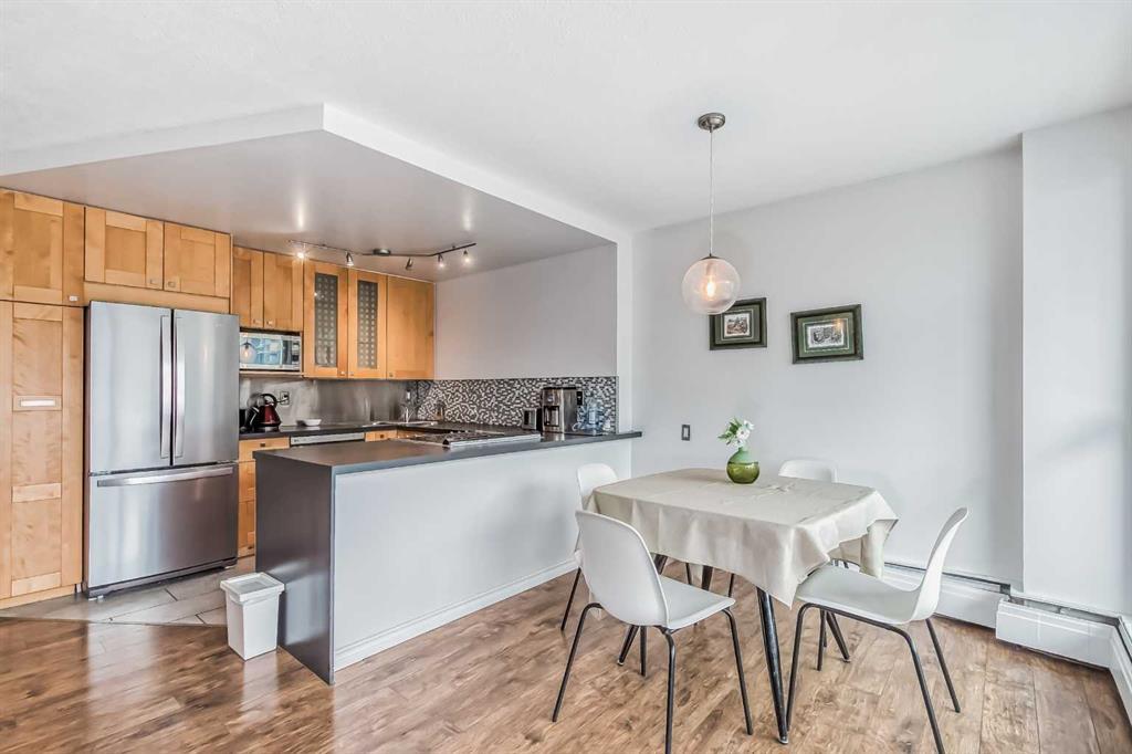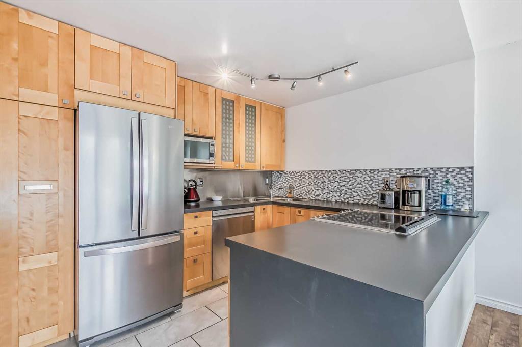 Awesome two-bedroom penthouse with amazing downtown views! This end unit has been extensively updated and looks very stylish. This spectacular penthouse is totally updated & modern, with thousands & thousands of dollars in renovations spent to create one of the most hip and stylish homes around! Featuring ceramic tile floors in the kitchen, bathroom and entrance, stylish gleaming laminate floors in the living room, hallway and bedrooms, gorgeous maple cabinets, new lighting, new baseboards moldings, new stainless steel appliances, a large balcony with an unobstructed million dollar view of downtown Calgary's skyline, in-suite storage which could easily accommodate in-suite laundry.... and the list goes on. All that in a fantastic concrete building complete with elevators, pool, exercise room, indoor parking, and only 3 blocks away from trendy 17th Ave! can go to Western Canada High School, You will love this location! Condo fees include heat, water, electricity and a parkig stall. (id:22211)