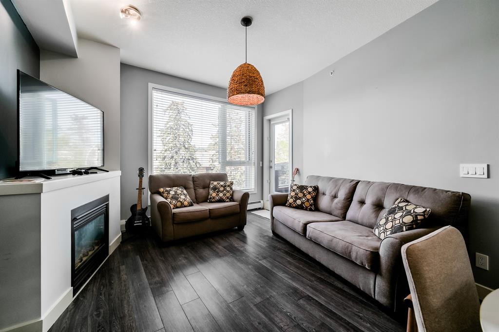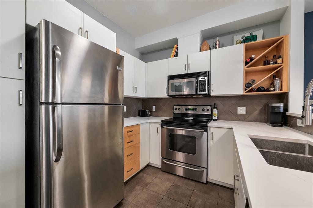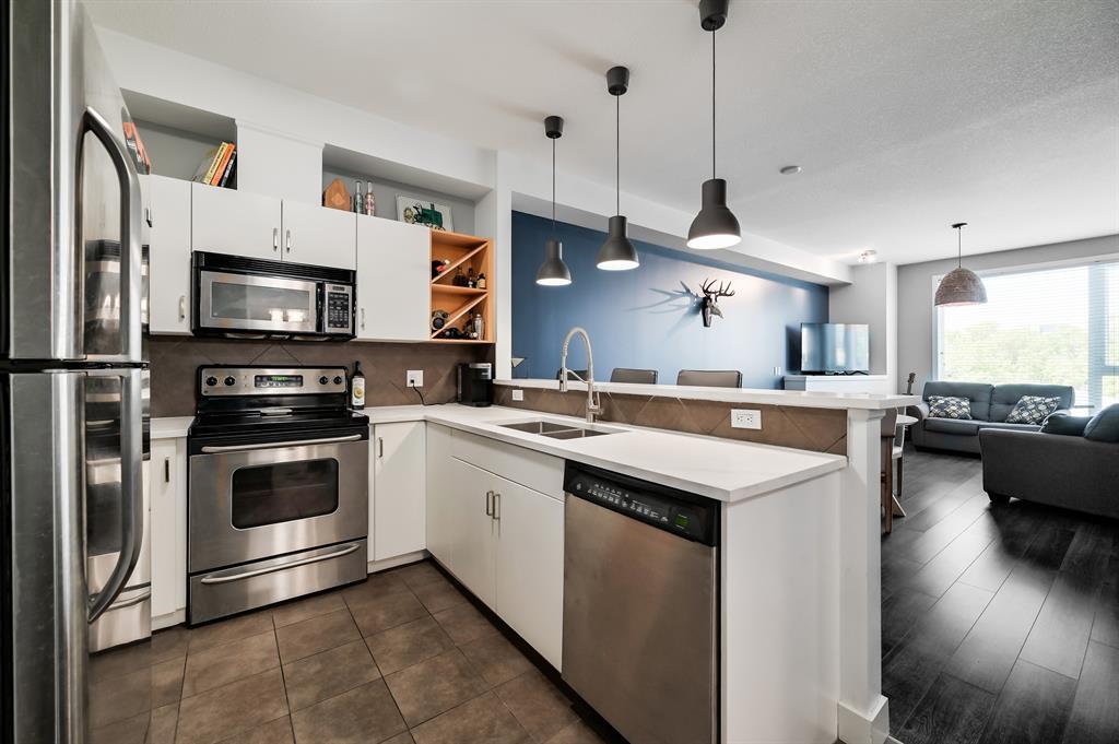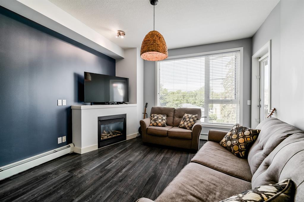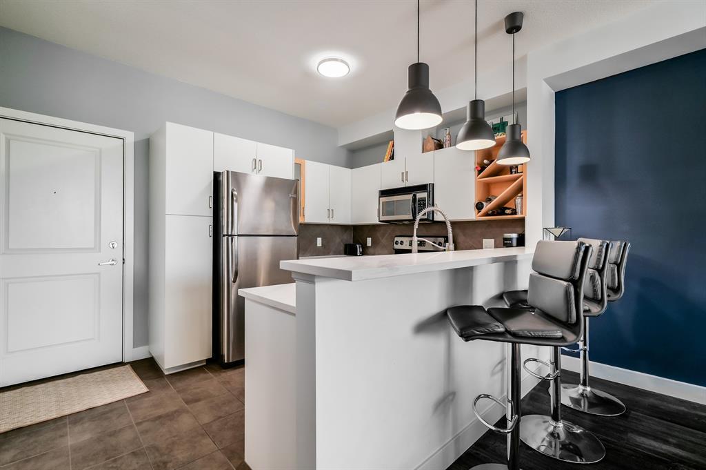 TOP FLOOR unit located in the sought after SW community of Altadore. This bright one bedroom, one bathroom condo apartment offers an open concept floorplan with a modern design. Upon entering the unit you are immediately greeted by the spacious kitchen featuring brand new quartz countertops, stainless steel appliances, over the range microwave hood-fan combo and an island with breakfast bar. Next to the kitchen is the dining area and a separate built-in desk. Cozy up in the living room next to the gas fireplace or head out the door to your west facing private balcony to wind down the day. The large window in the living room allows for a ton of natural light. The nice size bedroom, 4-piece ensuite bathroom and in-suite laundry round off this fabulous home at the trendy Kabo. This 3-storey securecondo building is well maintained and is within walking distance to restaurants, cafes, shopping, parks and pathways. Underground parking, separate storage and designated bike area. Close to transit and easy access to downtown. Don’t miss out. Call today for more information or to schedule a private viewing. (id:22211)