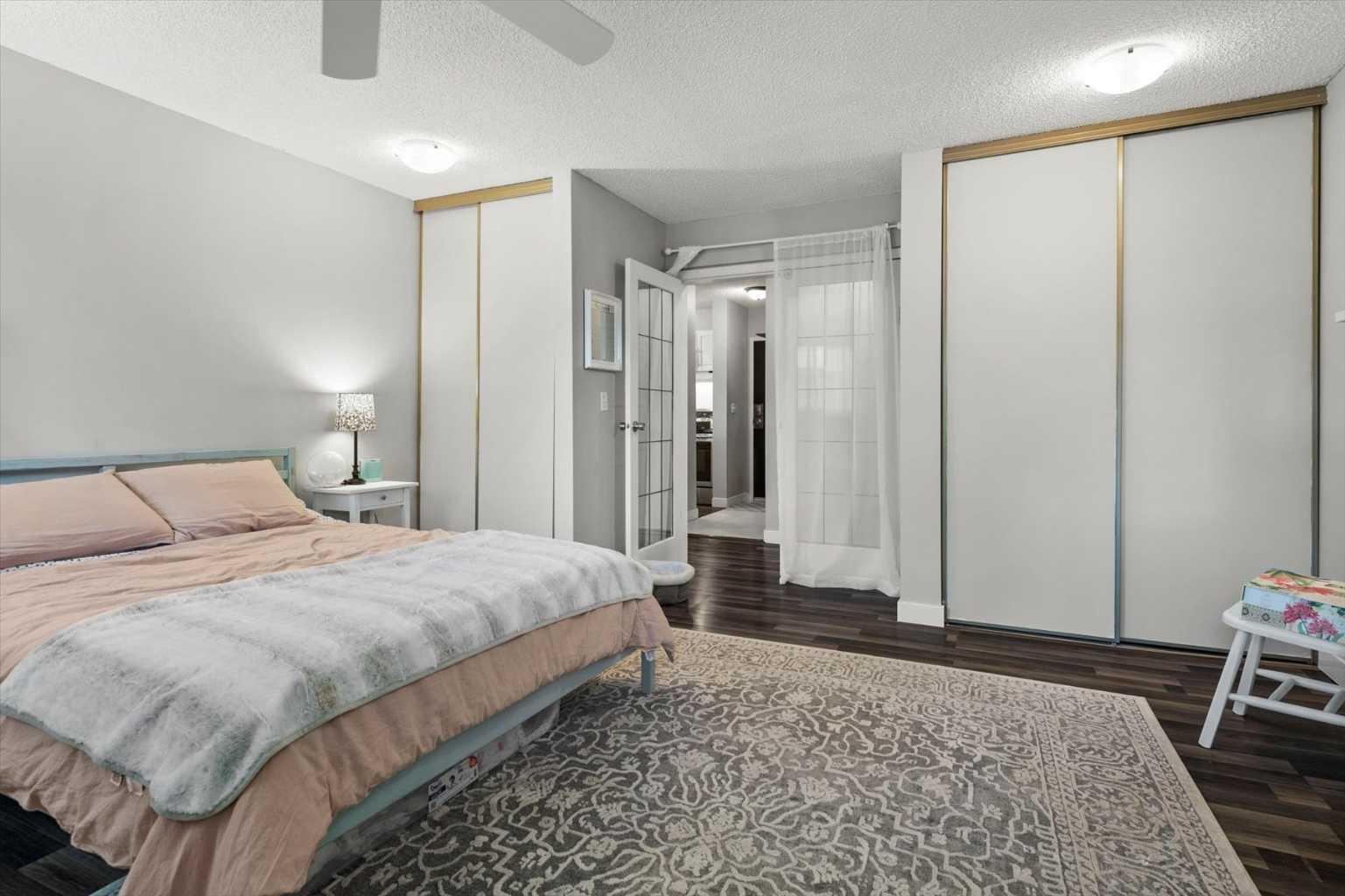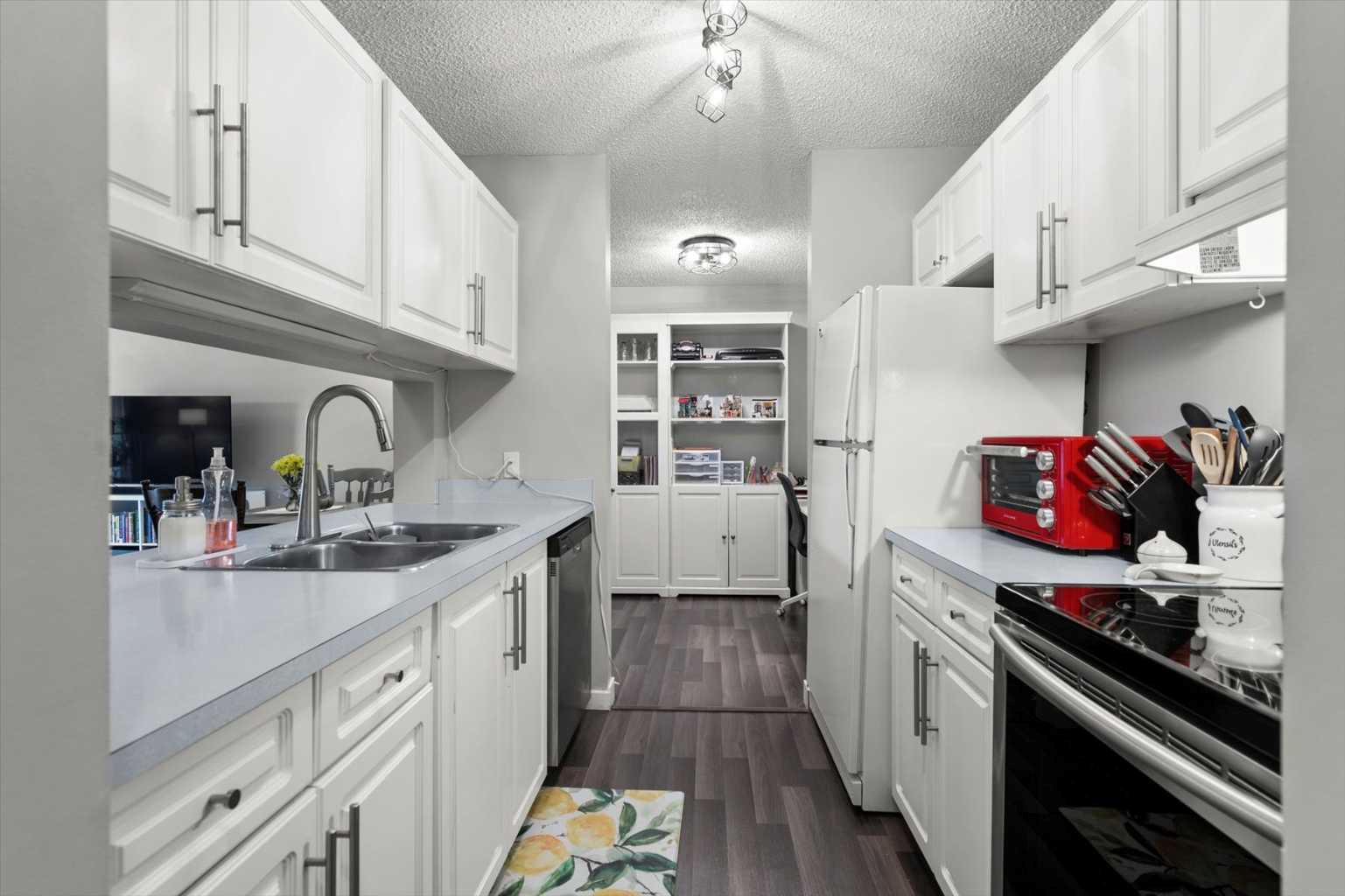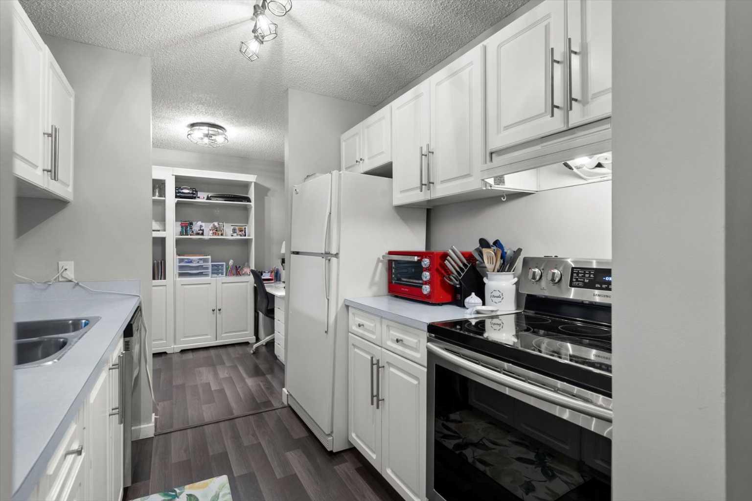 Welcome to this beautifully updated top-floor unit in the sought-after community of Patterson! Ideally perched at the top of Patterson Hill, this home offers unmatched convenience, just minutes to downtown, steps to transit, and with easy access to the mountains, Bow Trail, West Springs shopping, and nearby parks and walking paths. With updated flooring throughout, this move-in-ready condo is perfect for first-time buyers, as our client has enjoyed, or for investors seeking a reliable addition to their portfolio. As you enter, you're welcomed by an abundance of natural light from the southwest-facing exposure. To your right, the kitchen features timeless white cabinetry, updated appliances, and thoughtful finishes. A large pantry with wire shelving and additional storage, along with in-suite laundry, adds everyday functionality. Just beyond the kitchen, a versatile den serves perfectly as a home office or as an extension of the living space. The open-concept living room is centered around a cozy wood-burning fireplace, while sliding patio doors invite even more natural light and lead to your private balcony- deal for relaxing or summer BBQs. The primary bedroom is a true standout in the complex, offering exceptional size, ample closet space, and direct access to a well-appointed 4-piece bathroom. Its generous proportions and thoughtful layout make it a rare find. Whether you're strolling nearby walking paths, or commuting downtown, this location effortlessly combines urban access with peaceful surroundings.