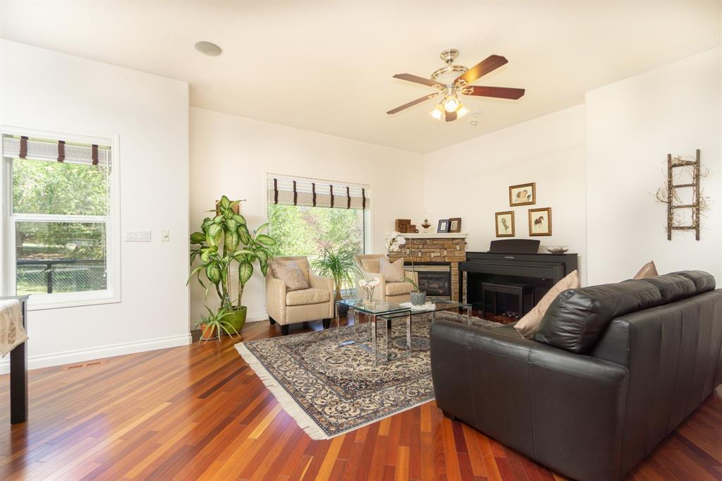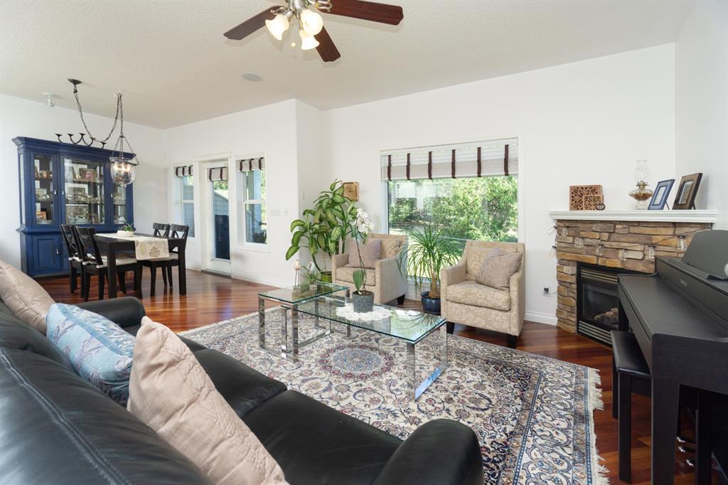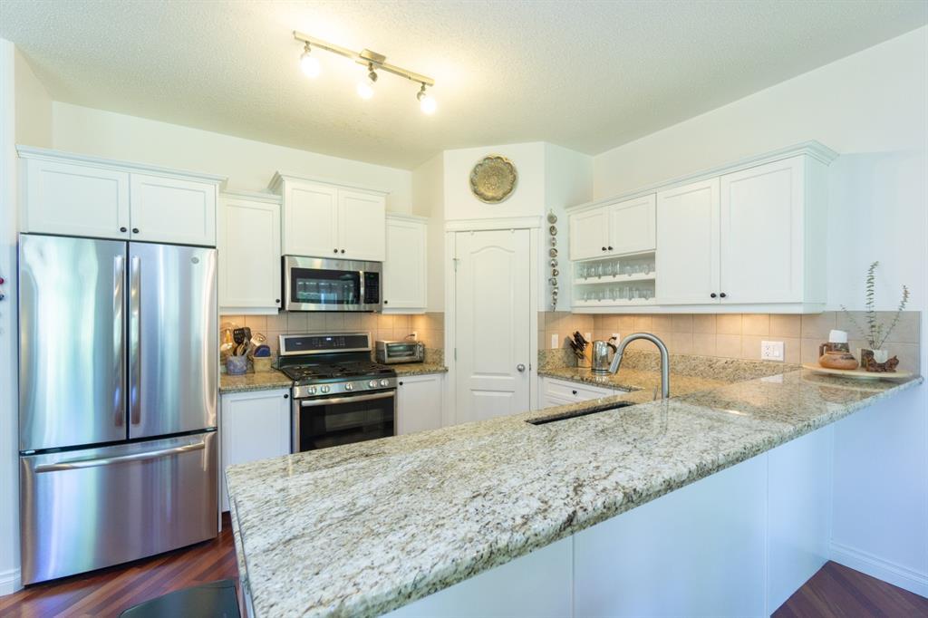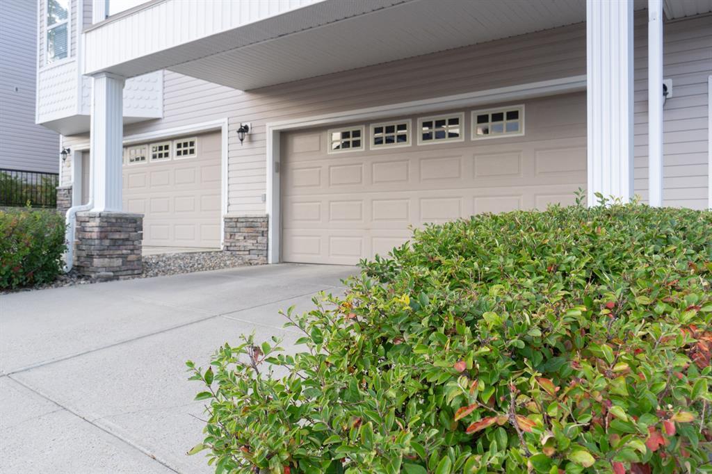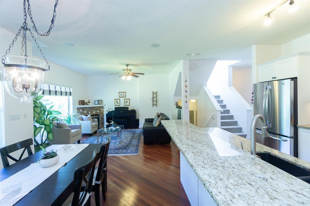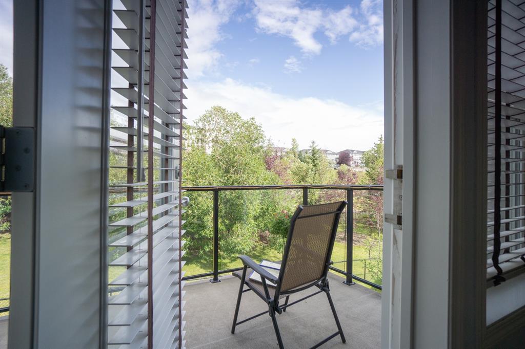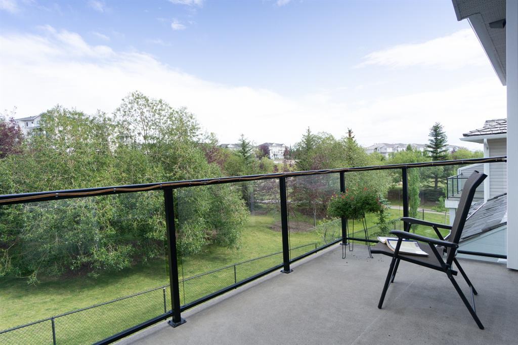 This beautiful and stylish two-storey townhouse enjoys a wonderful location, backing onto a quiet, treed green-space. You will love the bright and open layout with nine-foot ceilings and gorgeous cherry hardwood floors. The large kitchen, with its granite counter-tops & new stainless-steel appliances, along with a spacious dining area, make this a perfect home for entertaining. The corner fireplace warms up the comfortable living room and the garden door in the dining area open to the deck, overlooking the ponds and green space. A half-bath and den make up the remainder of the main floor. Upstairs you will find two master bedrooms with vaulted ceilings, walk-in closets and full ensuite baths. Each bedroom also enjoys its own private balcony for you to relax and take in the views. Completing this level is the handy laundry area with new Bosch washer and dryer. The fully developed basement offers another bedroom and a three-piece bath, along with a spacious family room. This level walks out to the attached double garage from a convenient mudroom. Other thoughtful features of this home include built-in sound system, four ceiling fans, custom blinds, new carpet and fresh paint. Outside, you can enjoy strolling or cycling the paved paths, a game of tennis or some beach volleyball. The Rocky Ridge Brownstones enjoy the amenities of The Lakes at Rocky Ridge, which include a gym, theatre, activity room, and library. The LRT station is a just 7-minute walk, and there is quick access to shopping, restaurants, and the Rocky Ridge Leisure Centre. Nothing to do but move in and enjoy this beautiful home and the surrounding amenities. (id:22211)