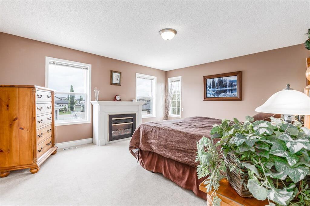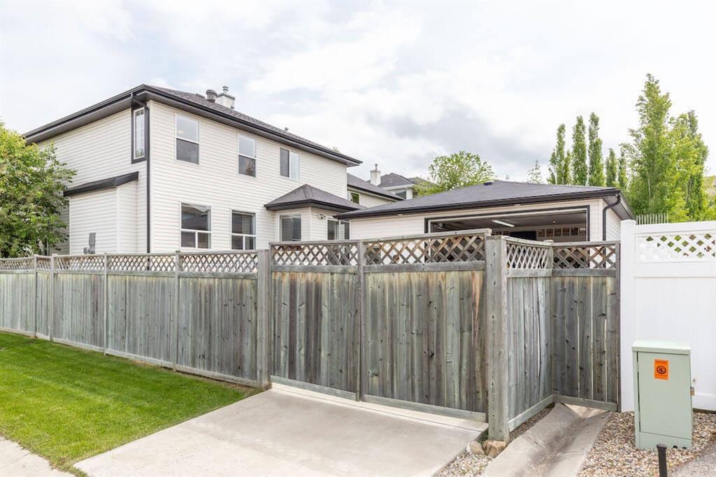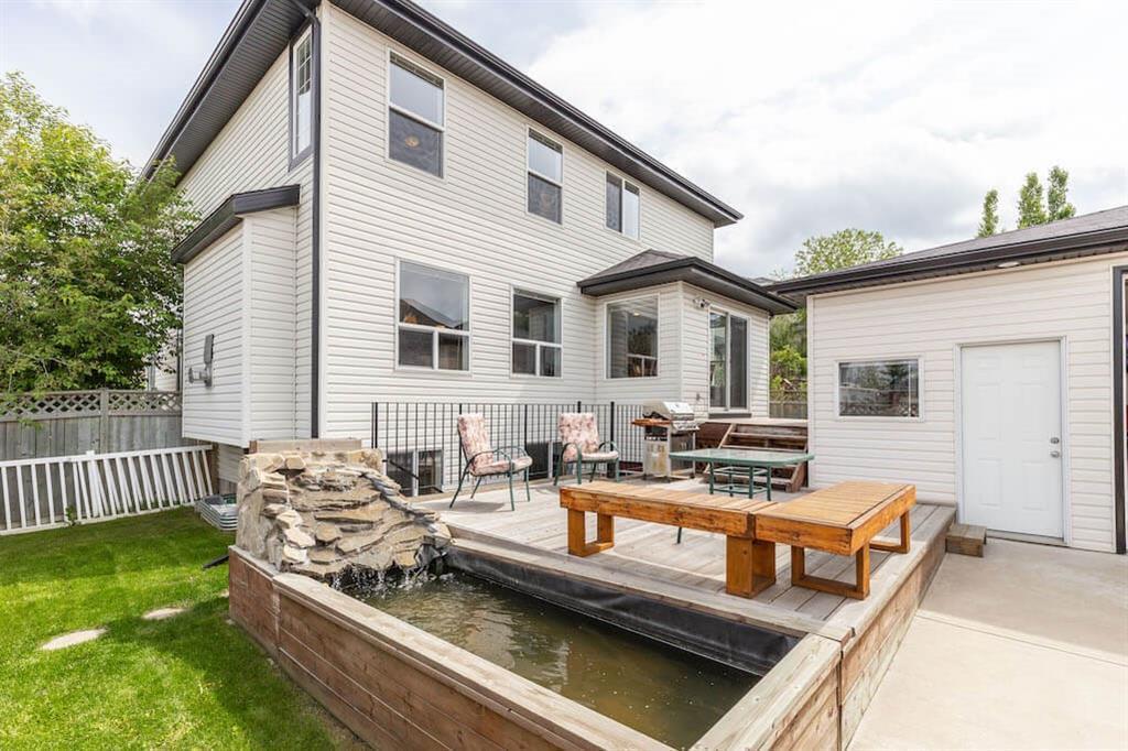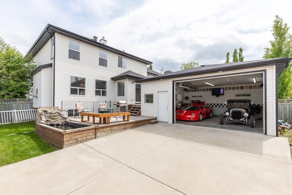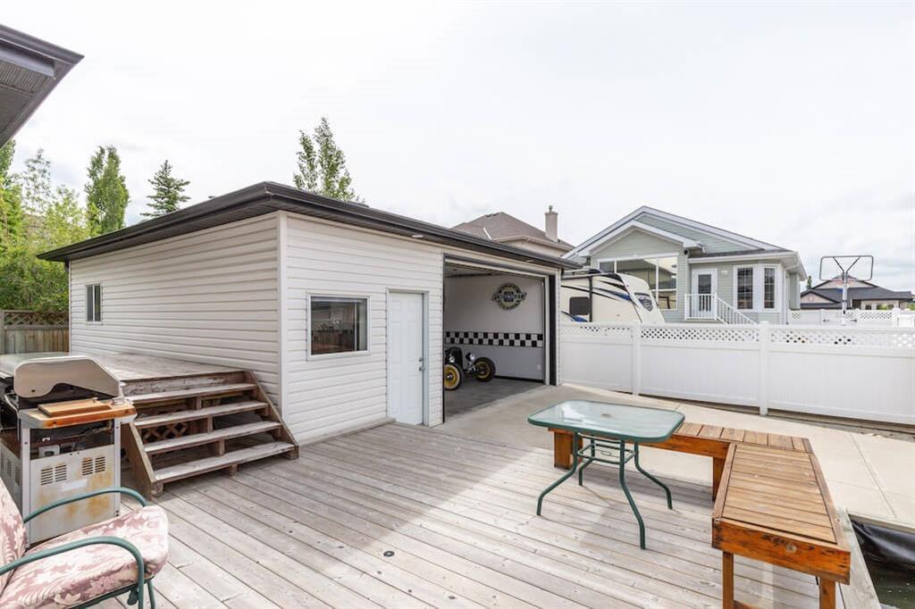 Car enthusiast dream home with a 24x24 attached double garage PLUS a 24x24 detached garage/shop with concrete pad with road access from this corner lot. The shop has built-in air lines, 220v for welding, power outlets every 4, infrared heating, 9 door, and is wired for a car hoist & media system. As you step inside the two-storey foyer you are met with an open living and dining room and are greeted with morning east facing sun. Moving inside to a family room with shelving unit, gas fireplace and entertainment area. The kitchen has bright white cabinetry and appliances, an island and sunny breakfast nook. The west exposure provides a nice bright living area. Entertain on the 2 yr old, 14x15' main deck or relax with a coffee by the fully automated waterfall feature. Den, laundry & powder room complete the main. Upstairs has 4 bedrooms including the master with ensuite bath & walk-in closet. Basement is framed, insulated, and has a walk-up entrance ready for your personal design or mother-in-law suite. All this is situated on a large corner lot near an extensive network of trails leading to the Bow River. Amazing location only 20 minutes from downtown and 45 minutes from the mountains for the ideal work/play lifestyle. Its a quiet community with only one way in/one way out access, offers ample parks, pathways, three playgrounds, a gorgeous golf course, and a shopping centre with all the amenities. (id:22211)