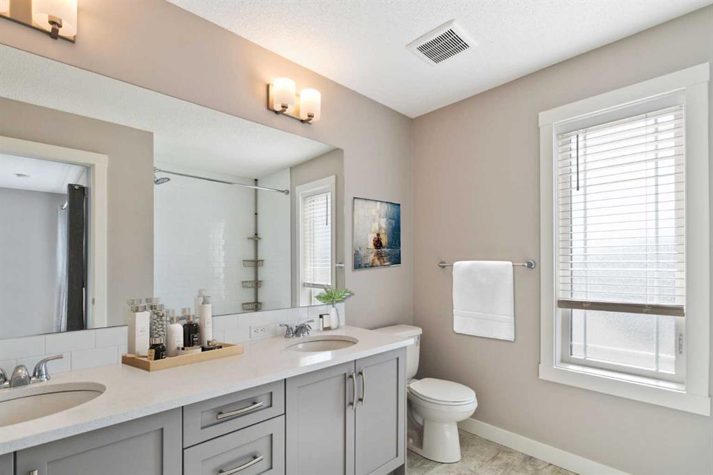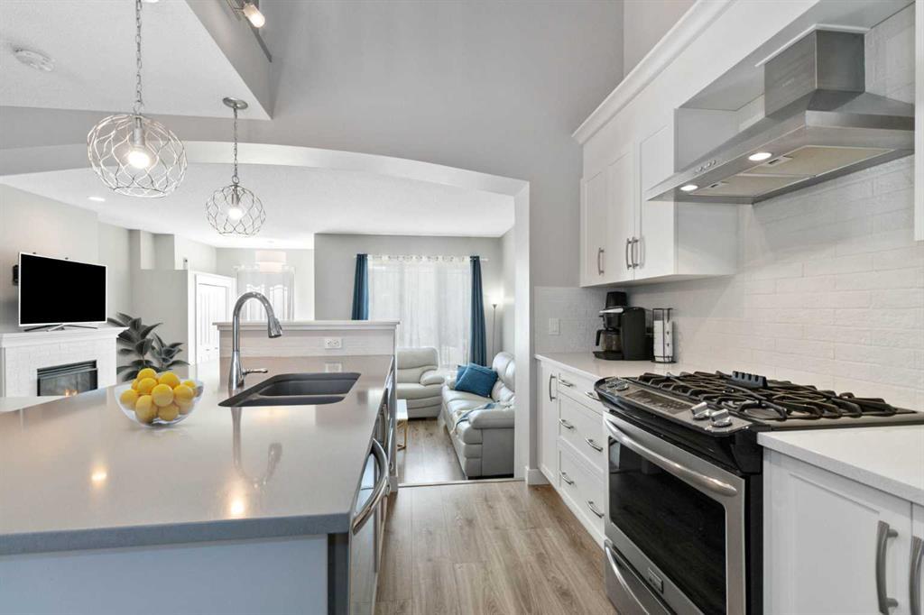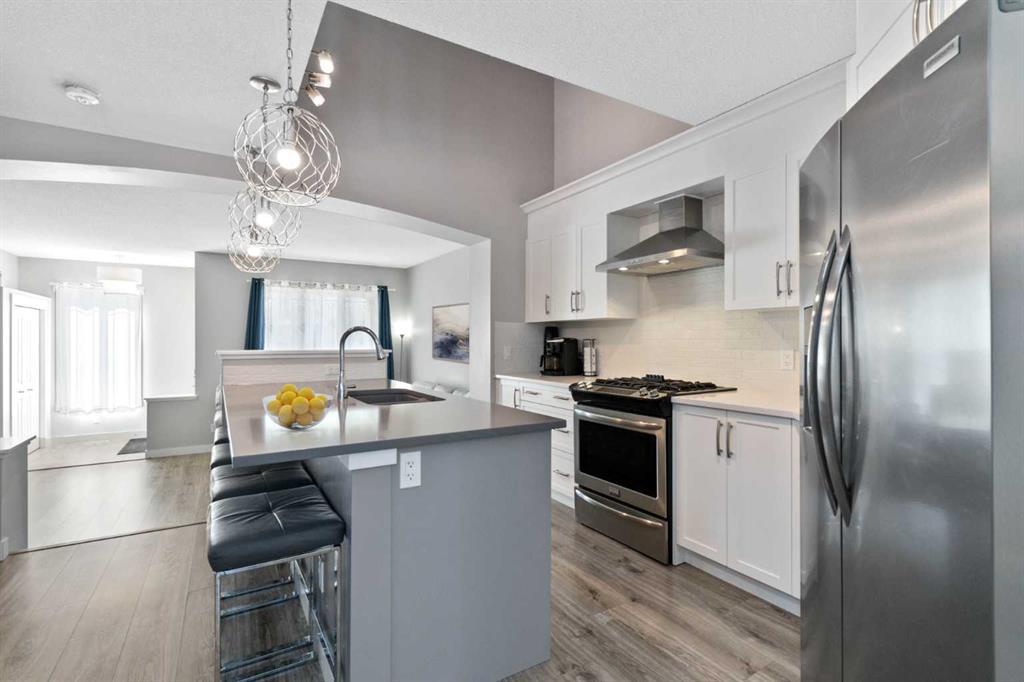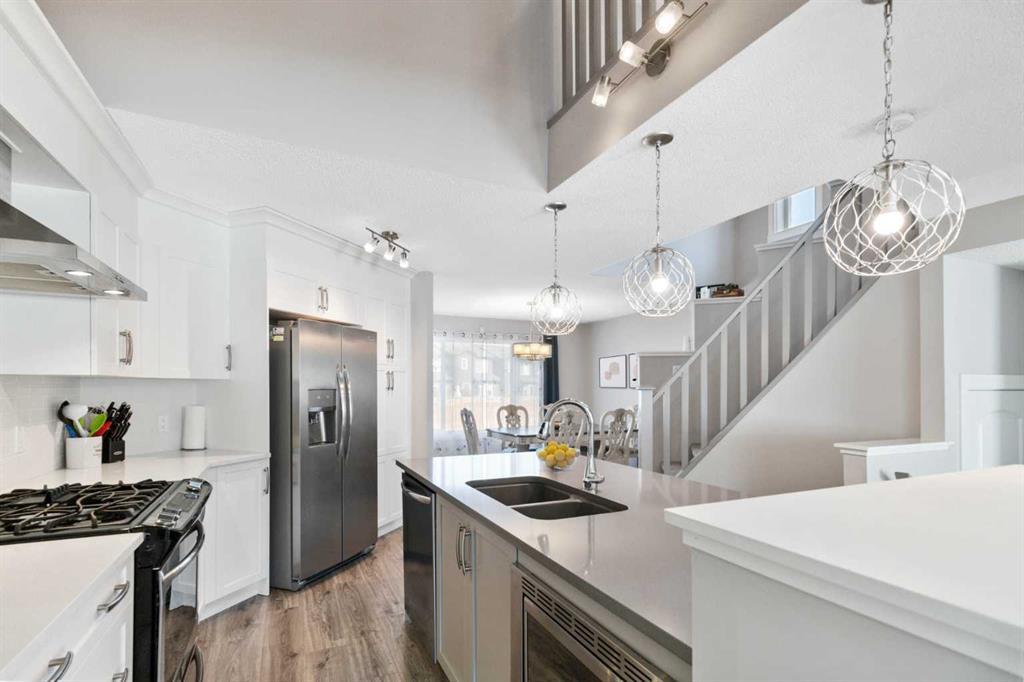 STUNNING home in Seton - this highly sought after BELVEDERE floor plan is bursting with updated features. This house is nestled on a large PIE LOT & comes with a DOUBLE DETACHED GARAGE! Main level boasts a den area, mudroom, powder room and a gourmet kitchen. The modern white kitchen offers a built in microwave, large island with breakfast bar, stainless steel appliances and high ceilings, open to above. You’ll also find a bright dining area large enough to fit a sizeable table, and large windows. The large sunken living room with gas fireplace is perfect space for entertaining and has plenty of room for a growing family. Take the signature curved staircase upstairs to find 3 bedrooms with plenty natural light! The primary bedroom has a grande 4 piece ensuite and walk-in closet. Two more bedrooms, a full bathroom and laundry room complete the upper level. Additional features include luxury vinyl plank flooring throughout the main level, upgraded lighting throughout, quartz countertops, and dual sinks in the primary ensuite, among many others. This stunning home comes with an unfinished basement that is awaiting your creative touches! Lots of room to grow in this house. Check out the website for 3D, additional info & pictures. Don’t miss out, this one won’t last long! (id:22211)