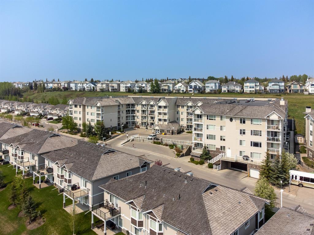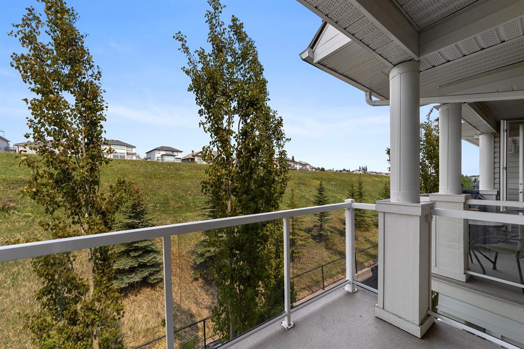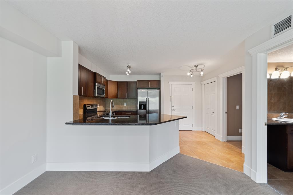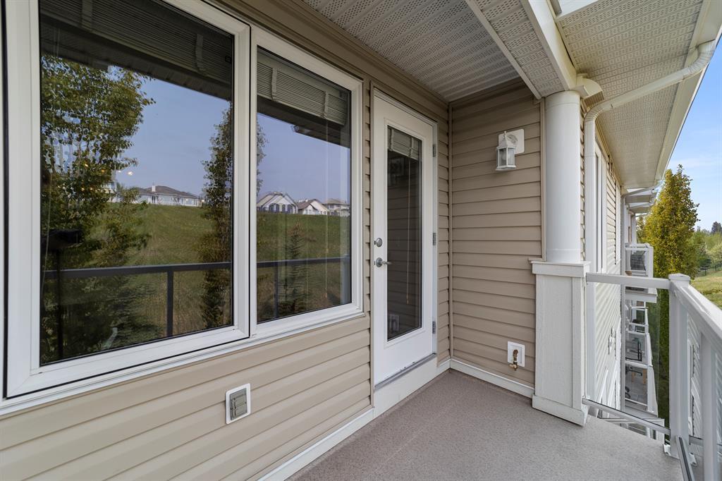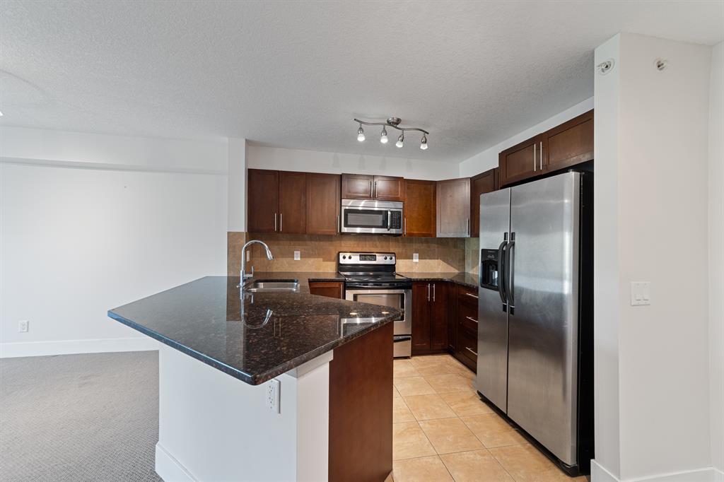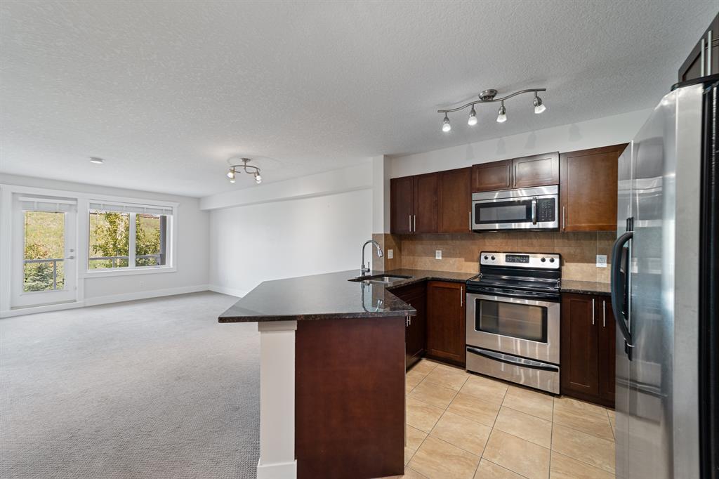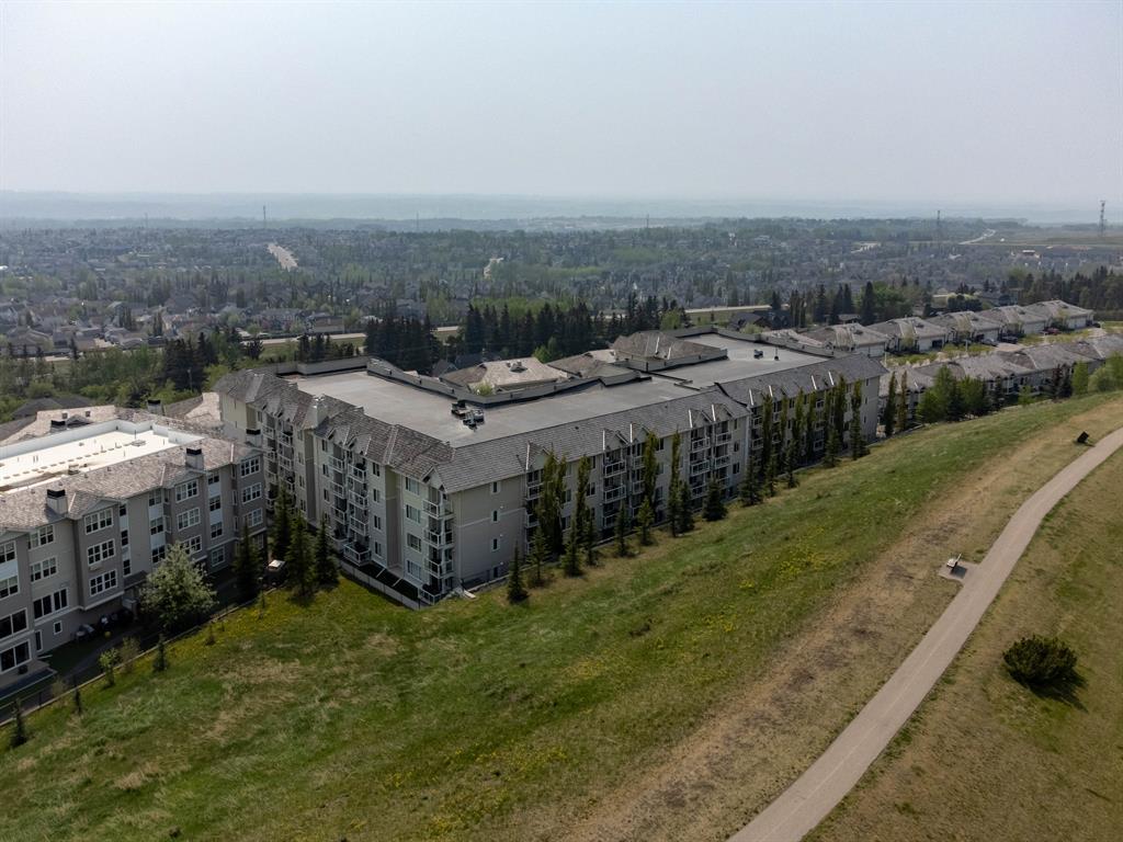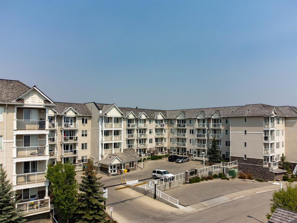 This exquisite apartment in the sought-after Rocky Ridge community is ready for you to move in and enjoy. Boasting a chic top floor location, this 1 bedroom unit with a den is perfect for singles or couples seeking a bright and open floor plan. With lush carpeting and stunning tile floors throughout, the living/dining room is bathed in natural light, while the sleek maple kitchen features top-of-the-line stainless steel appliances and granite counters. The spacious bedroom is equipped with a walk-through closet and a lovely en-suite bathroom, complete with granite counters and a relaxing tub with tile surround. Added features include in-suite laundry with a stacked washer/dryer, underground parking with a storage locker, in-floor heating, and a covered balcony with a gas BBQ line that overlooks a serene greenbelt. Enjoy access to a range of amenities, including social and exercise rooms, theatre, and bike storage, with the Ranch Centre and Royal Oak shopping just minutes away. Plus, you're just steps from the LRT for easy commuting. Don't miss out on this truly exceptional living experience. (id:22211)