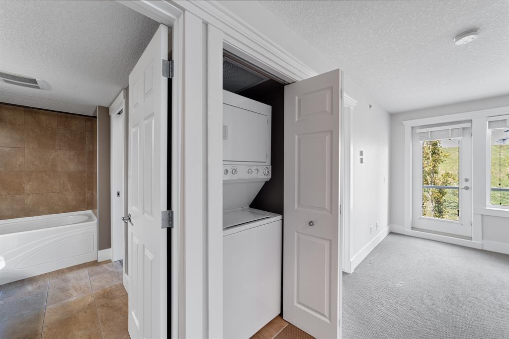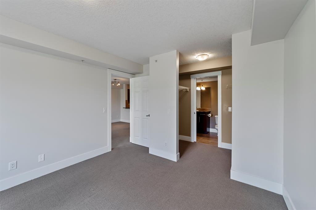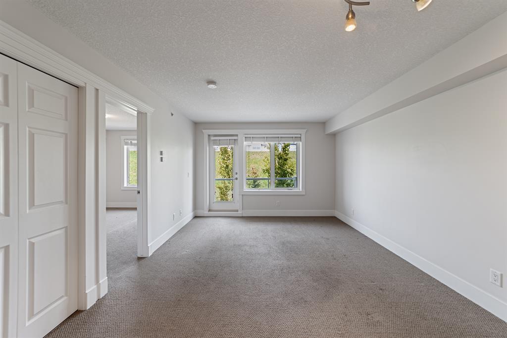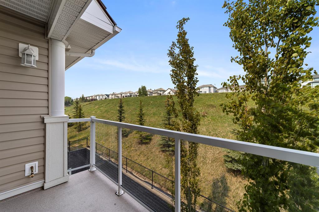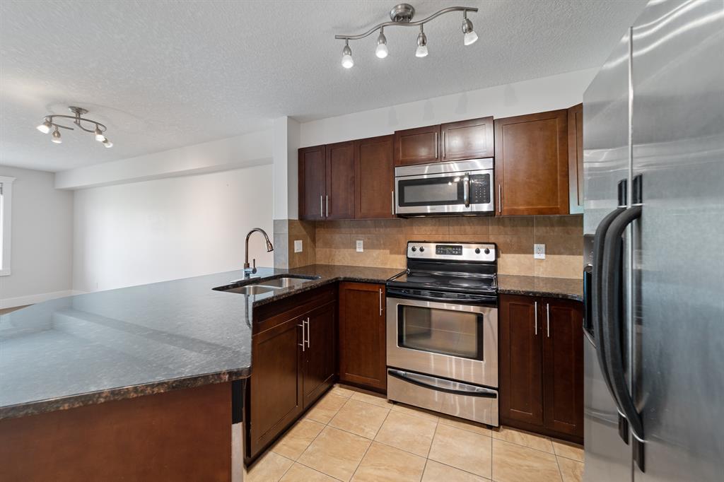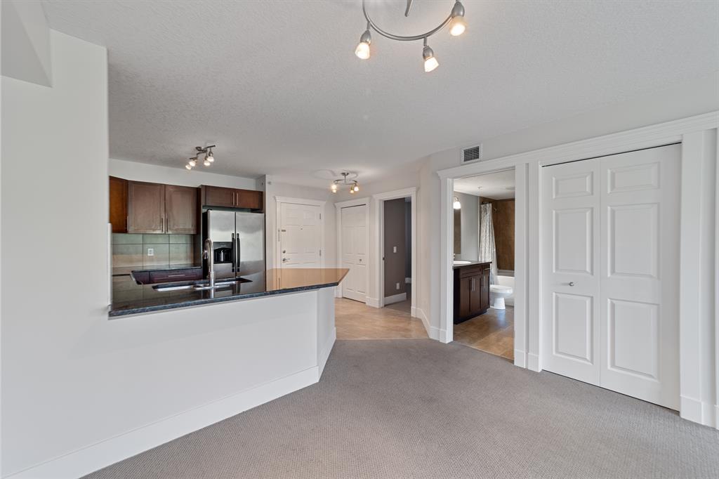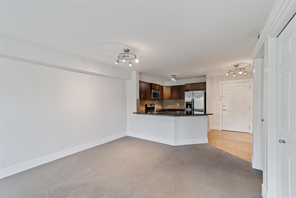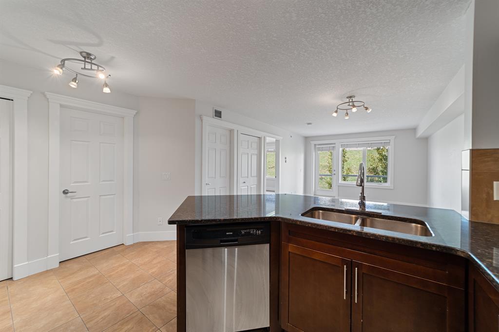 This exquisite apartment in the sought-after Rocky Ridge community is ready for you to move in and enjoy. Boasting a chic top floor location, this 1 bedroom unit with a den is perfect for singles or couples seeking a bright and open floor plan. With lush carpeting and stunning tile floors throughout, the living/dining room is bathed in natural light, while the sleek maple kitchen features top-of-the-line stainless steel appliances and granite counters. The spacious bedroom is equipped with a walk-through closet and a lovely en-suite bathroom, complete with granite counters and a relaxing tub with tile surround. Added features include in-suite laundry with a stacked washer/dryer, underground parking with a storage locker, in-floor heating, and a covered balcony with a gas BBQ line that overlooks a serene greenbelt. Enjoy access to a range of amenities, including social and exercise rooms, theatre, and bike storage, with the Ranch Centre and Royal Oak shopping just minutes away. Plus, you're just steps from the LRT for easy commuting. Don't miss out on this truly exceptional living experience. (id:22211)
