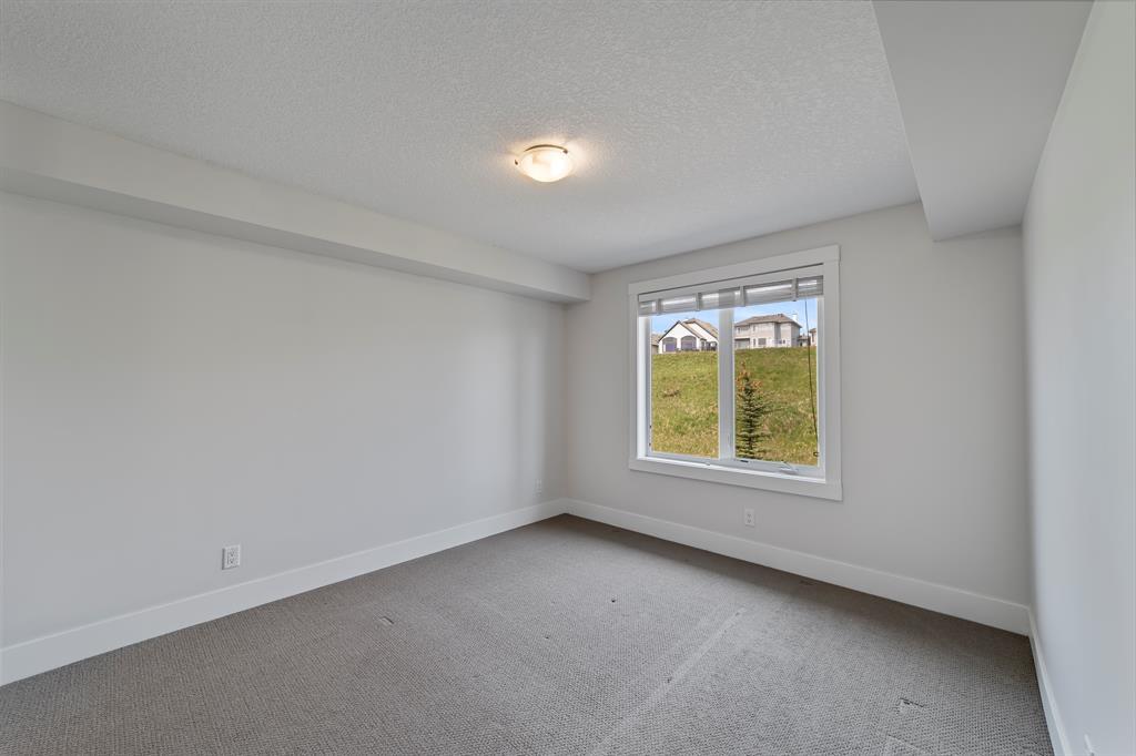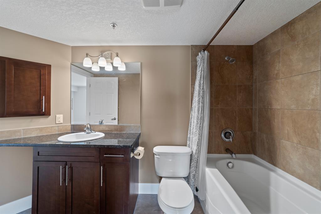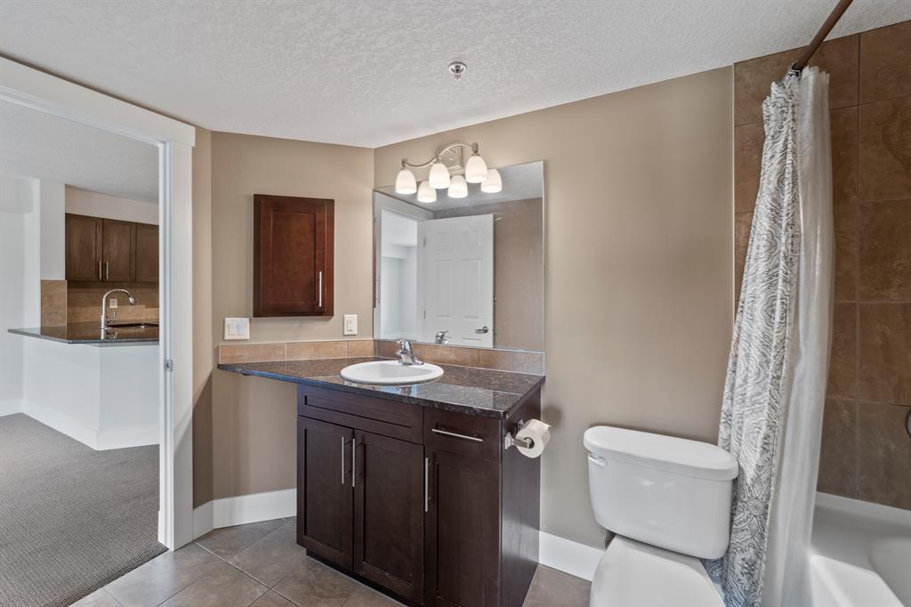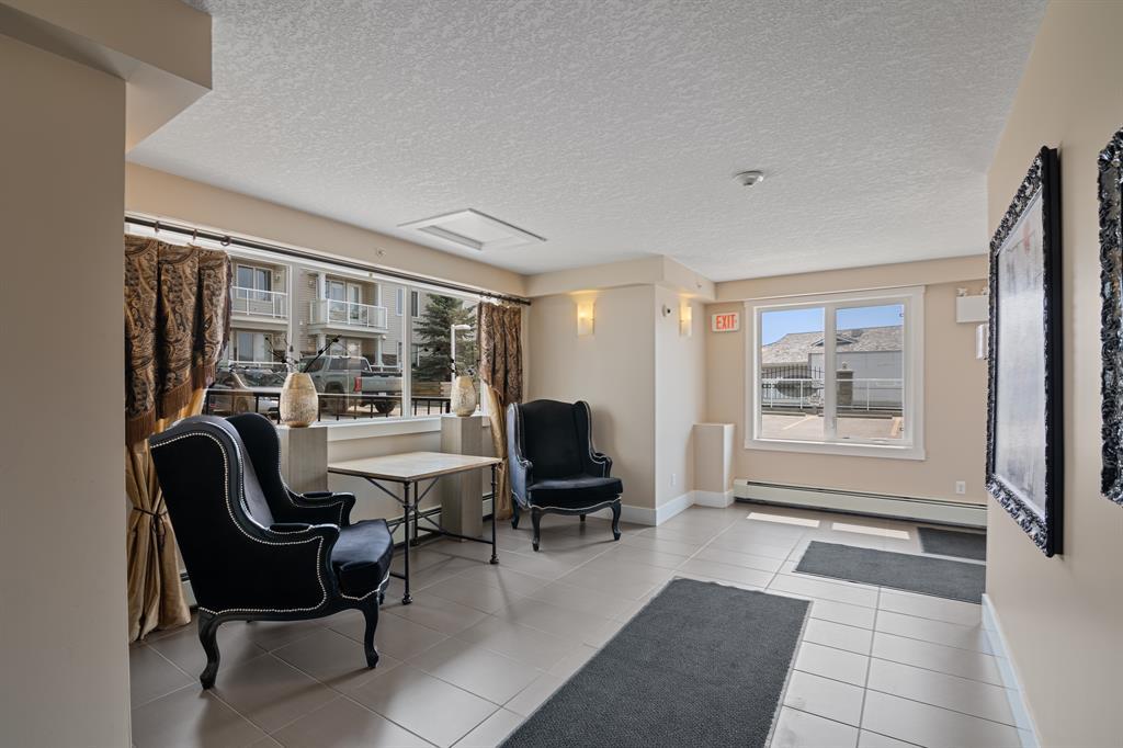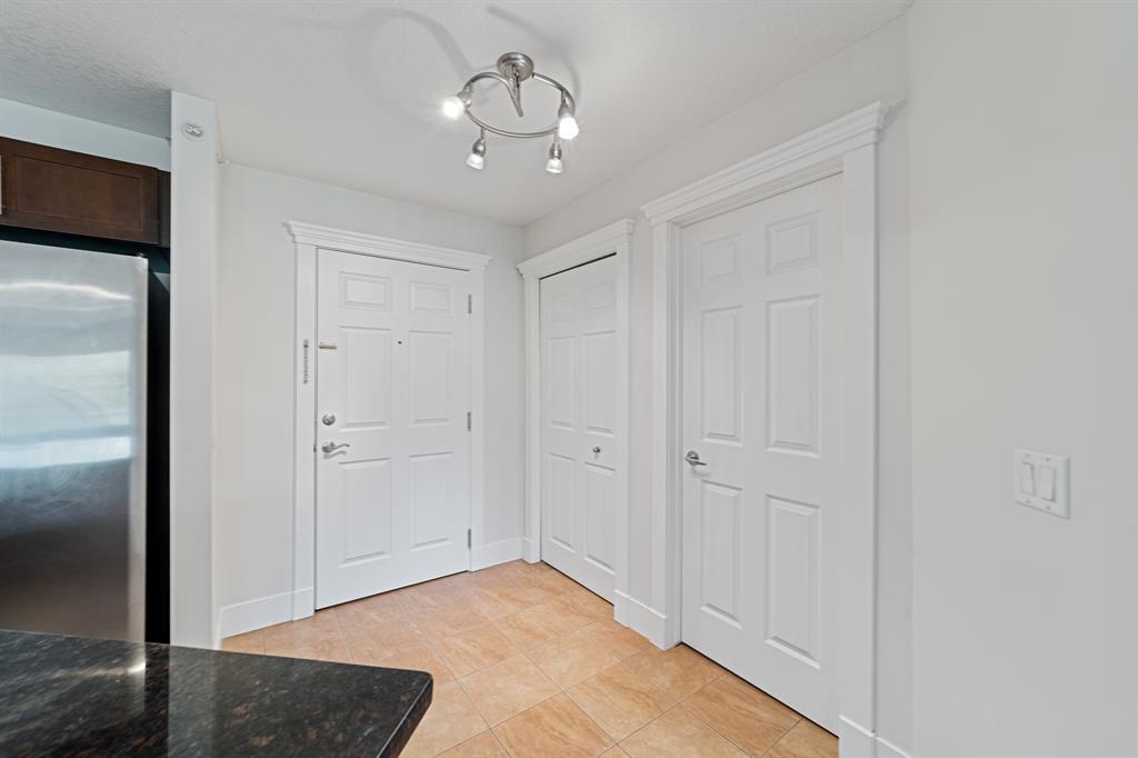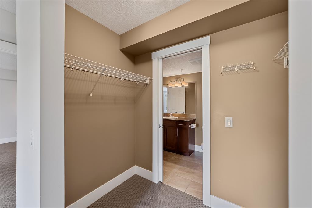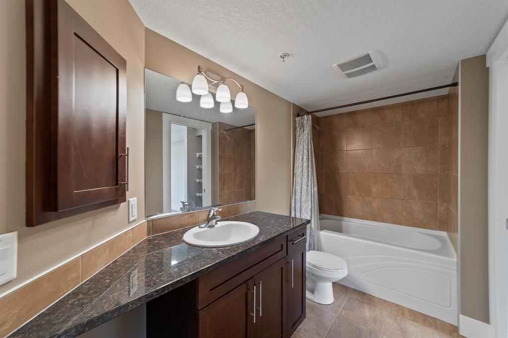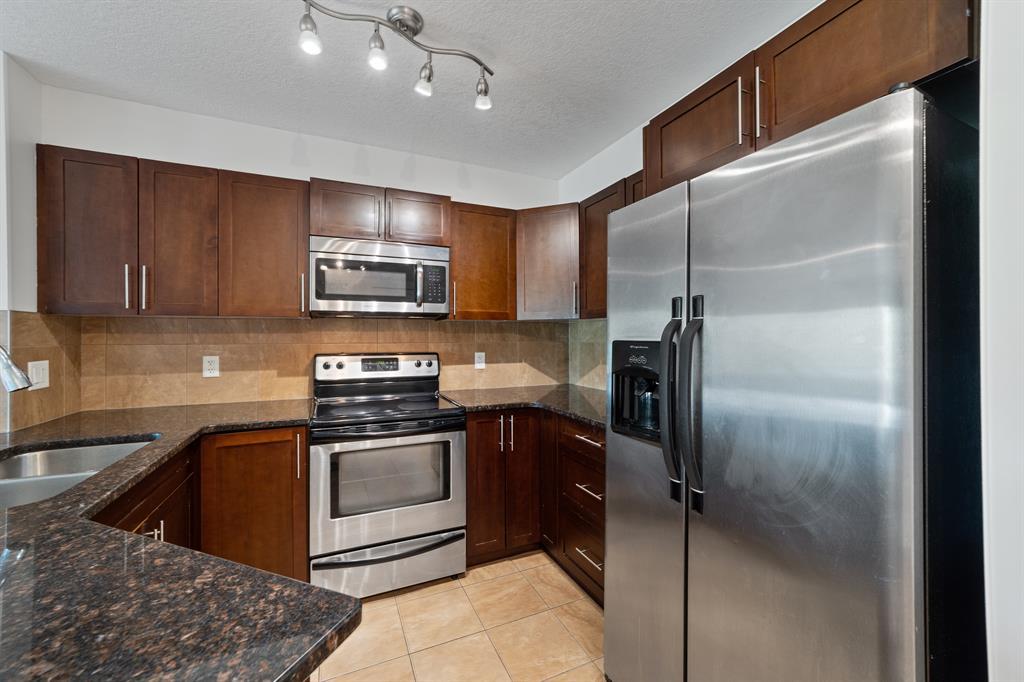 This exquisite apartment in the sought-after Rocky Ridge community is ready for you to move in and enjoy. Boasting a chic top floor location, this 1 bedroom unit with a den is perfect for singles or couples seeking a bright and open floor plan. With lush carpeting and stunning tile floors throughout, the living/dining room is bathed in natural light, while the sleek maple kitchen features top-of-the-line stainless steel appliances and granite counters. The spacious bedroom is equipped with a walk-through closet and a lovely en-suite bathroom, complete with granite counters and a relaxing tub with tile surround. Added features include in-suite laundry with a stacked washer/dryer, underground parking with a storage locker, in-floor heating, and a covered balcony with a gas BBQ line that overlooks a serene greenbelt. Enjoy access to a range of amenities, including social and exercise rooms, theatre, and bike storage, with the Ranch Centre and Royal Oak shopping just minutes away. Plus, you're just steps from the LRT for easy commuting. Don't miss out on this truly exceptional living experience. (id:22211)