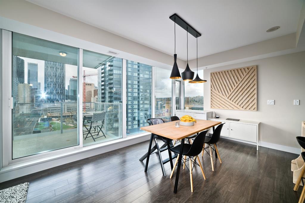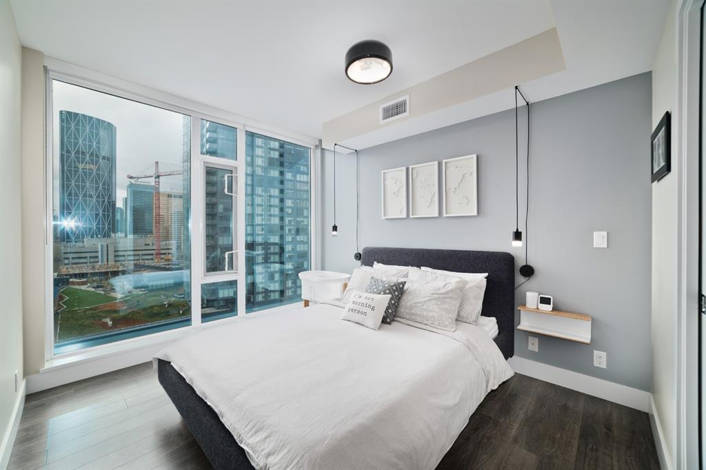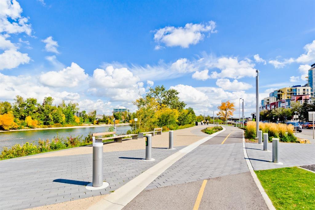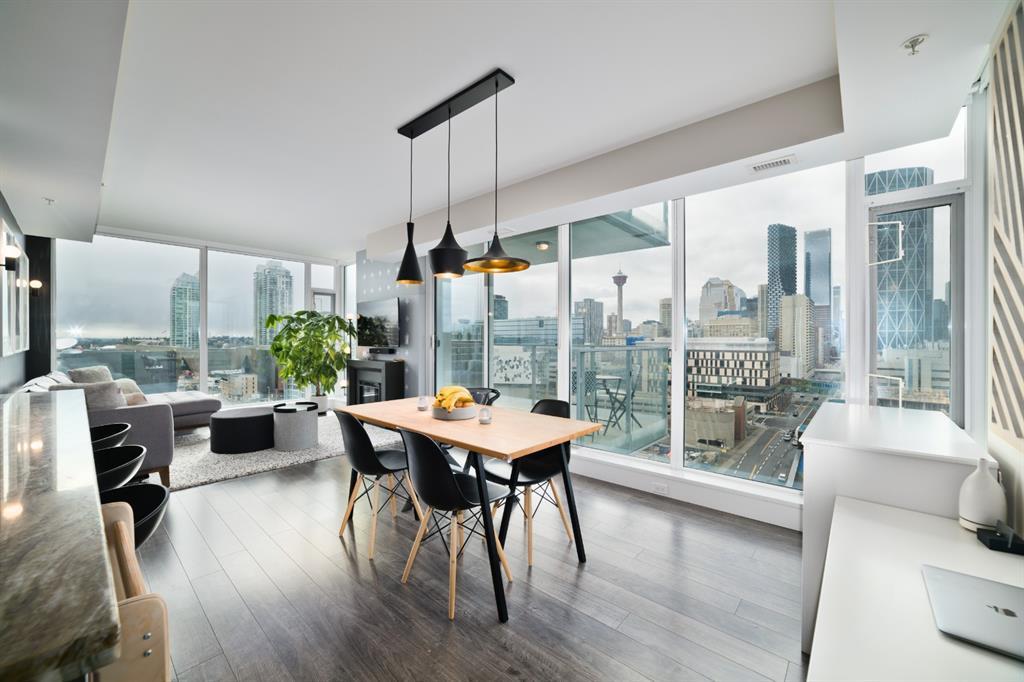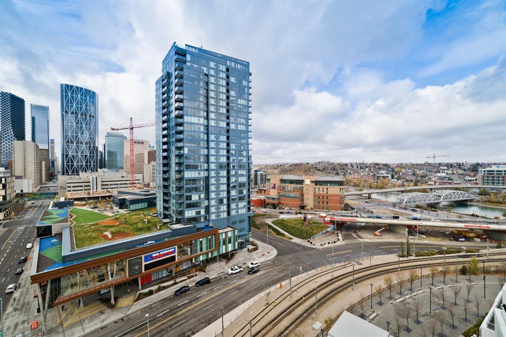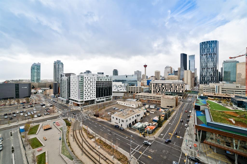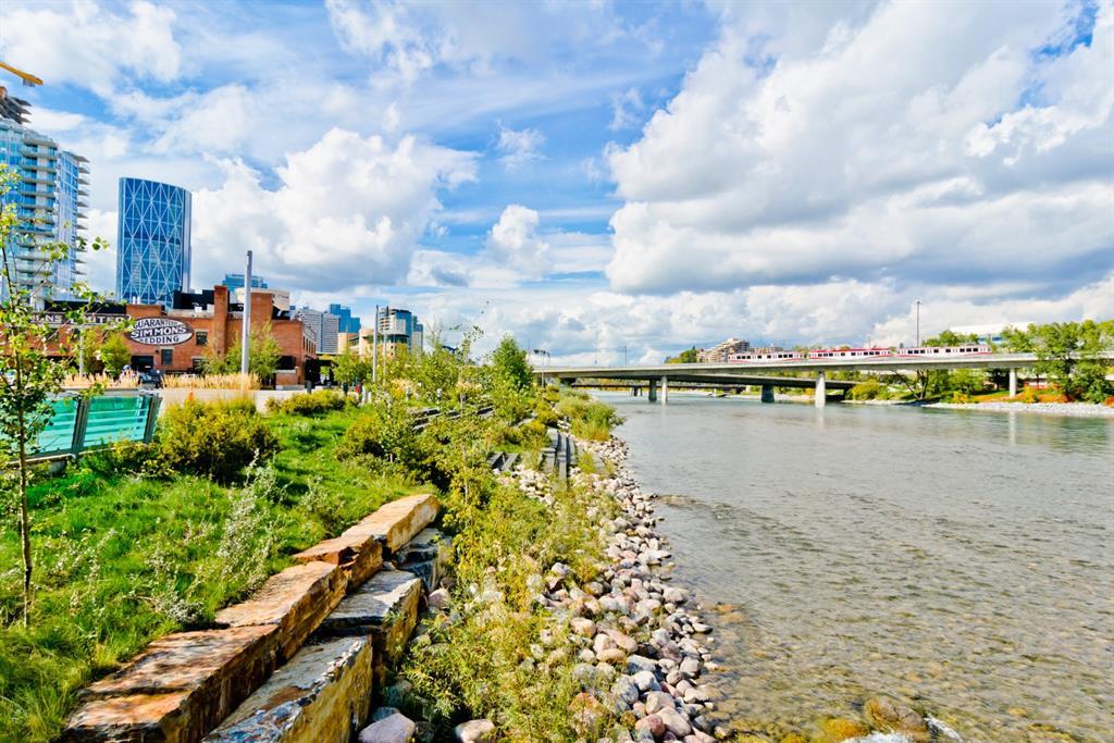 Welcome to luxury living in the amazing community of East Village. Unobstructed views of downtown, Studio Bell, Saddledome, Stampede Grounds and river views from this SE corner unit on the 13th floor, executive-style suite in the iconic Evolution complex. This gorgeous condo offers 2bd, 2 bath, 2 heated underground parking spots and a separate secured storage locker. Modern simplistic design & floor to ceiling windows in each room allow plenty of natural light, creating the ideal living/dining area for entertaining. Host friends in the kitchen w/ granite countertops, gas range, backsplash & 4-seat breakfast nook. The living room has east and south exposures and a door to an oversized balcony with gas hookup and breathtaking views of the Bow and East Village. A great place to enjoy Stampede & New Year's fireworks. The master bedroom has a generous walk-in closet and great skyline views of the Calgary Tower, a perfect retreat for watching the city’s lights at night. The second bedroom would be perfect to use as a home office with beautiful views of the Saddledome. Upgraded hard flooring and light fixtures throughout, central A/C and heated bathroom floors. In-suite laundry, huge hallway closets, built-in storage and shelving, to keep everything tidy and tucked away. Evolution is a sought-after and engaging complex, with this unit in the taller Pulse building, which boasts the convenience of 3 elevators and offers a larger gym. Additional amenities include landscaped outdoor courtyard with BBQs for residents' use, secure bike storage, 24/7 on-site security, professional concierge, party/meeting room, sauna, steam room & more. Soak up the East Village character with easy access to the Bow River pathway system, adjacent to an LRT station, across the street from Superstore, shops, cafes, restaurants, parks, public library & endless entertainment options. A beautiful home in a well-managed building, surrounded by a dynamic, energetic neighbourhood. Call to book your privat e viewings today! (id:22211)