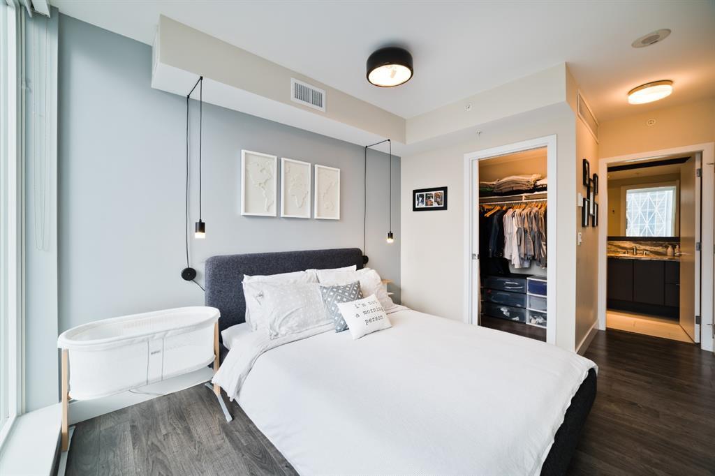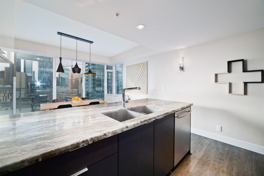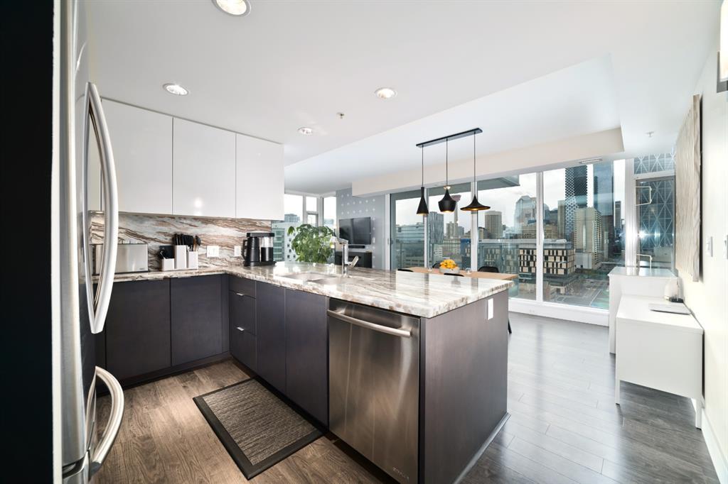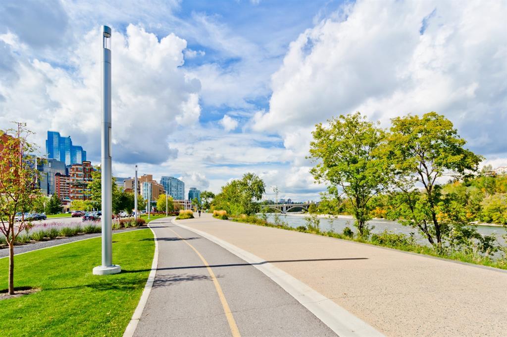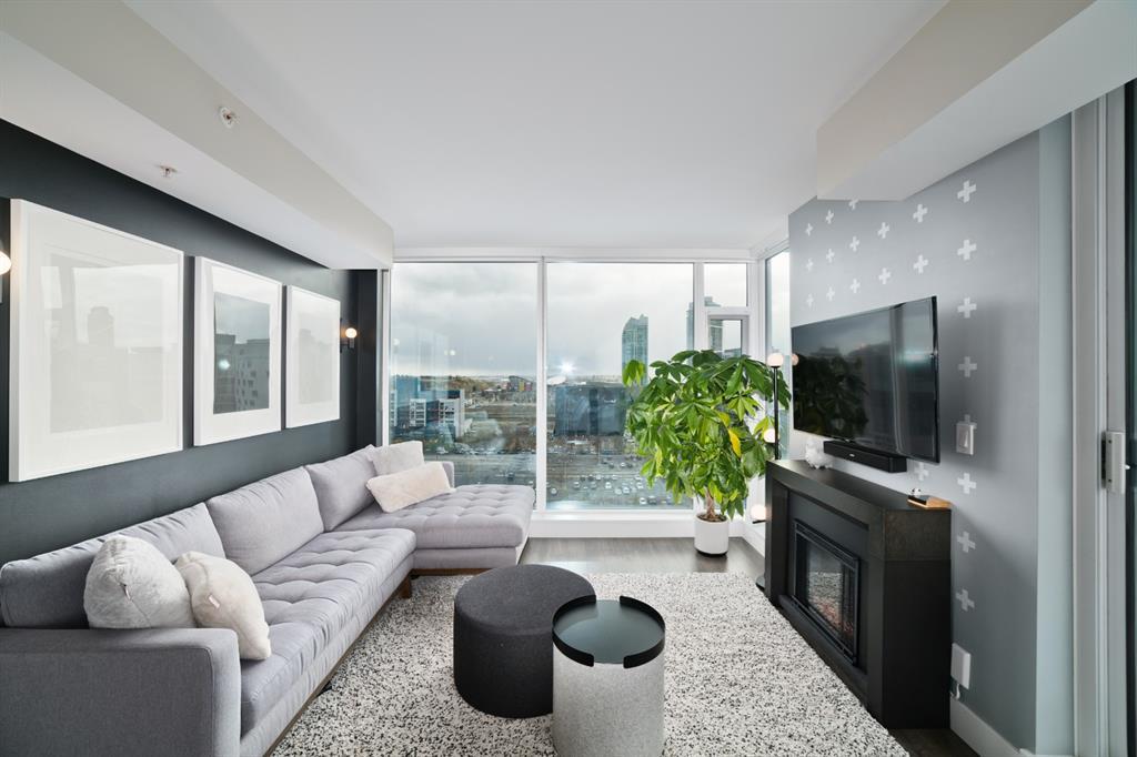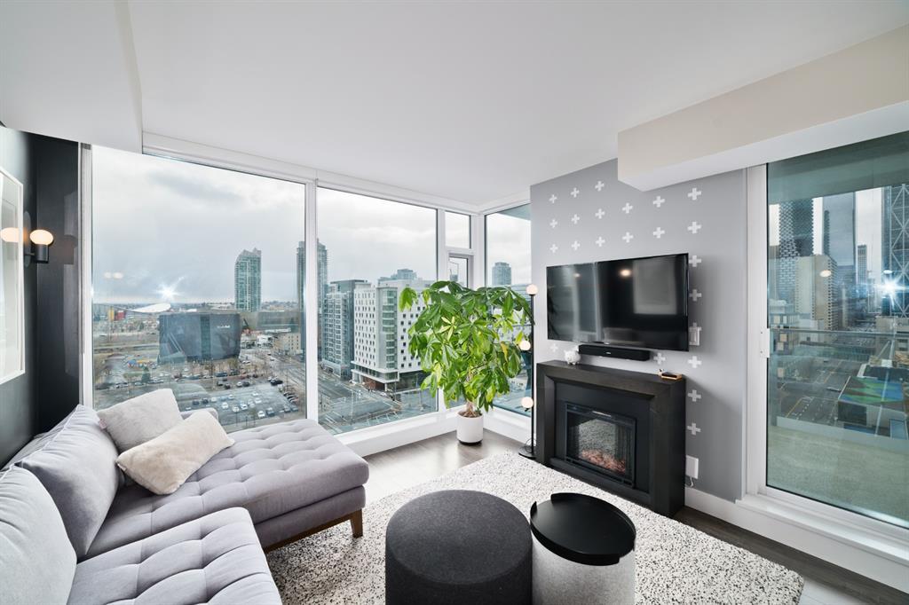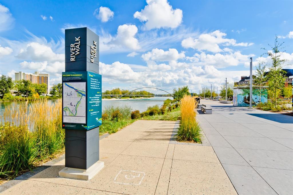 Welcome to luxury living in the amazing community of East Village. Unobstructed views of downtown, Studio Bell, Saddledome, Stampede Grounds and river views from this SE corner unit on the 13th floor, executive-style suite in the iconic Evolution complex. This gorgeous condo offers 2bd, 2 bath, 2 heated underground parking spots and a separate secured storage locker. Modern simplistic design & floor to ceiling windows in each room allow plenty of natural light, creating the ideal living/dining area for entertaining. Host friends in the kitchen w/ granite countertops, gas range, backsplash & 4-seat breakfast nook. The living room has east and south exposures and a door to an oversized balcony with gas hookup and breathtaking views of the Bow and East Village. A great place to enjoy Stampede & New Year's fireworks. The master bedroom has a generous walk-in closet and great skyline views of the Calgary Tower, a perfect retreat for watching the city’s lights at night. The second bedroom would be perfect to use as a home office with beautiful views of the Saddledome. Upgraded hard flooring and light fixtures throughout, central A/C and heated bathroom floors. In-suite laundry, huge hallway closets, built-in storage and shelving, to keep everything tidy and tucked away. Evolution is a sought-after and engaging complex, with this unit in the taller Pulse building, which boasts the convenience of 3 elevators and offers a larger gym. Additional amenities include landscaped outdoor courtyard with BBQs for residents' use, secure bike storage, 24/7 on-site security, professional concierge, party/meeting room, sauna, steam room & more. Soak up the East Village character with easy access to the Bow River pathway system, adjacent to an LRT station, across the street from Superstore, shops, cafes, restaurants, parks, public library & endless entertainment options. A beautiful home in a well-managed building, surrounded by a dynamic, energetic neighbourhood. Call to book your privat e viewings today! (id:22211)