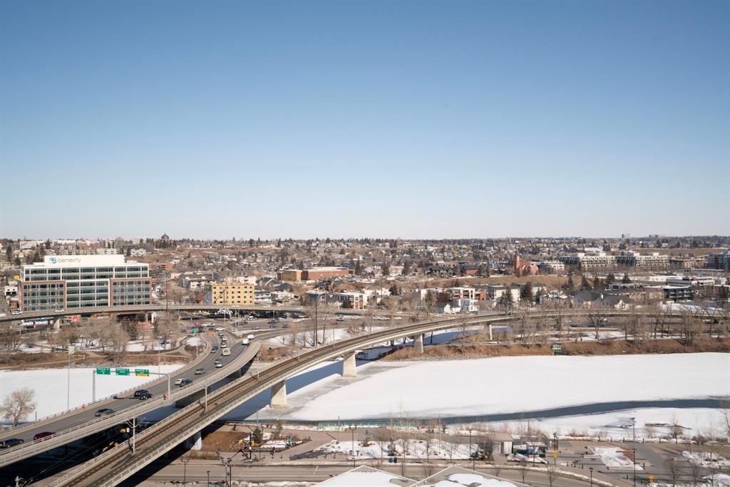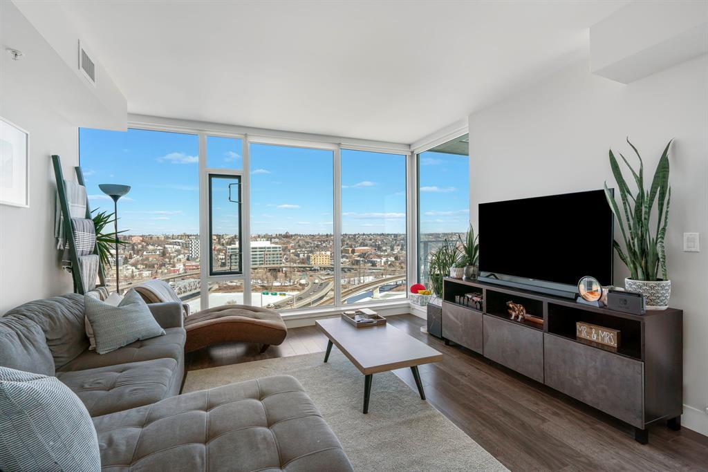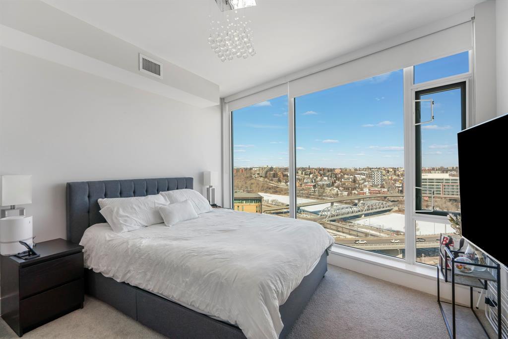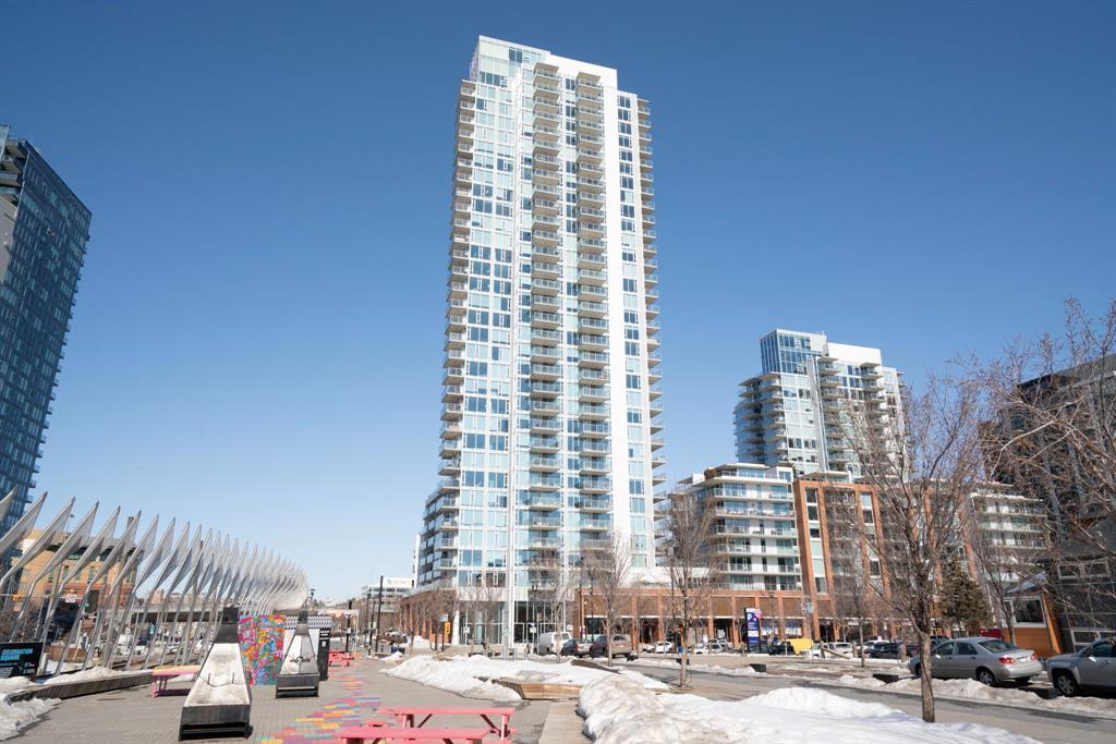 WELCOME TO THE EAST VILLAGE! This stunning two bed two bath corner unit offers sophisticated urban lifestyle with breathtaking views of the Bow river. The breathtaking corner living room, surrounded by floor-to-ceiling windows on all sides, offers panoramic views of the Bow River. This luxurious space is perfect for those who appreciate an airy and bright atmosphere, making this living room an ideal space for relaxation and entertainment. The gourmet kitchen boasts top-of-the-line stainless steel appliances, corian quartz countertops, and gas range, perfect for the discerning chef. The open kitchen provides ample workspace and storage making meal preparation a breeze. The primary bedroom is a private retreat with its spa-like en-suite bathroom complete with heated floors. Relax in the soaking tub or enjoy a refreshing shower in the glass-enclosed shower stall. The spacious walk-through closets provides ample storage space for your wardrobe. The second bedroom is perfect for guests or office space which also includes stunning views of the bow. This luxury condo comes with all the amenities you would expect in a hi-rise building, including 24-hour concierge service, fitness centre, pool, and shared terrace and party room. You'll also have access to a secure underground parking spot. This unit is just steps away from the tastiest sourdough from Sidewalk Citizen, the best rooftop patio Calgary has to offer at Rooftop Bar @ Simmons, and an incredible cup of coffee from Phil and Sebastian. Call and book your tour today - because you deserve to love your home! (id:22211)