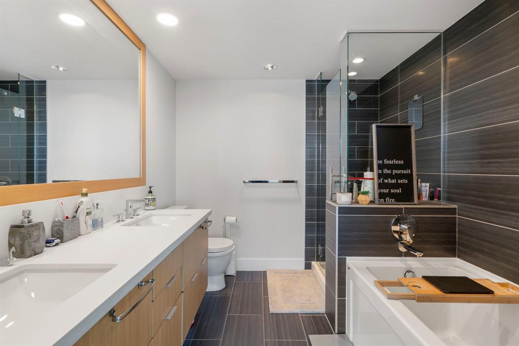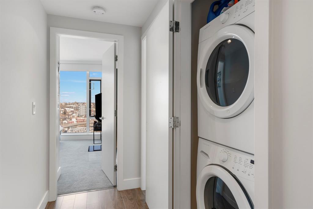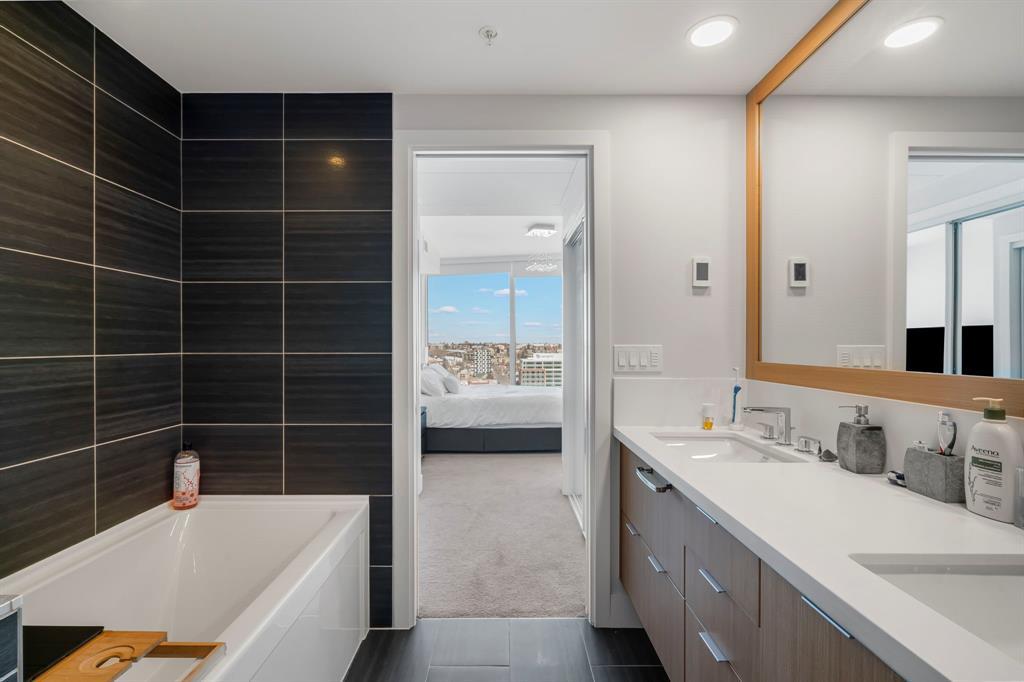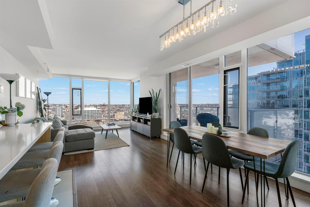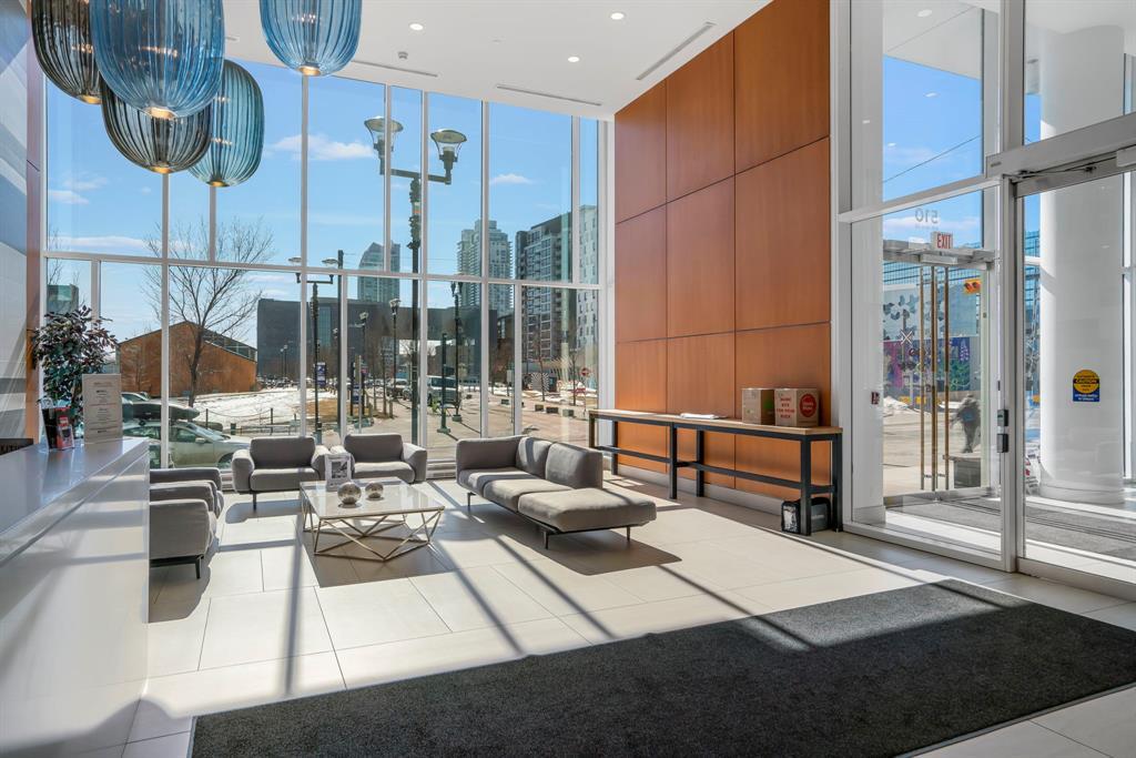 WELCOME TO THE EAST VILLAGE! This stunning two bed two bath corner unit offers sophisticated urban lifestyle with breathtaking views of the Bow river. The breathtaking corner living room, surrounded by floor-to-ceiling windows on all sides, offers panoramic views of the Bow River. This luxurious space is perfect for those who appreciate an airy and bright atmosphere, making this living room an ideal space for relaxation and entertainment. The gourmet kitchen boasts top-of-the-line stainless steel appliances, corian quartz countertops, and gas range, perfect for the discerning chef. The open kitchen provides ample workspace and storage making meal preparation a breeze. The primary bedroom is a private retreat with its spa-like en-suite bathroom complete with heated floors. Relax in the soaking tub or enjoy a refreshing shower in the glass-enclosed shower stall. The spacious walk-through closets provides ample storage space for your wardrobe. The second bedroom is perfect for guests or office space which also includes stunning views of the bow. This luxury condo comes with all the amenities you would expect in a hi-rise building, including 24-hour concierge service, fitness centre, pool, and shared terrace and party room. You'll also have access to a secure underground parking spot. This unit is just steps away from the tastiest sourdough from Sidewalk Citizen, the best rooftop patio Calgary has to offer at Rooftop Bar @ Simmons, and an incredible cup of coffee from Phil and Sebastian. Call and book your tour today - because you deserve to love your home! (id:22211)