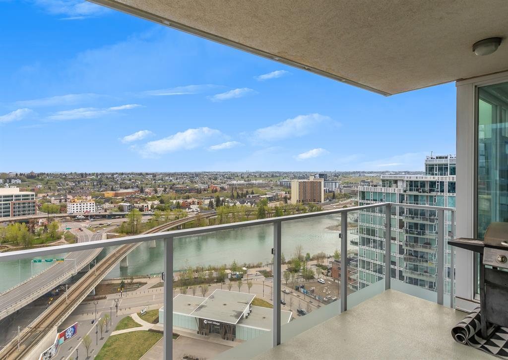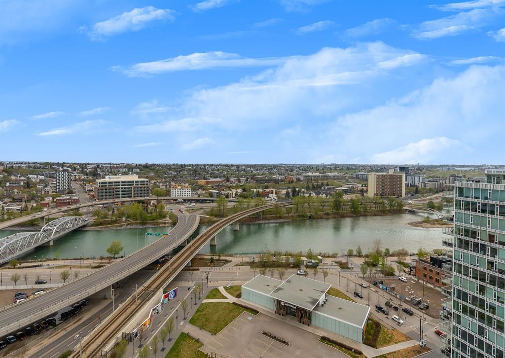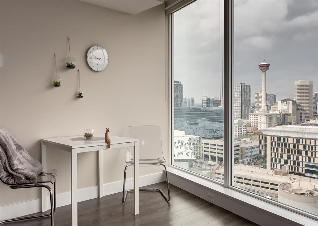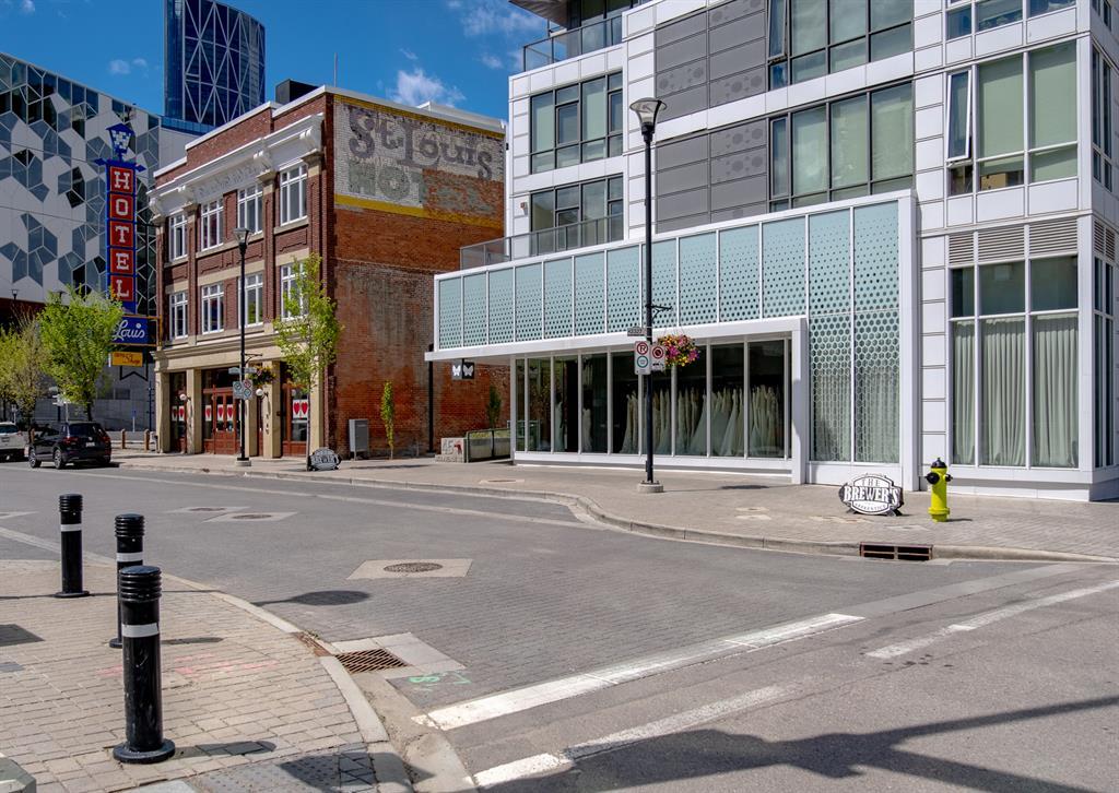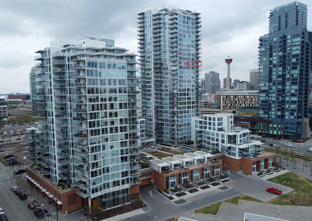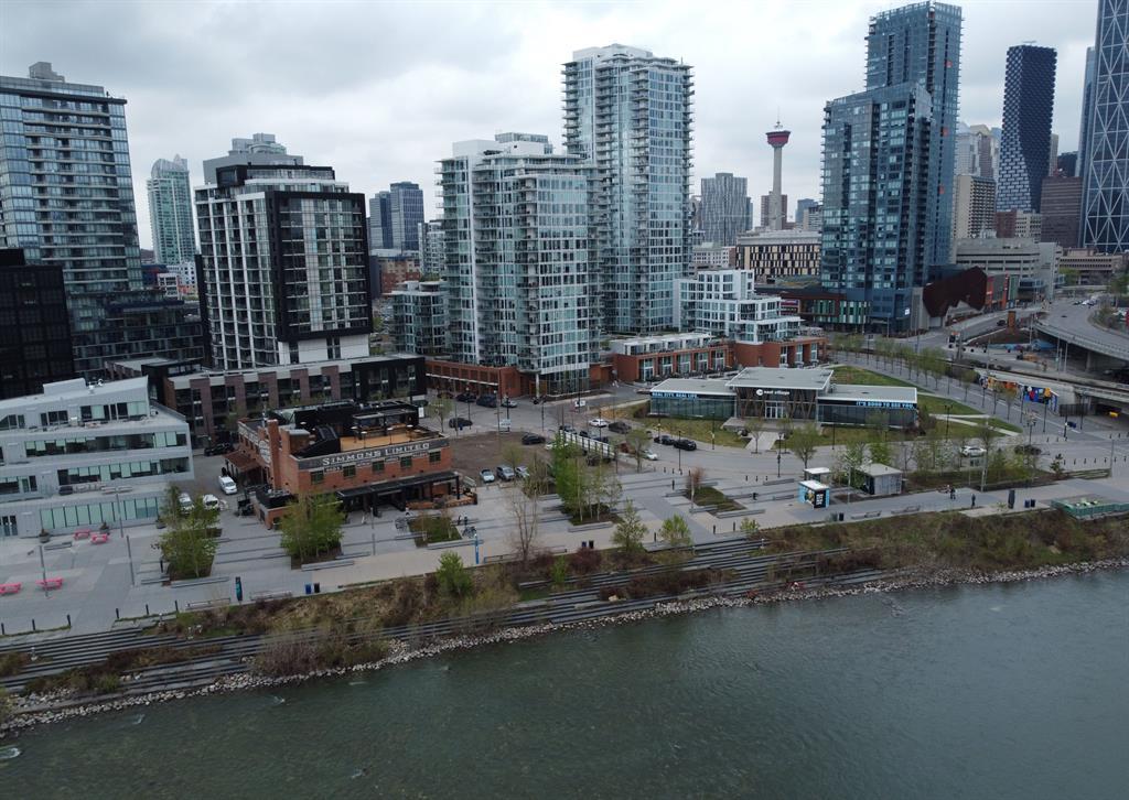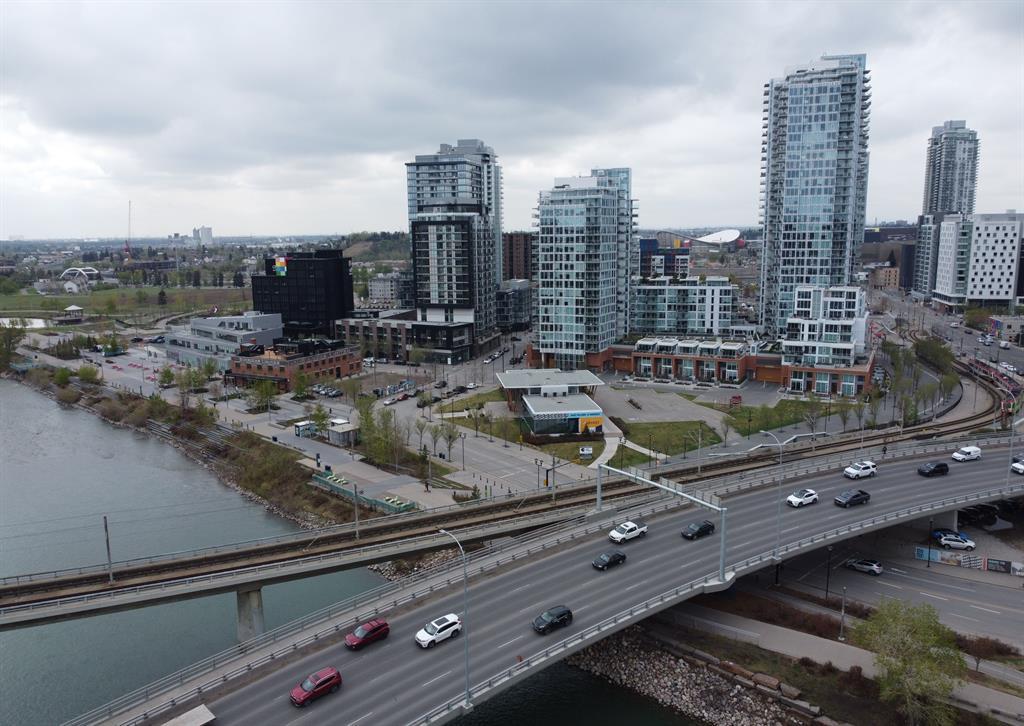We're extremely proud to present this specatacular executive corner-unit condo in the amazing Evolution Pulse by Bosa Developments. The East Village is on the rise again with the approval of the new Events Centre, Practice Facility and Stadium for the Calgary Flames. The retrofitting of the Stampede Grounds is vitally important to our tourism and downtown vibrance, so why not own a piece of it, just steps away! There will never be another building to block the view and the floor to ceiling windows flood your space with sunlight. The creature comforts include in-floor heating, air conditioning, granite counters/backsplashes, Jenn-air appliances, upgraded vinyl plank flooring, a big balcony, storage locker, and even a huge parking stall that could fit 2 small cars or 1 big one. With 2 bedrooms, in-suite laundry, a gourmet kitchen, large eating bar, and 2 bathrooms, this immaculate unit offers it all! The master suite is an oasis featuring double closets and a 5-piece ensuite bath with deep soaker tub and tiled shower. Building amenities include 24-HOUR CONCIERGE/SECURITY, a fitness room with steam room and sauna, rooftop terrace with BBQ stations and fire pits, and a party room with pool table/TV’s/kitchen. What a time to be a buyer in the Calgary condo market, the value is unprecedented, and we'd love to accommodate your showings! (id:22211)