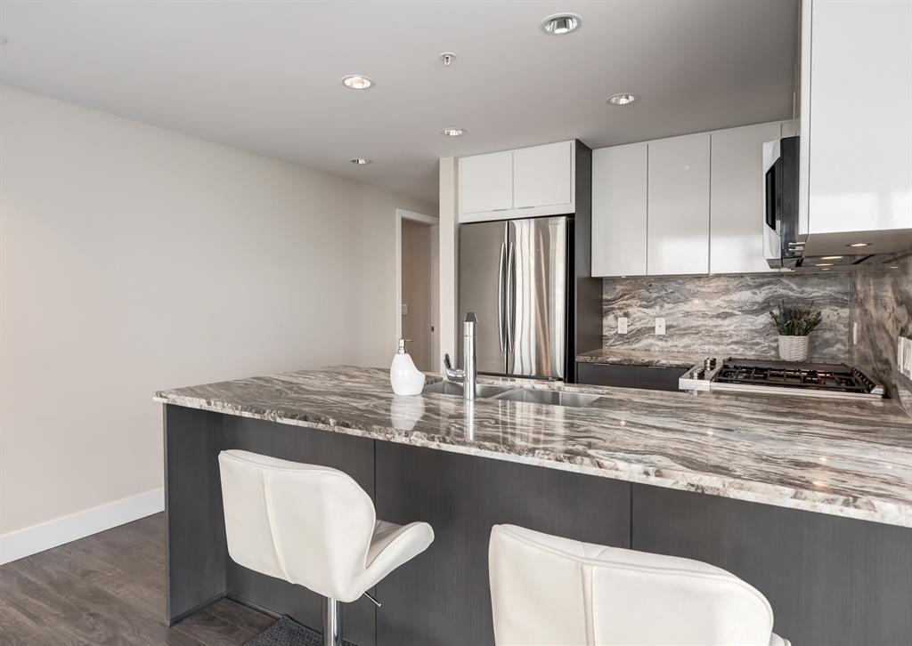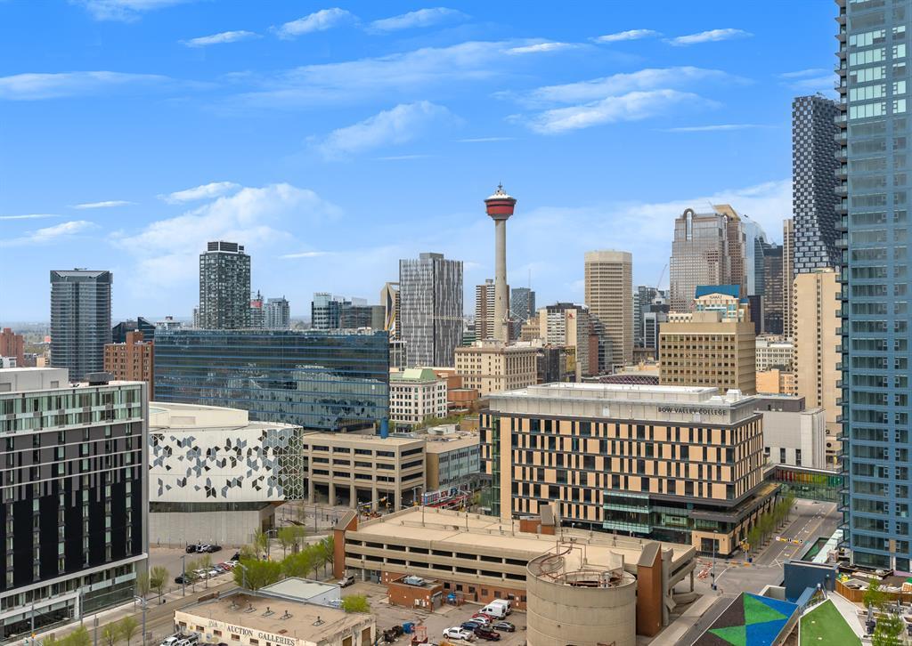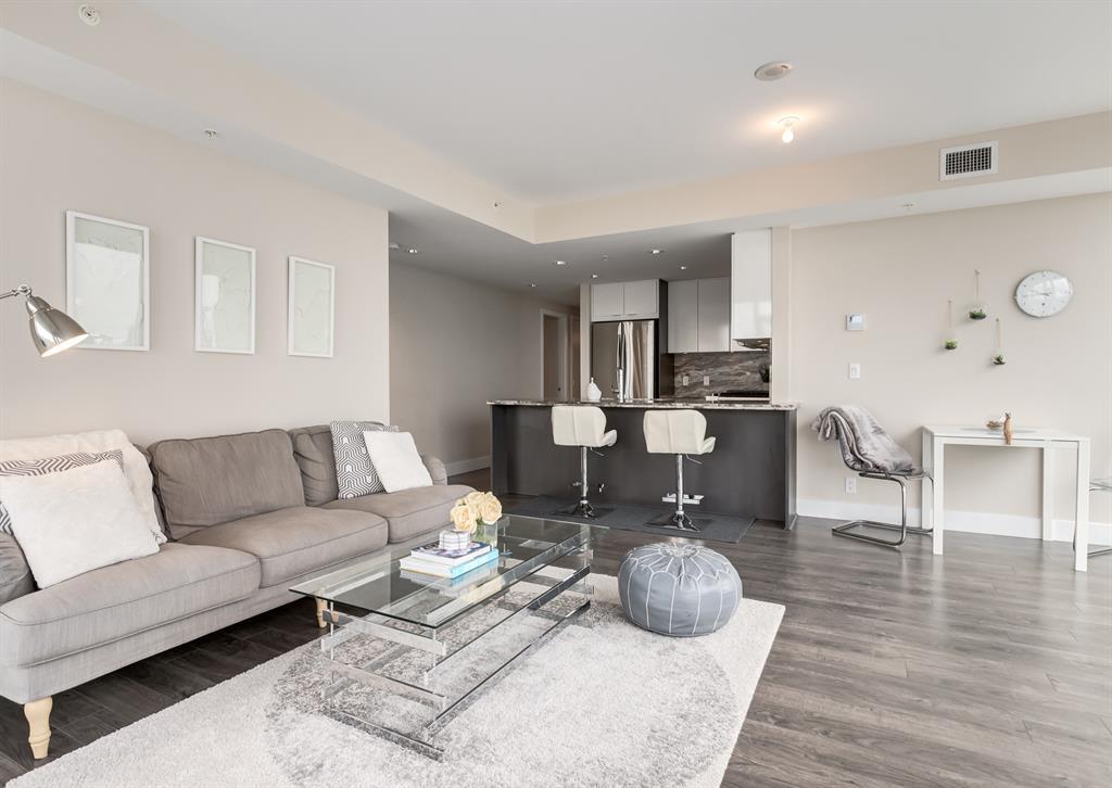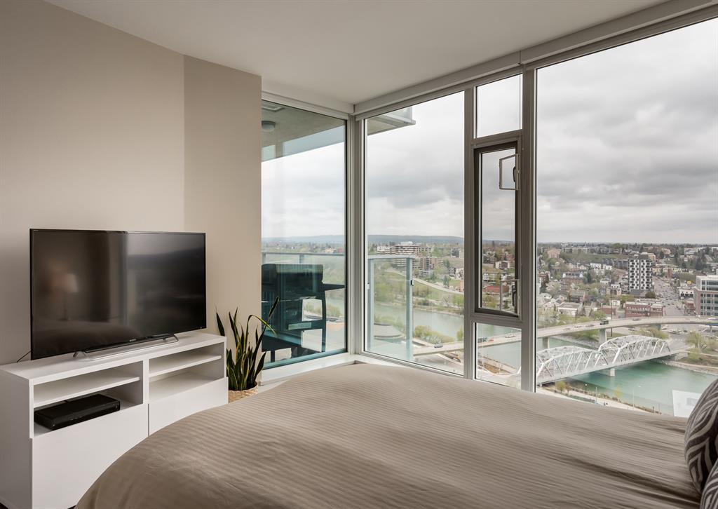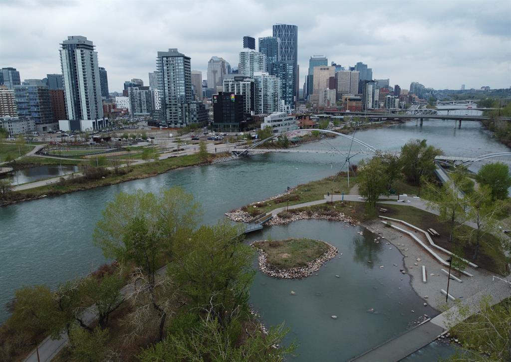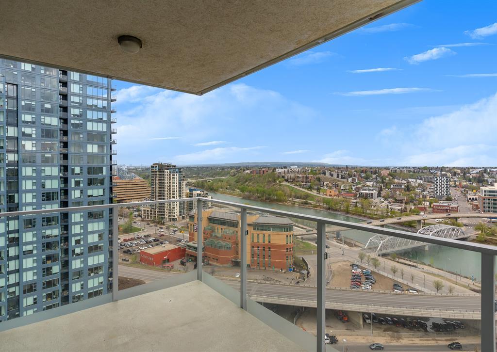We're extremely proud to present this specatacular executive corner-unit condo in the amazing Evolution Pulse by Bosa Developments. The East Village is on the rise again with the approval of the new Events Centre, Practice Facility and Stadium for the Calgary Flames. The retrofitting of the Stampede Grounds is vitally important to our tourism and downtown vibrance, so why not own a piece of it, just steps away! There will never be another building to block the view and the floor to ceiling windows flood your space with sunlight. The creature comforts include in-floor heating, air conditioning, granite counters/backsplashes, Jenn-air appliances, upgraded vinyl plank flooring, a big balcony, storage locker, and even a huge parking stall that could fit 2 small cars or 1 big one. With 2 bedrooms, in-suite laundry, a gourmet kitchen, large eating bar, and 2 bathrooms, this immaculate unit offers it all! The master suite is an oasis featuring double closets and a 5-piece ensuite bath with deep soaker tub and tiled shower. Building amenities include 24-HOUR CONCIERGE/SECURITY, a fitness room with steam room and sauna, rooftop terrace with BBQ stations and fire pits, and a party room with pool table/TV’s/kitchen. What a time to be a buyer in the Calgary condo market, the value is unprecedented, and we'd love to accommodate your showings! (id:22211)