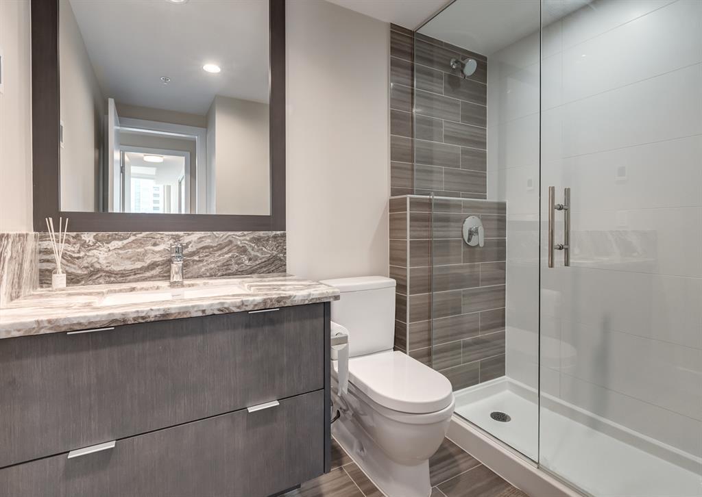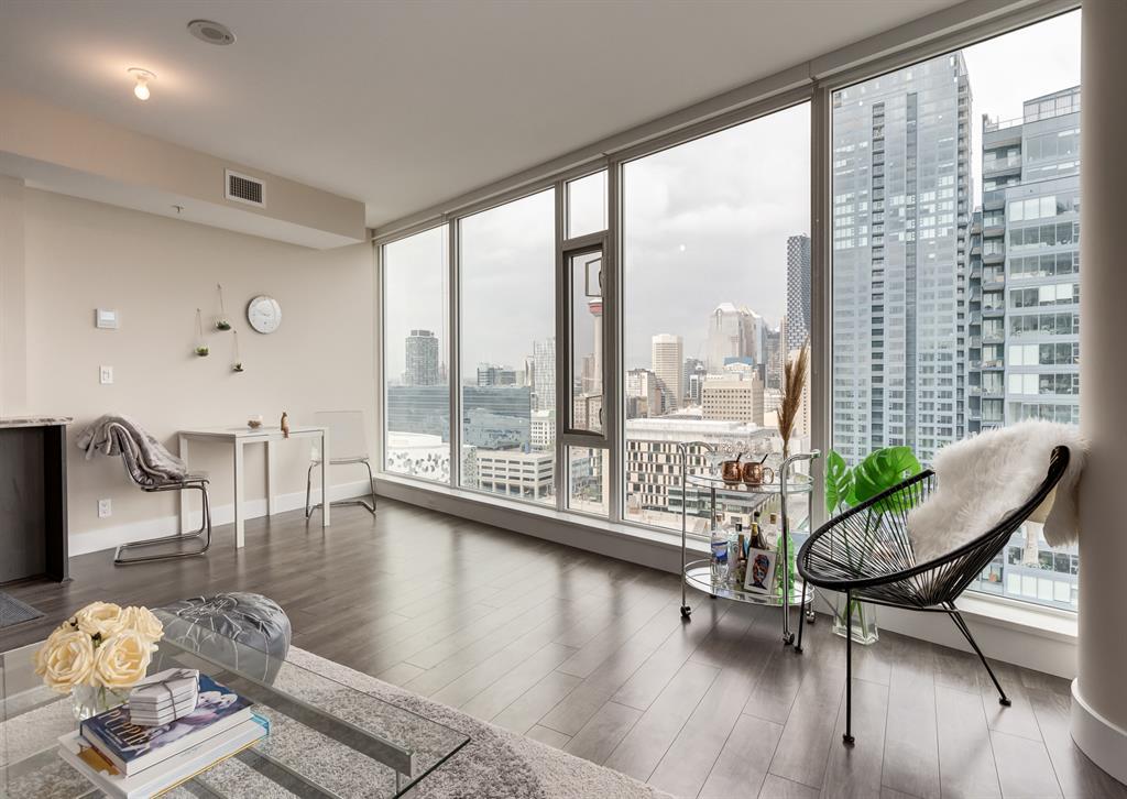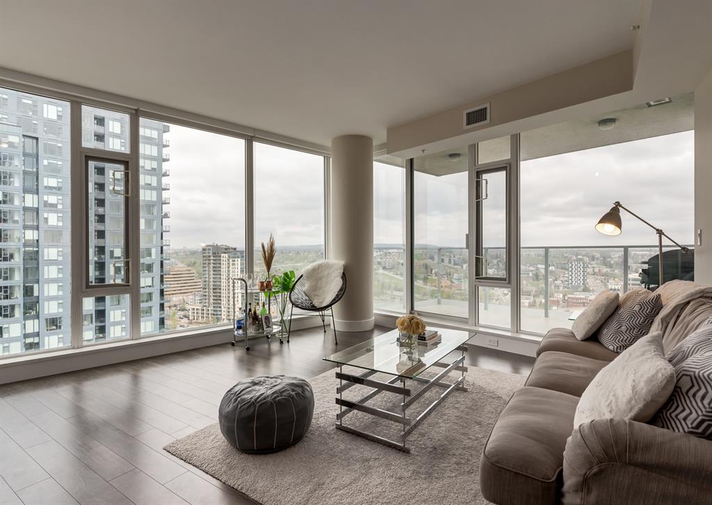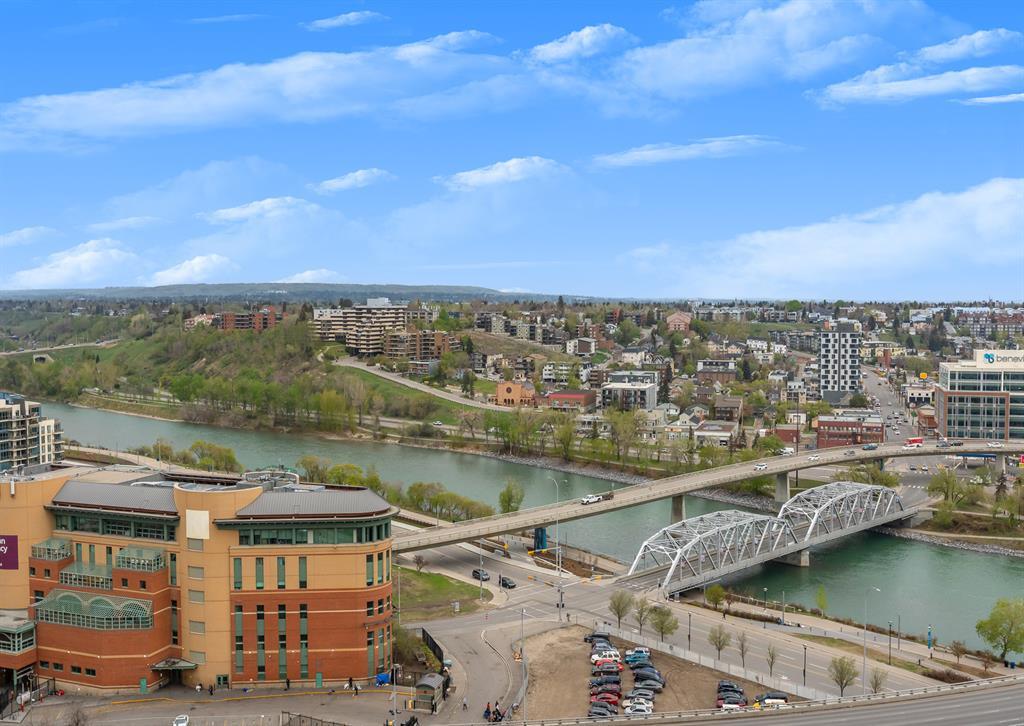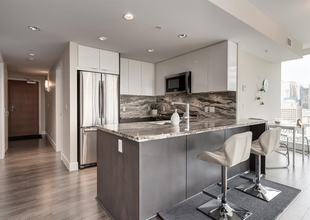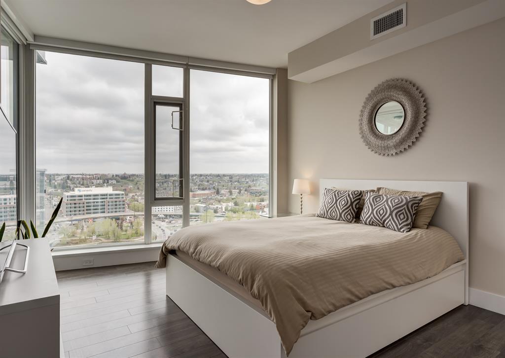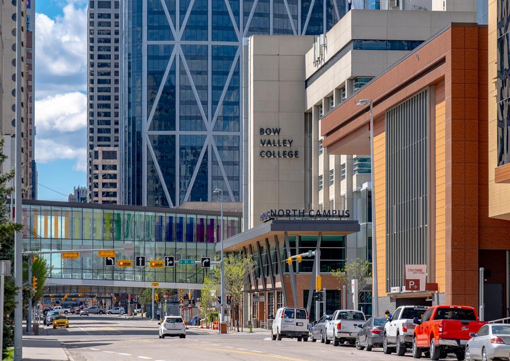 We're extremely proud to present this specatacular executive corner-unit condo in the amazing Evolution Pulse by Bosa Developments. The East Village is on the rise again with the approval of the new Events Centre, Practice Facility and Stadium for the Calgary Flames. The retrofitting of the Stampede Grounds is vitally important to our tourism and downtown vibrance, so why not own a piece of it, just steps away! There will never be another building to block the view and the floor to ceiling windows flood your space with sunlight. The creature comforts include in-floor heating, air conditioning, granite counters/backsplashes, Jenn-air appliances, upgraded vinyl plank flooring, a big balcony, storage locker, and even a huge parking stall that could fit 2 small cars or 1 big one. With 2 bedrooms, in-suite laundry, a gourmet kitchen, large eating bar, and 2 bathrooms, this immaculate unit offers it all! The master suite is an oasis featuring double closets and a 5-piece ensuite bath with deep soaker tub and tiled shower. Building amenities include 24-HOUR CONCIERGE/SECURITY, a fitness room with steam room and sauna, rooftop terrace with BBQ stations and fire pits, and a party room with pool table/TV’s/kitchen. What a time to be a buyer in the Calgary condo market, the value is unprecedented, and we'd love to accommodate your showings! (id:22211)