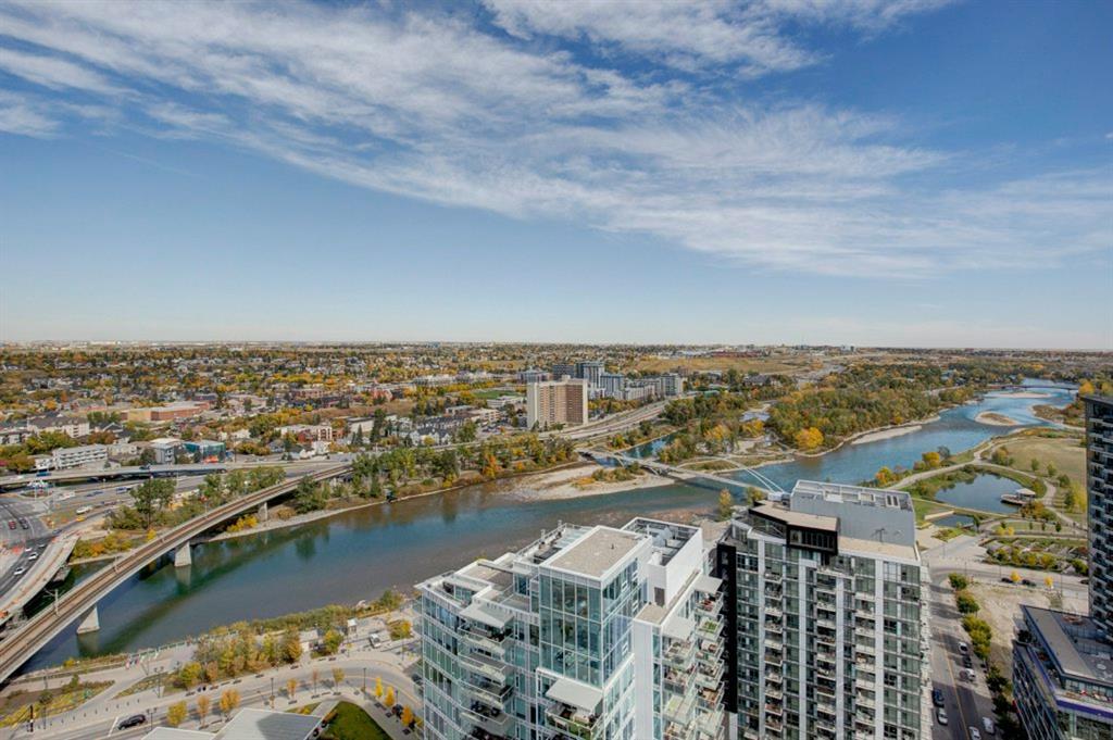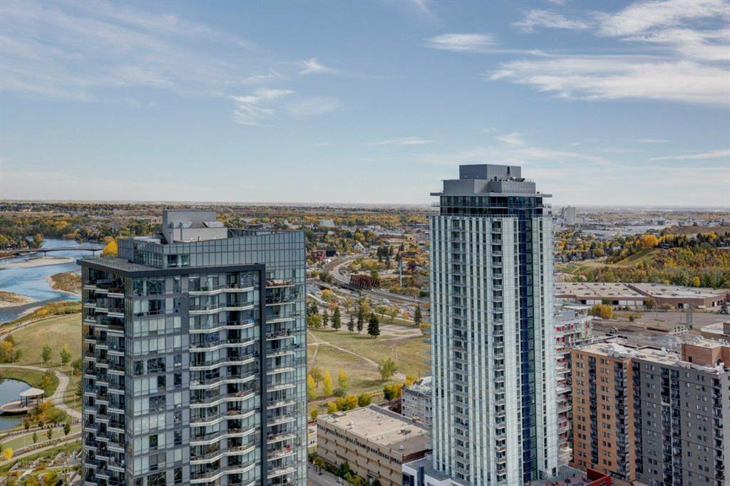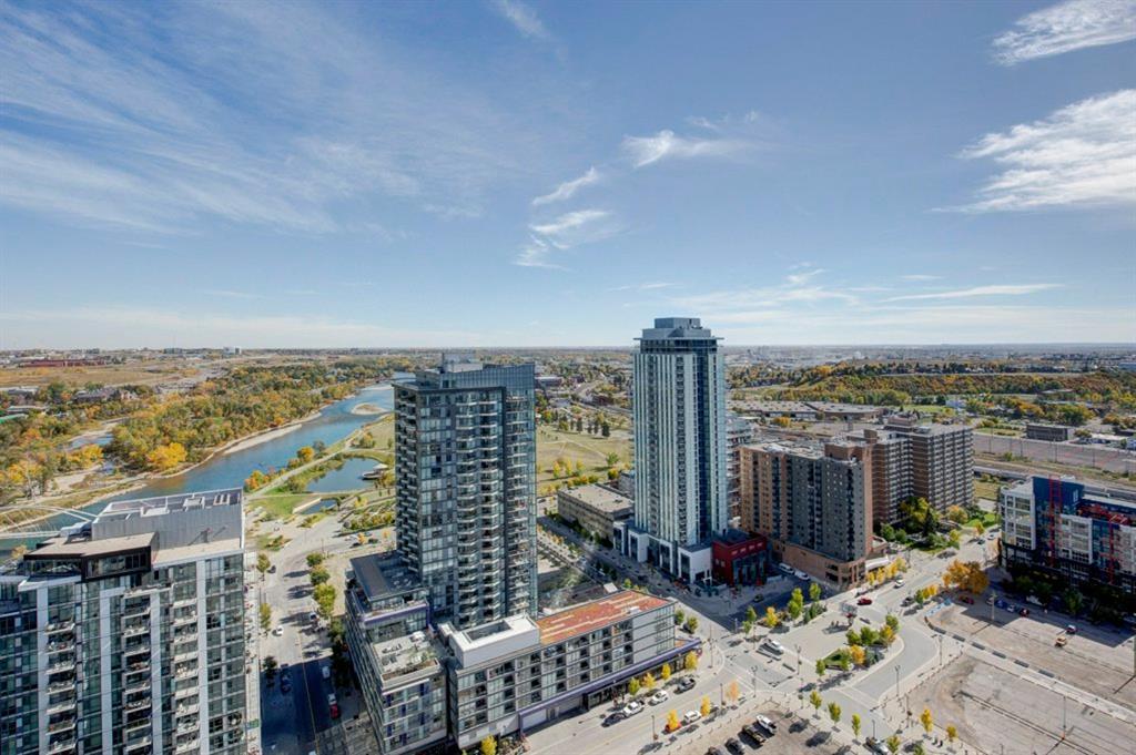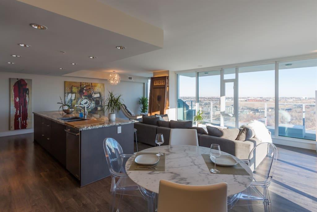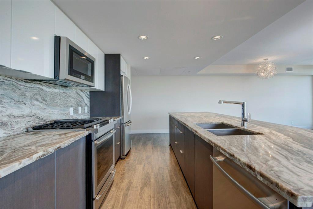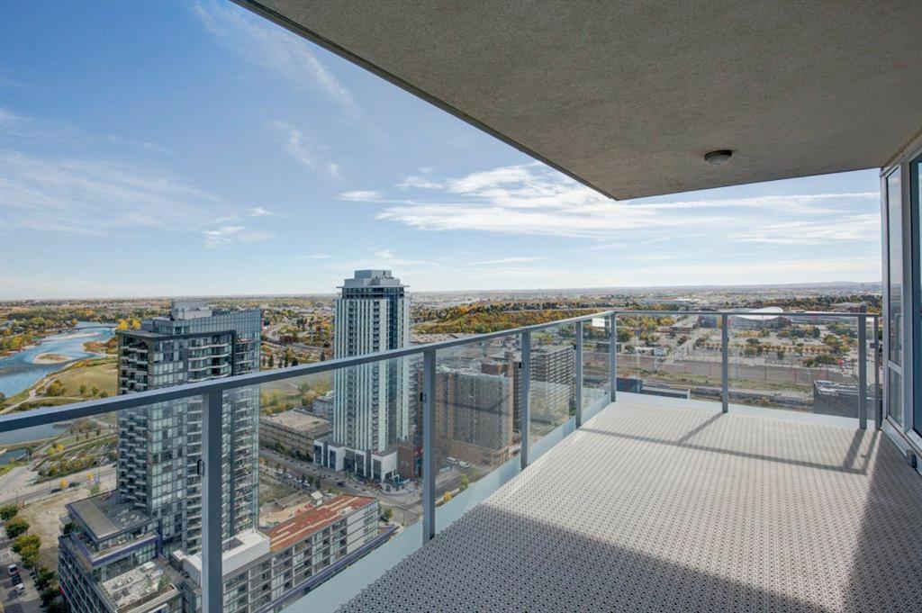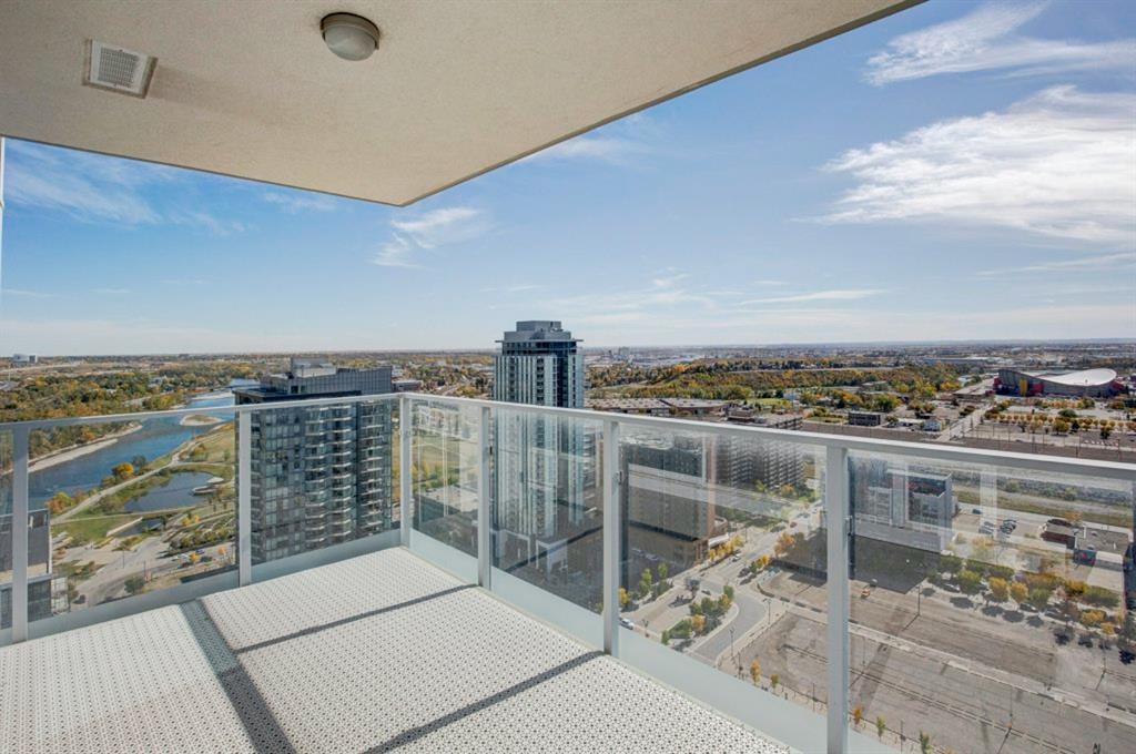 Stunning views from this two bedroom and den Sub-Penthouse 'Sky Suite' in Embassy Bossa's Evolution. Located in trendy East Village, 'connected to downtown with a distinct style of its own,' you can leave your vehicles in the underground tandem parkade and walk to all the amenities there are on offer. Cafe's, pubs, fine dining, river path system, parks, downtown and LRT are steps from your front door. Floor to ceiling windows showcase the Bow River Valley and downtown from the open concept kitchen with 12 foot island, stainless steel appliances and granite counters throughout. Oversized living and dining rooms with access to one of two spacious balconies (169 square feet). Two good size bedrooms, master with ample closet space and a luxurious 5 piece, spa-like ensuite, second bedroom with access to second balcony (93 square feet). For those working from home, there is a den tucked away from the main living space. Finishing throughout is top of the line, sleek and contemporary. Fantastic building with concierge, two gyms, party room and roof top terrace with BBQ. Look no further, this beautiful home completes your inner-city lifestyle. (id:22211)
