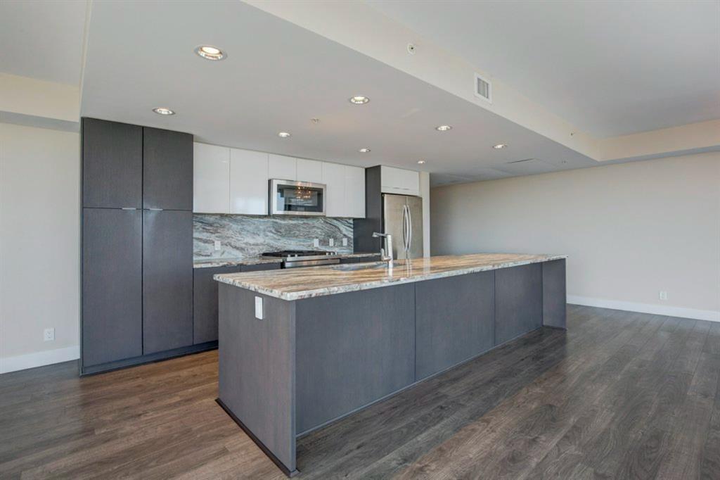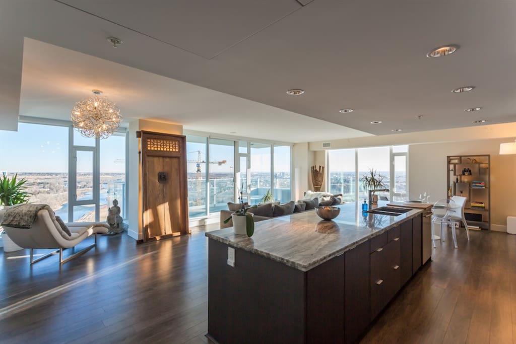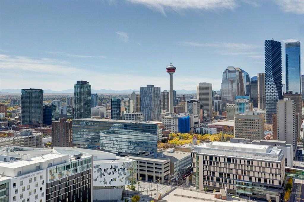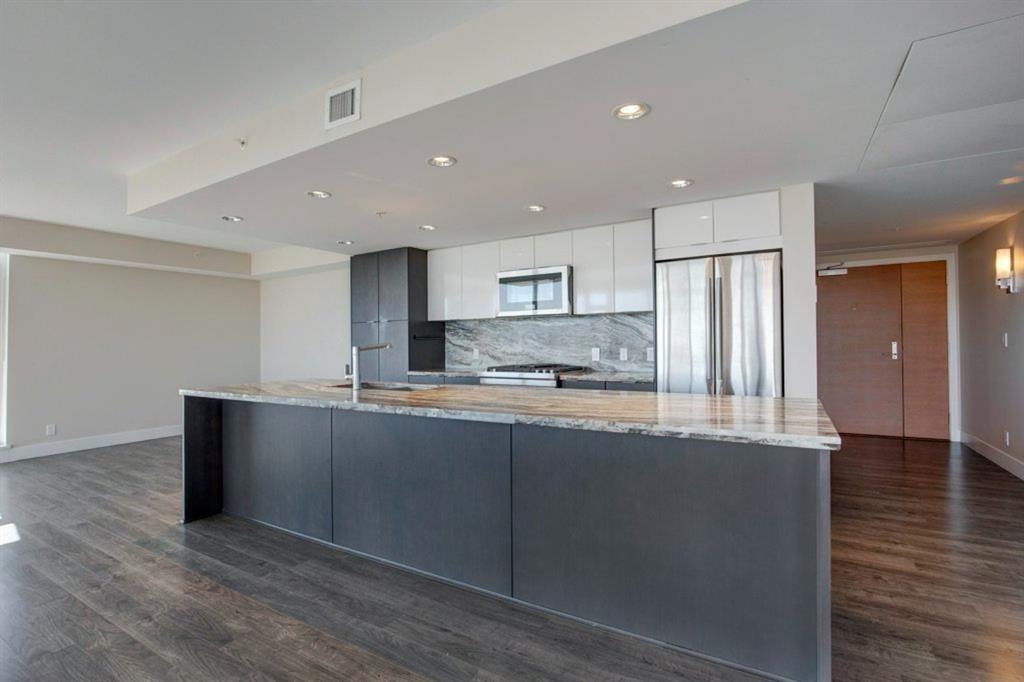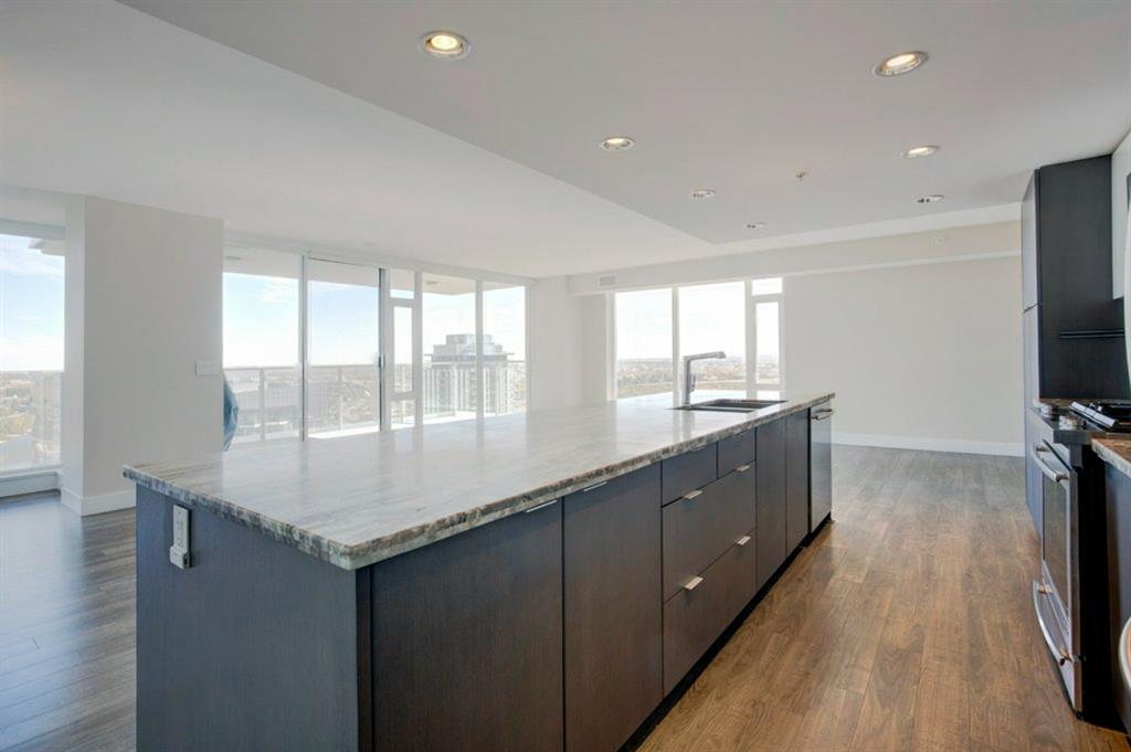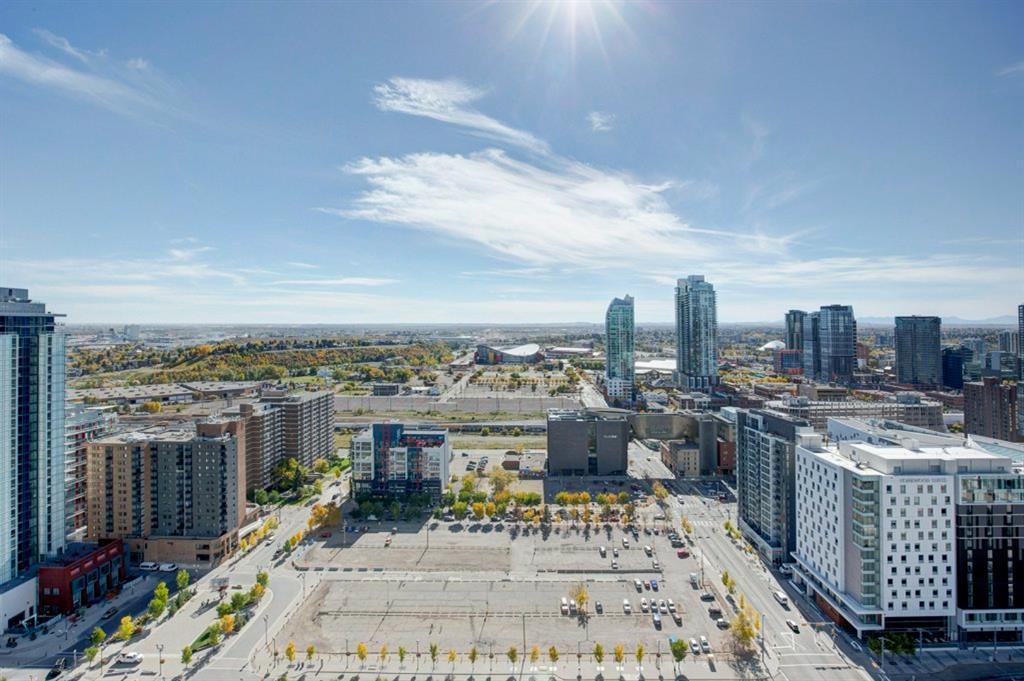 Stunning views from this two bedroom and den Sub-Penthouse 'Sky Suite' in Embassy Bossa's Evolution. Located in trendy East Village, 'connected to downtown with a distinct style of its own,' you can leave your vehicles in the underground tandem parkade and walk to all the amenities there are on offer. Cafe's, pubs, fine dining, river path system, parks, downtown and LRT are steps from your front door. Floor to ceiling windows showcase the Bow River Valley and downtown from the open concept kitchen with 12 foot island, stainless steel appliances and granite counters throughout. Oversized living and dining rooms with access to one of two spacious balconies (169 square feet). Two good size bedrooms, master with ample closet space and a luxurious 5 piece, spa-like ensuite, second bedroom with access to second balcony (93 square feet). For those working from home, there is a den tucked away from the main living space. Finishing throughout is top of the line, sleek and contemporary. Fantastic building with concierge, two gyms, party room and roof top terrace with BBQ. Look no further, this beautiful home completes your inner-city lifestyle. (id:22211)
