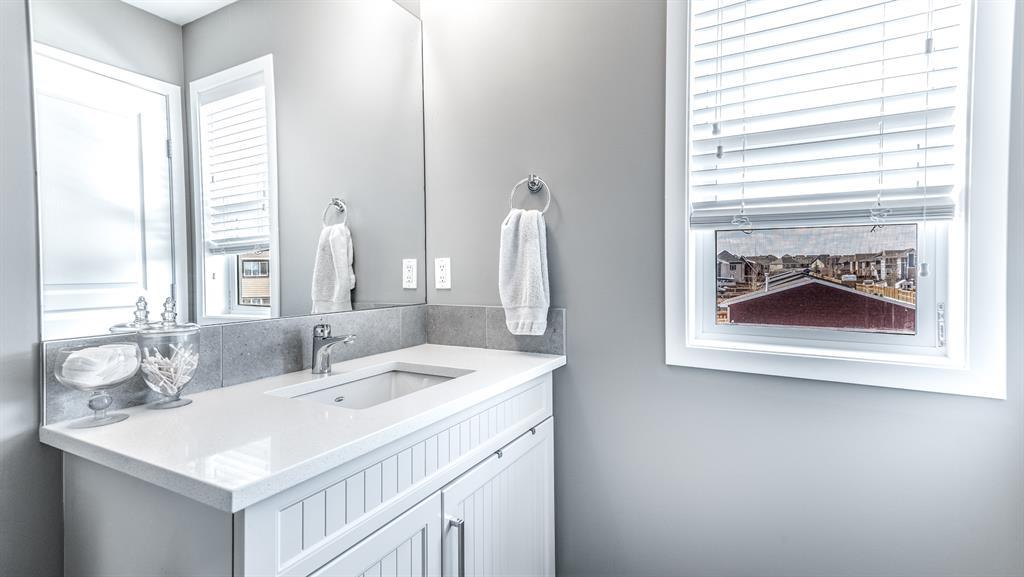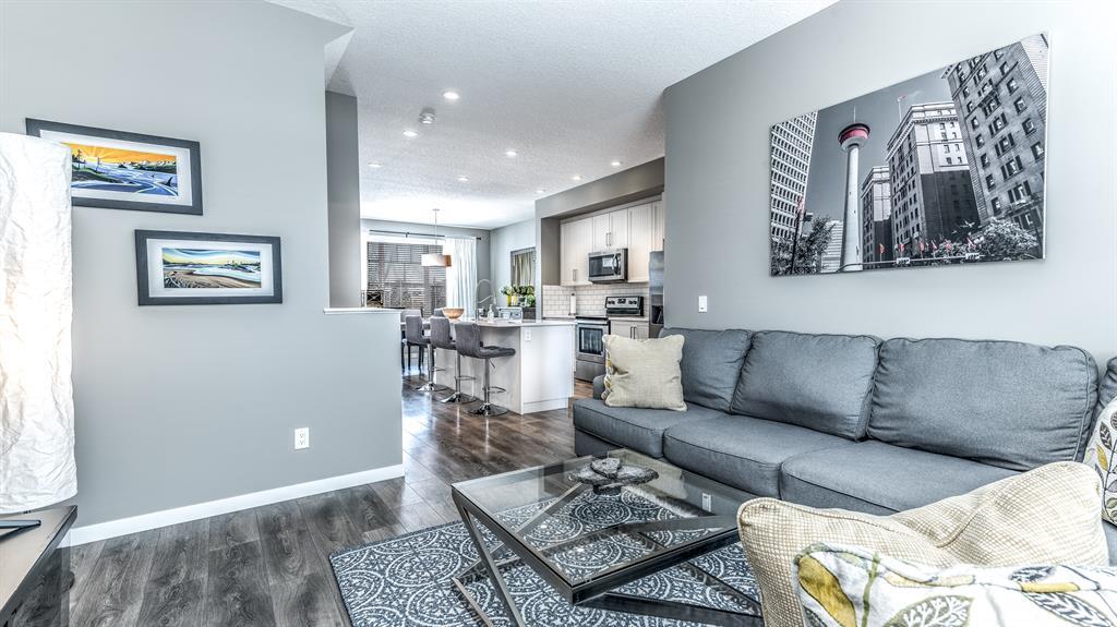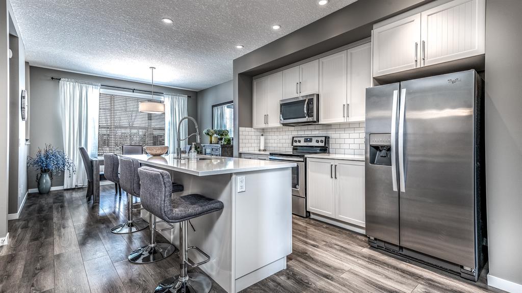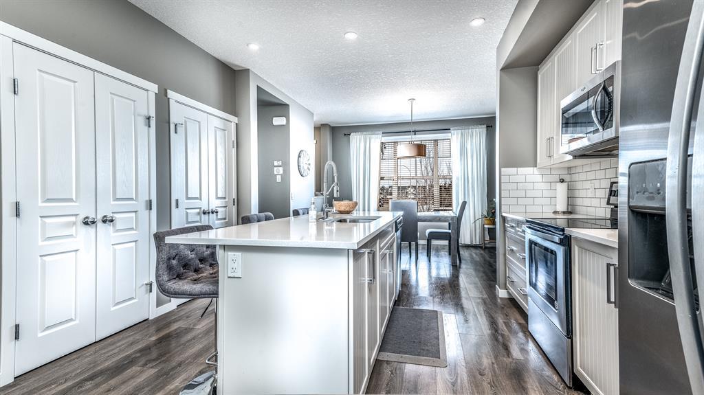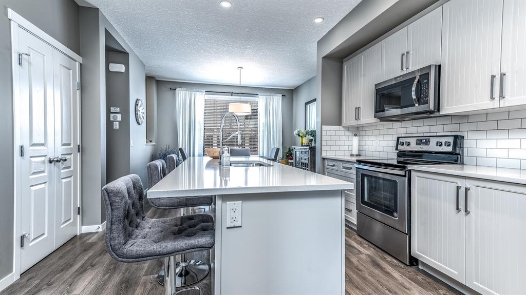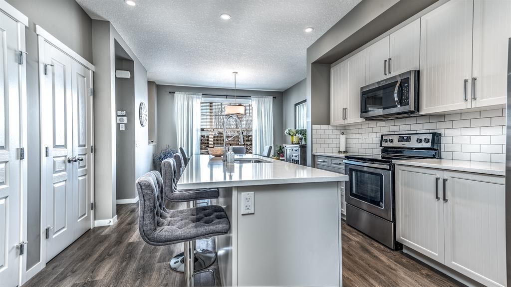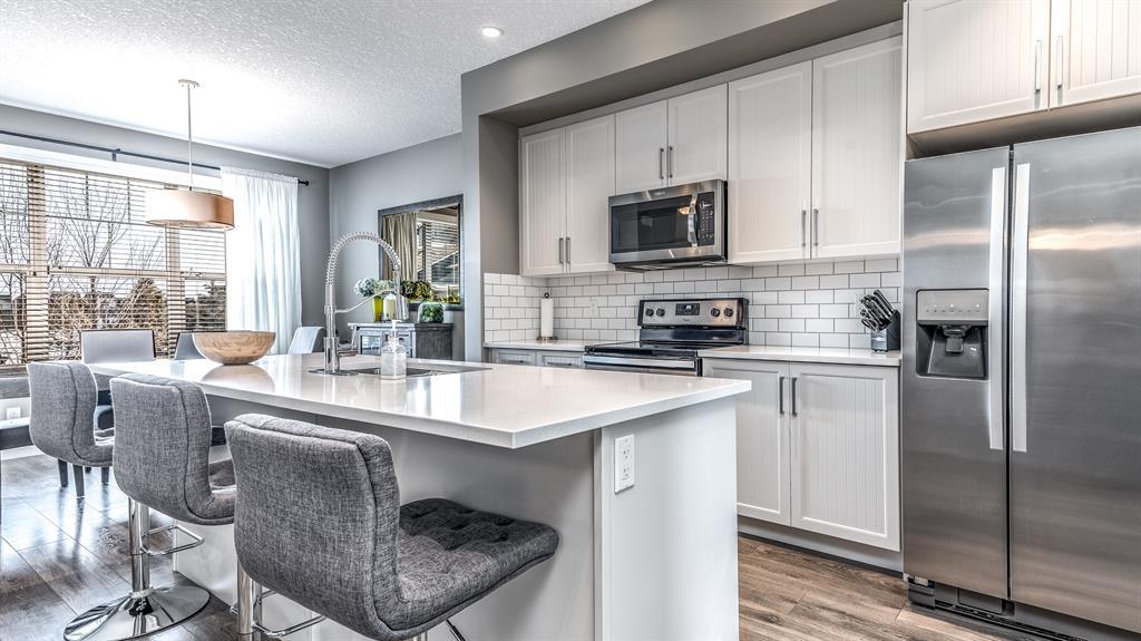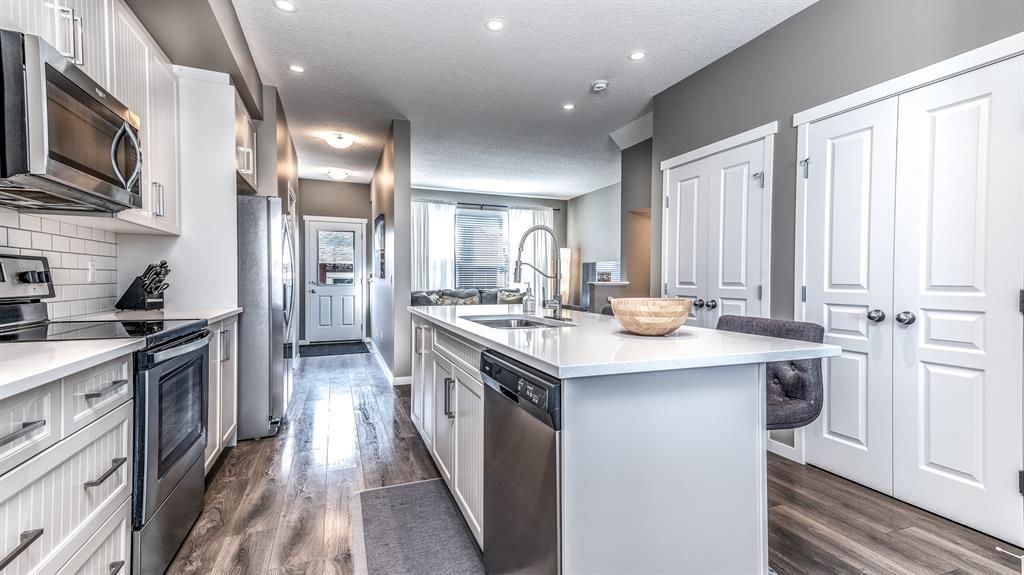 Mahogany Lake home. Excellent better than new semi detached with many upgrades. Three bedroom plan, 2.5 bathrooms, open main floor plan, spacious rear great room, open kitchen with island, quartz countertops,, lots of cabinetry and pantry (soft close drawers), upgraded flooring (carpets, tile, vinyl plank), updated recessed lighting, knock down ceilings, 9 ft main floor ceiling, great lower level pre plan for 4th bedroom, family room and RIP for future bathroom, large lower level window, fronts onto park and playground, 21x20 ft detached garage with insulated walls , double tiered rear deck with treated deck boarding (id:22211)