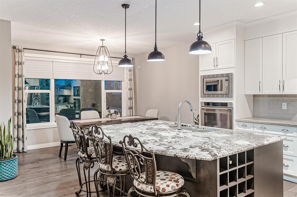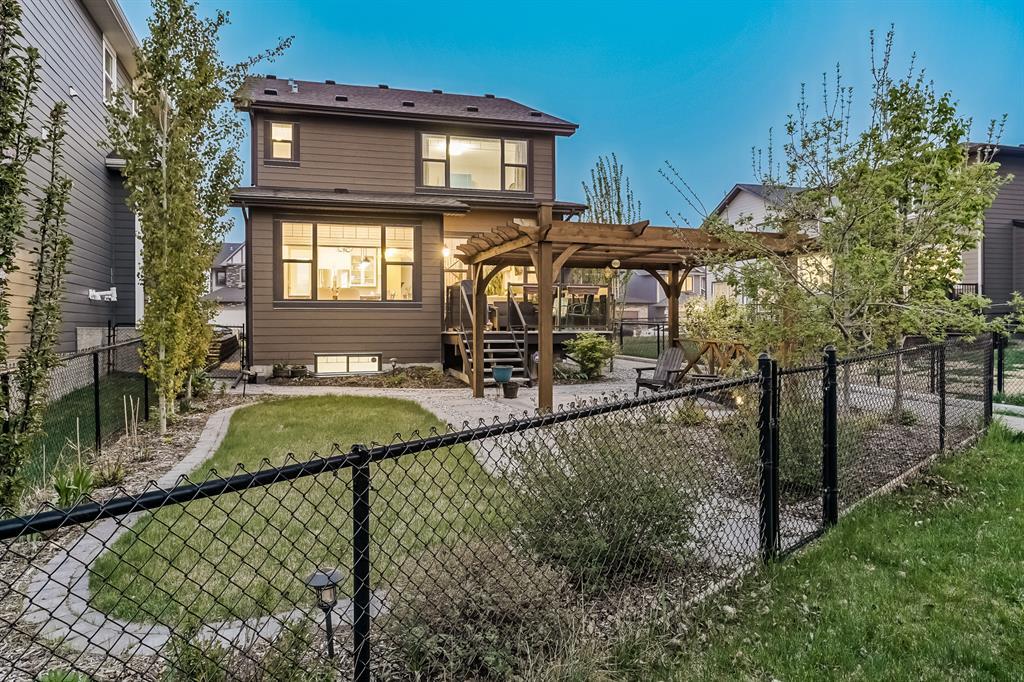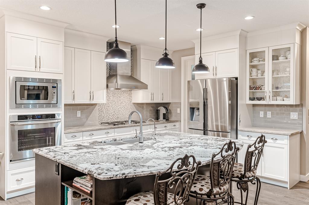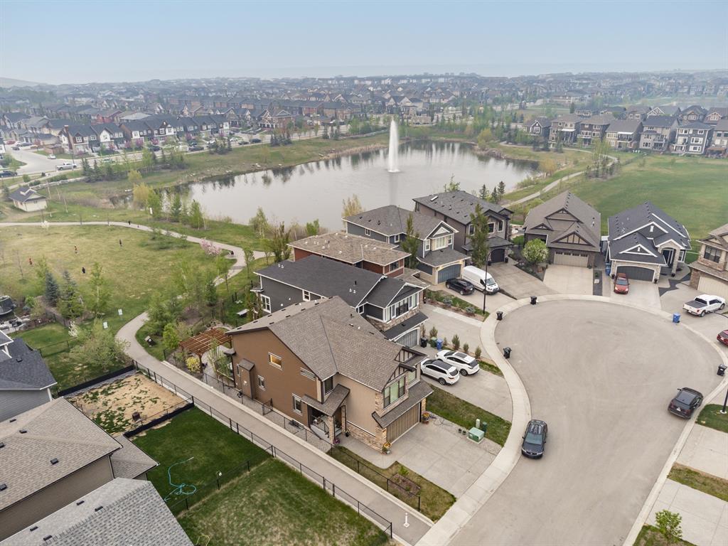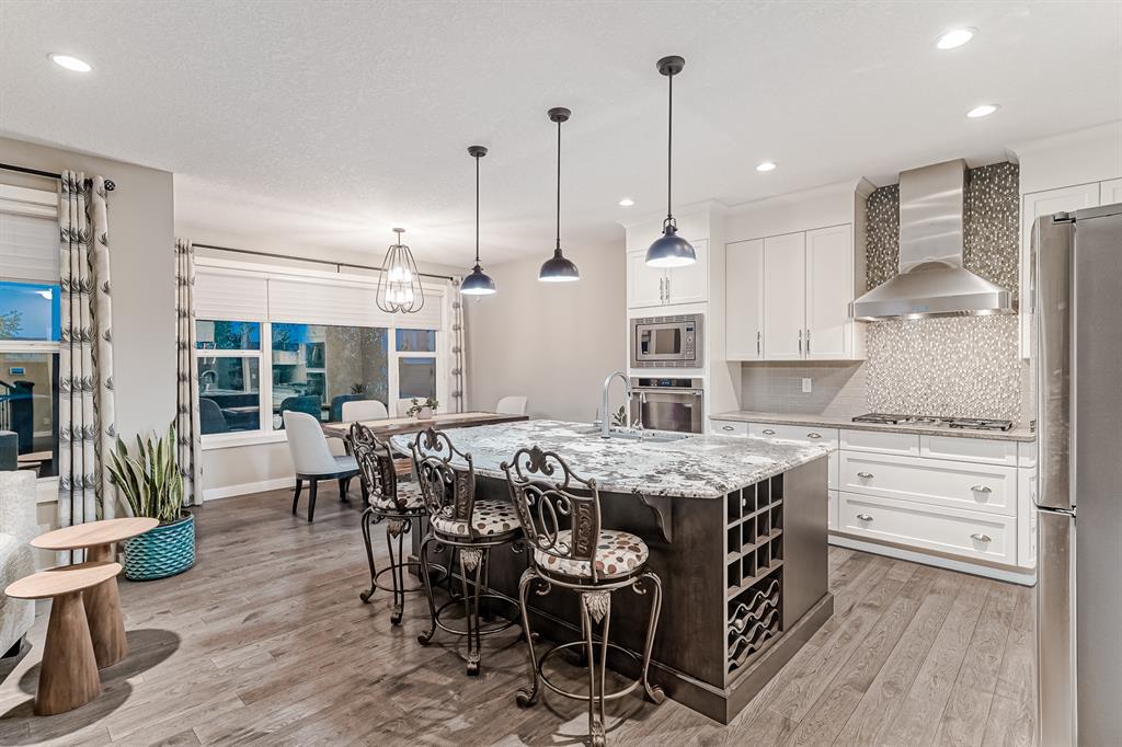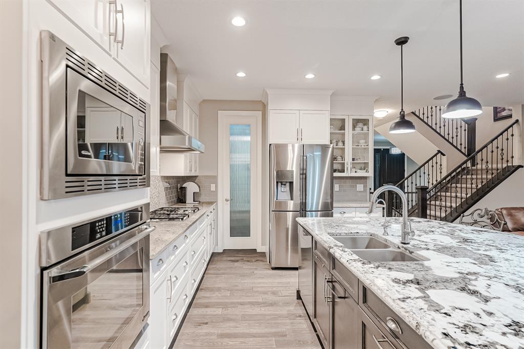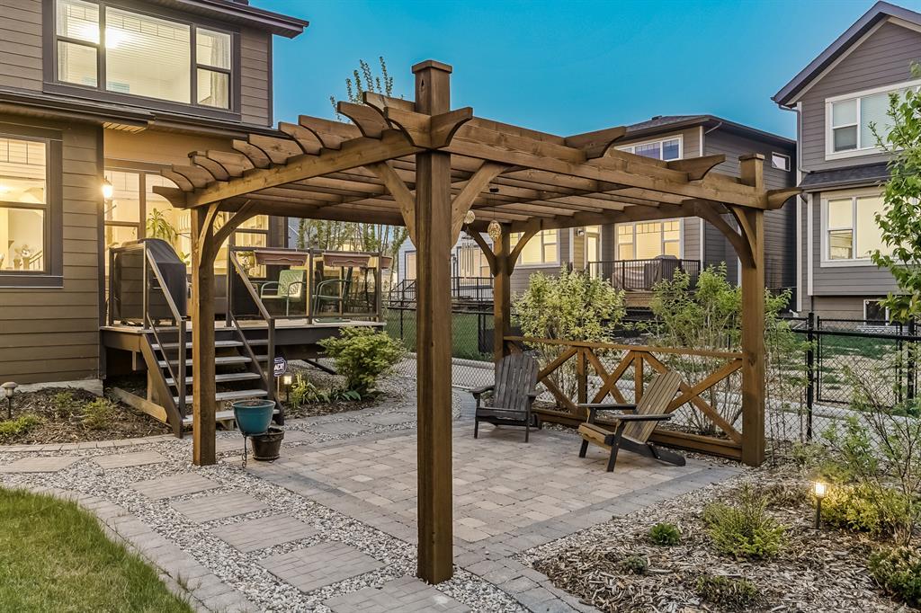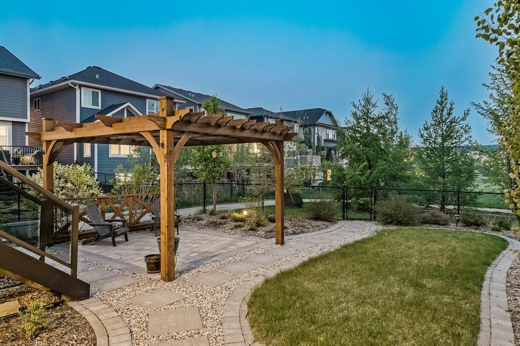 Welcome to this stunning, highly upgraded home built in 2015, offering an impressive total of 3,392 square feet of developed living space, including the basement. From the moment you arrive, the appealing exterior catches your eye with its mixture of James Hardie Board siding and stone, accentuated by upgraded window details featuring rich brown frames. As you step onto the exposed aggregate driveway and walkway, you'll notice the attention to detail, like the eight-foot door next to the ornate glass insert and the epoxy coating on the front door landing (also on the garage floor). The spacious and illuminated front foyer welcomes you with its grandeur. Elegance continues with hardwood flooring throughout most of the main floor and ultra-wide windows in the living room, nook, and bonus room. Prepare to be impressed by the extensively upgraded kitchen, boasting floor-to-ceiling finished shaker cabinetry in two tones with soft close drawers & cabinets (also in all bathrooms). The prestigious kitchen island showcases premium curved and beveled granite atop quality millwork, creating a focal point worthy of admiration. The kitchen also offers a high-end appliance package, including a Miele dishwasher, a Samsung four-panel refrigerator, a Miele built-in gas cooktop, and a built-in oven and microwave. Clever storage solutions are eye-catching, with enhanced titanium shelving in the walk-through pantry & all bedroom & broom closets. In addition, the mudroom features locker-style built-in storage with coat hooks & another closet with two extra rows of shoe racks. If you work from home, the pocket office, with its built-in features, provides a functional & organized workspace. Upstairs, an extra-wide hallway separates three bedrooms, two full bathrooms, a laundry room, & a bonus room with a step-down for extra ceiling height. The primary bedroom is a peaceful retreat with its large picture window overlooking the landscaped backyard & park. Pamper yourself in the five-piece e nsuite bathroom with double vanity, granite countertops, a separate soaker tub, and a spacious walk-in shower with tile & stone walls. Note the ceiling-height vanity mirrors with light fixture cutouts & sandblasted edges for a luxurious look. Additional features of this beautiful home include upgraded lighting, an open railing with beveled wood & iron spindles, a Sonos-controlled three-zone built-in speaker system, and Hunter-Douglas Silhouette blinds on the main floor. The basement, with luxury vinyl flooring, has a tile-surrounded gas fireplace in the spacious living area, a full bathroom, and an additional bedroom. Step outside into the backyard oasis, featuring a deck with glass railings & a handsomely stained pergola above a brickwork sitting area - perfect for enjoying the outdoors & entertaining guests. This home also comes with a premium Kinetico water system, providing excellent drinking water & smooth, soft water to pamper your skin while increasing the longevity of your water-fed appliances. (id:22211)