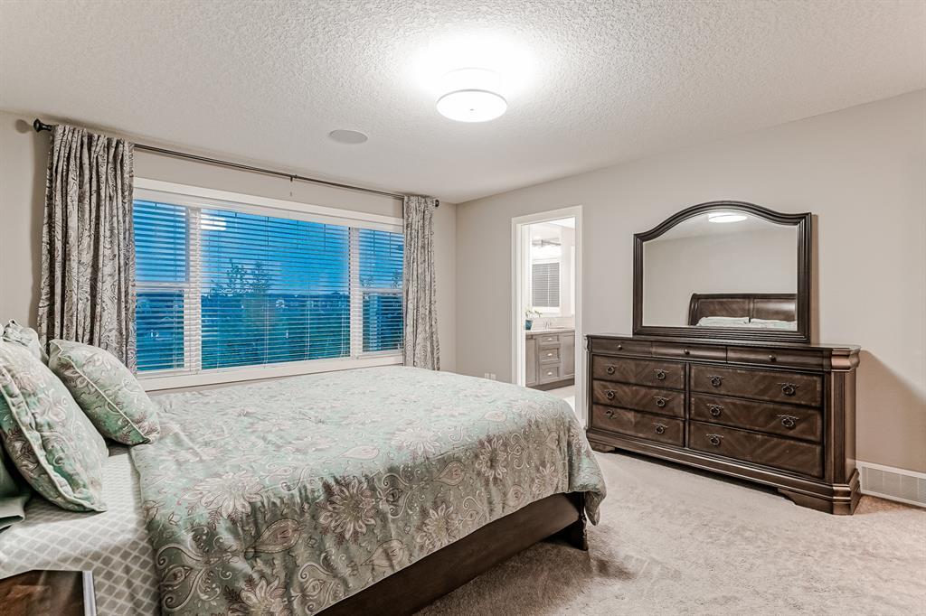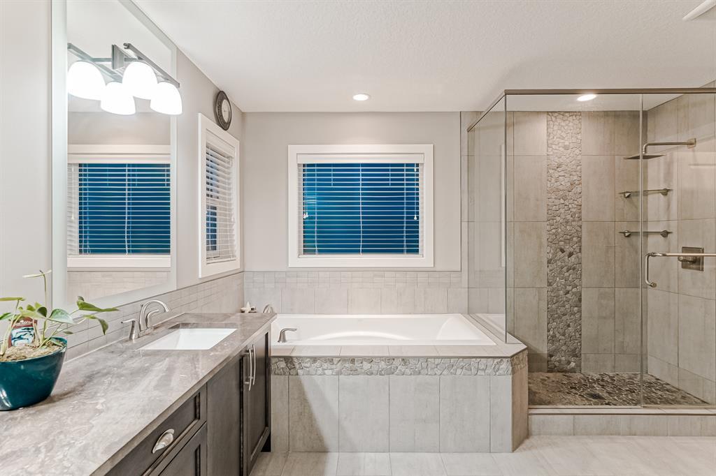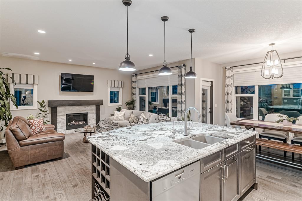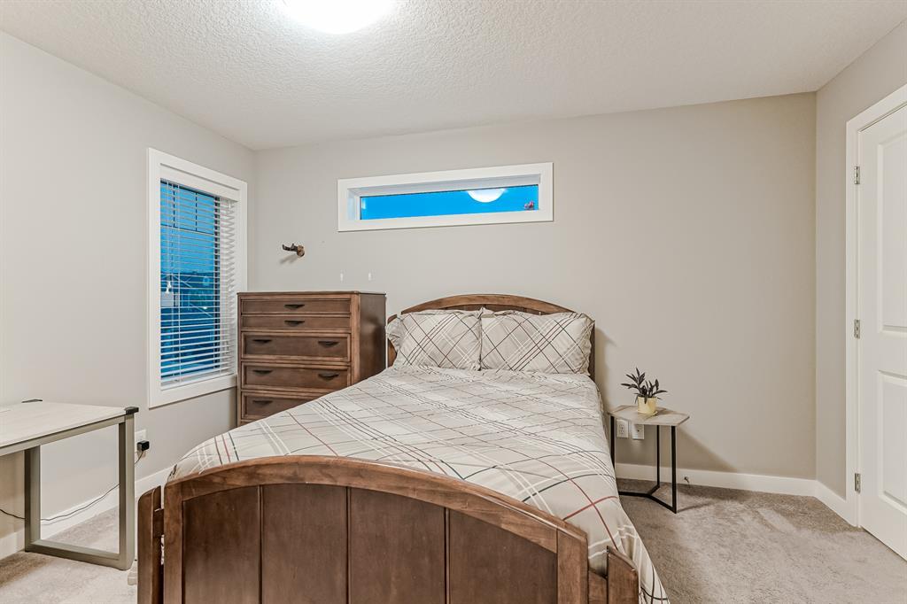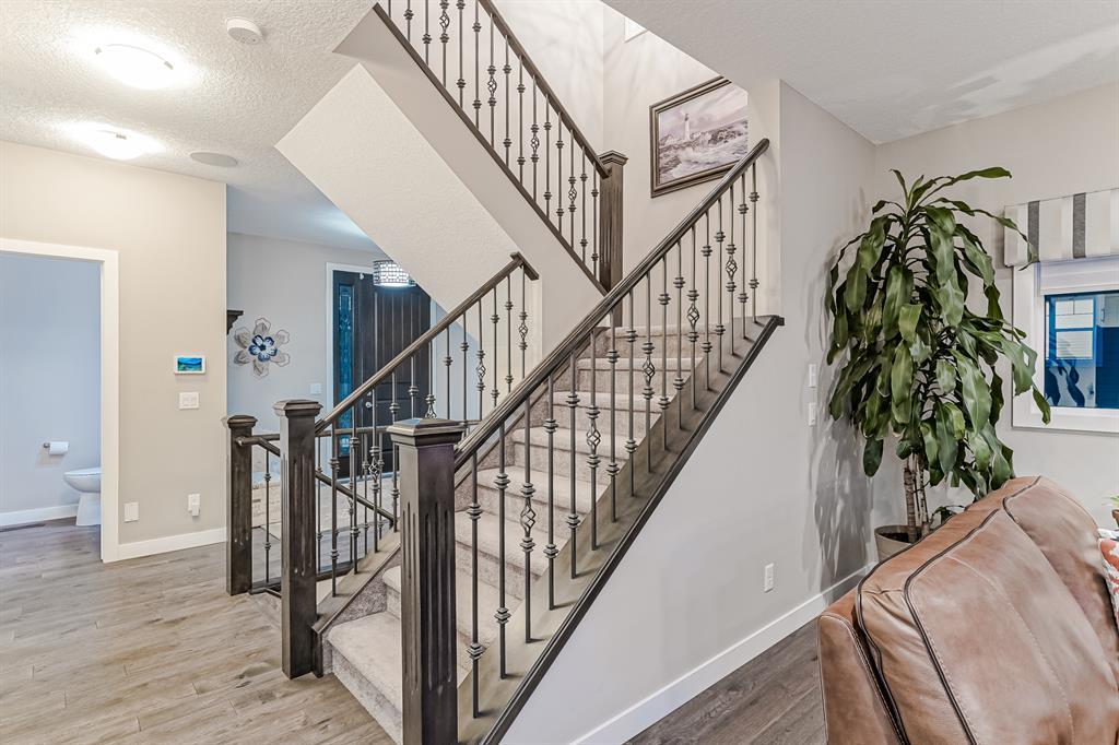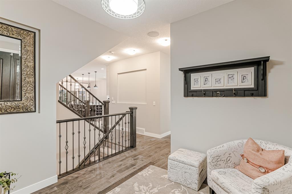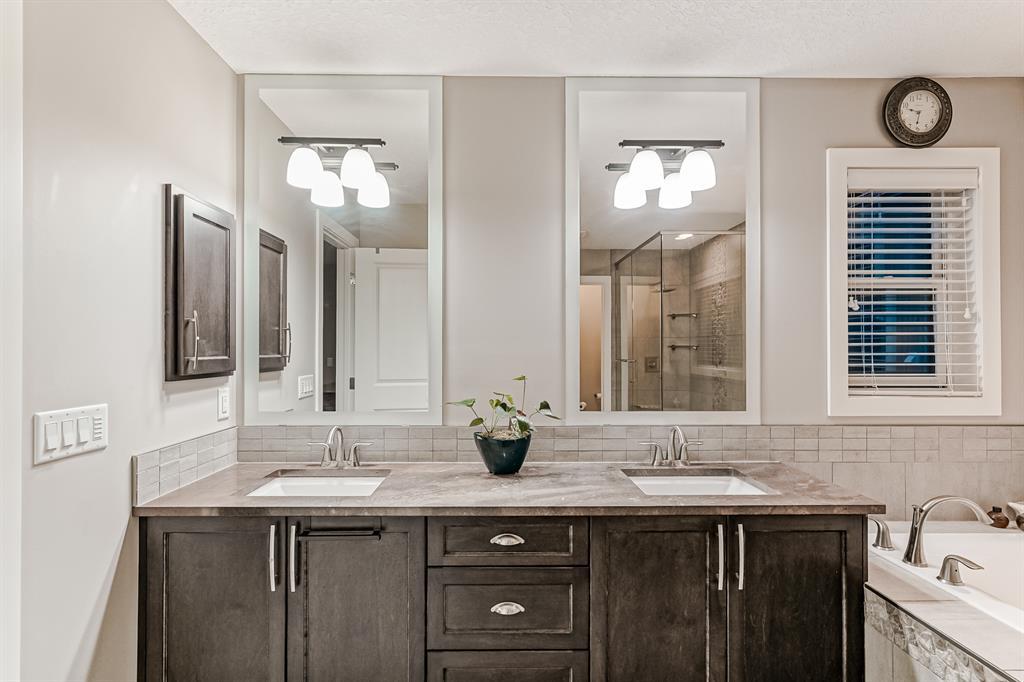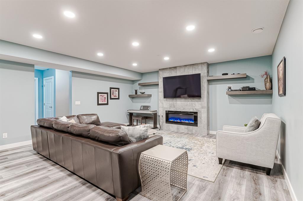 Welcome to this stunning, highly upgraded home built in 2015, offering an impressive total of 3,392 square feet of developed living space, including the basement. From the moment you arrive, the appealing exterior catches your eye with its mixture of James Hardie Board siding and stone, accentuated by upgraded window details featuring rich brown frames. As you step onto the exposed aggregate driveway and walkway, you'll notice the attention to detail, like the eight-foot door next to the ornate glass insert and the epoxy coating on the front door landing (also on the garage floor). The spacious and illuminated front foyer welcomes you with its grandeur. Elegance continues with hardwood flooring throughout most of the main floor and ultra-wide windows in the living room, nook, and bonus room. Prepare to be impressed by the extensively upgraded kitchen, boasting floor-to-ceiling finished shaker cabinetry in two tones with soft close drawers & cabinets (also in all bathrooms). The prestigious kitchen island showcases premium curved and beveled granite atop quality millwork, creating a focal point worthy of admiration. The kitchen also offers a high-end appliance package, including a Miele dishwasher, a Samsung four-panel refrigerator, a Miele built-in gas cooktop, and a built-in oven and microwave. Clever storage solutions are eye-catching, with enhanced titanium shelving in the walk-through pantry & all bedroom & broom closets. In addition, the mudroom features locker-style built-in storage with coat hooks & another closet with two extra rows of shoe racks. If you work from home, the pocket office, with its built-in features, provides a functional & organized workspace. Upstairs, an extra-wide hallway separates three bedrooms, two full bathrooms, a laundry room, & a bonus room with a step-down for extra ceiling height. The primary bedroom is a peaceful retreat with its large picture window overlooking the landscaped backyard & park. Pamper yourself in the five-piece e nsuite bathroom with double vanity, granite countertops, a separate soaker tub, and a spacious walk-in shower with tile & stone walls. Note the ceiling-height vanity mirrors with light fixture cutouts & sandblasted edges for a luxurious look. Additional features of this beautiful home include upgraded lighting, an open railing with beveled wood & iron spindles, a Sonos-controlled three-zone built-in speaker system, and Hunter-Douglas Silhouette blinds on the main floor. The basement, with luxury vinyl flooring, has a tile-surrounded gas fireplace in the spacious living area, a full bathroom, and an additional bedroom. Step outside into the backyard oasis, featuring a deck with glass railings & a handsomely stained pergola above a brickwork sitting area - perfect for enjoying the outdoors & entertaining guests. This home also comes with a premium Kinetico water system, providing excellent drinking water & smooth, soft water to pamper your skin while increasing the longevity of your water-fed appliances. (id:22211)