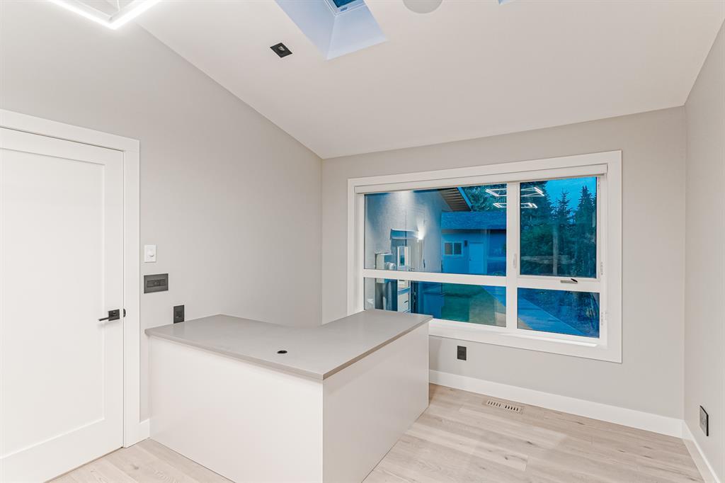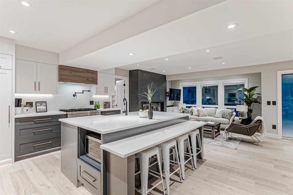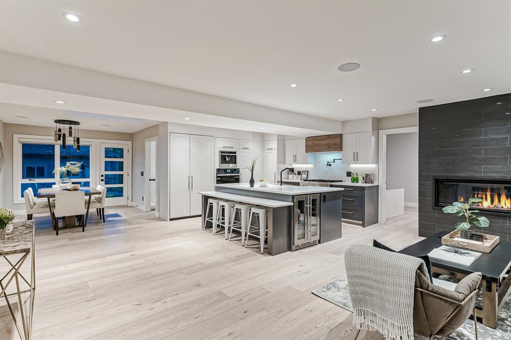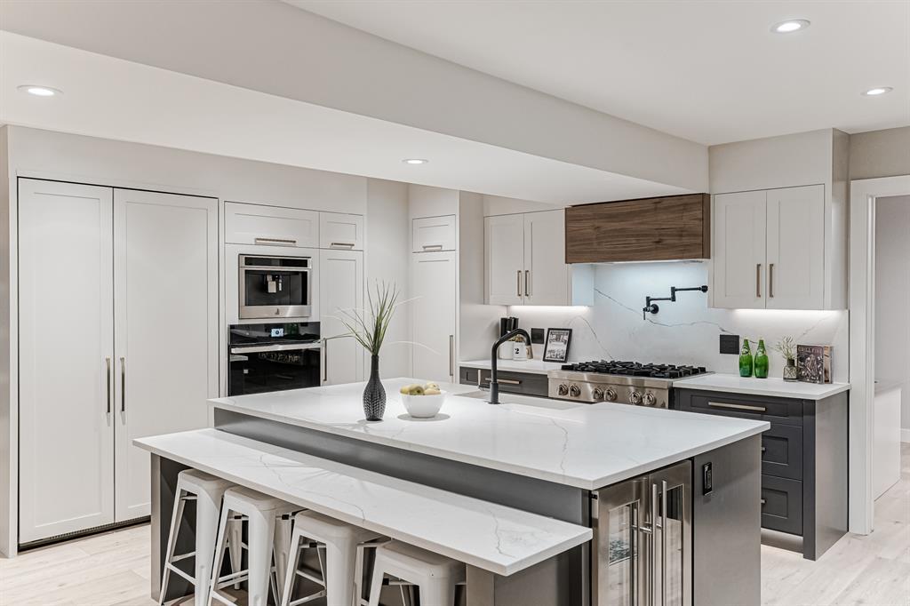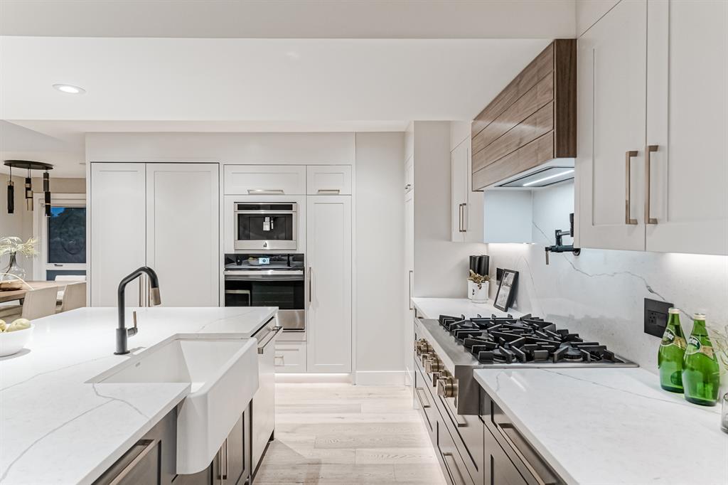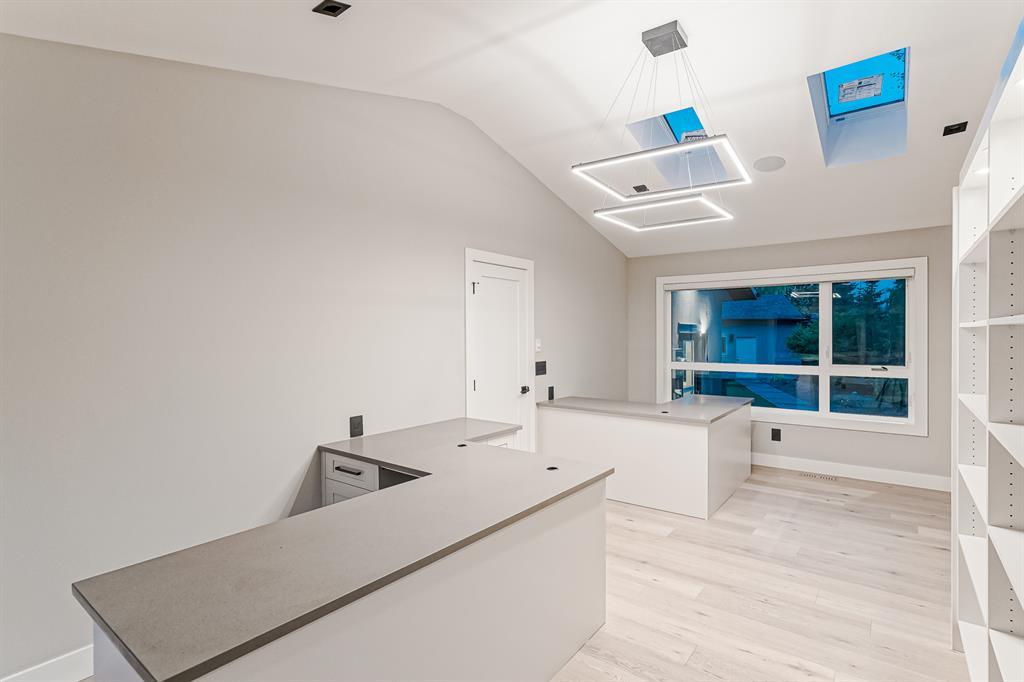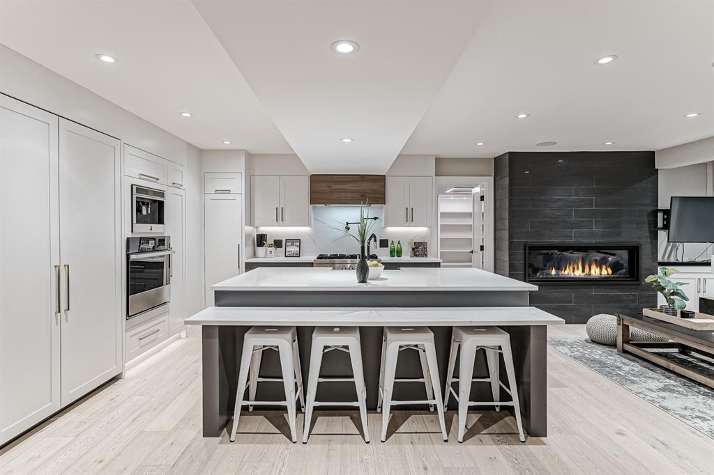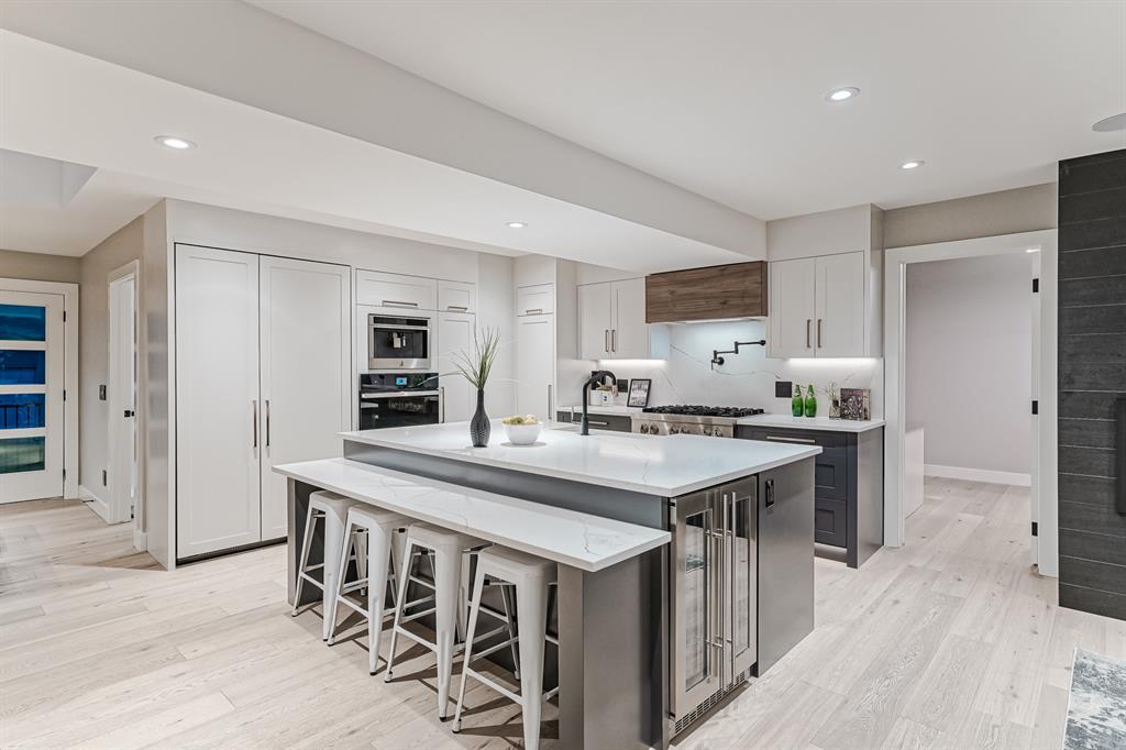 Open House July 22, 1-3 PM. 707 Imperial Way SW is a charming single-family home located in the highly desired community of Britannia. This property offers a comfortable and inviting living space, ideal for individuals or families seeking a cozy and well-maintained residence. Completely gutted and renovated, modern and timeless exterior, all new interior including plumbing, new electrical, new triple car garage with 220 volt and electric car charging station already put in for you. Upon entering the house you step into a well-lit open floor plan, welcomed by natural light with a total of 5 skylights. Engineered hardwood throughout the main floor, the living room features a stunning T60-inch linear gas fireplace. Chef's dream kitchen offers a combination of style and functionality. Exquisite quartz countertops, full stone backsplash, premium 6-Burner gas range, pot filler, farmhouse Silgranit sink, and Jenn-air refrigerator with panels all blending in seamlessly with the surrounding cabinetry. Complete with a beverage cooler, LED under cabinet, and kick lighting. The office features custom desks with matte quartz desktops, a vaulted ceiling with skylights for ample natural light, a custom bookcase with lighting, a separate entrance, and Ethernet plug-ins at each desk with an overhead access point. The powder room features a decorative wall-mount faucet on a black stone backsplash with custom Walnut inlays, exuding a stylish and sophisticated ambiance. The main primary bedroom offers a custom built-in walk-in closet with LED underlighting, providing functionality and a touch of elegance. Its en-suite is designed for relaxation and luxury, featuring a soaker tub, a spacious steam shower with rainfall shower head and body jets, a niche with LED lighting, heated floors, and dual vanities. Similarly, the second primary bedroom includes a cabinet with LED lighting and heated floors, ensuring comfort and sophistication in this private retreat. The basement offers two bedro oms, a family room, and a wet bar with a vanity, beverage cooler, and custom underlit LED shelving. The family room is a "home theatre", prepped for surround sound with built-in ceiling speakers, a laundry area with stacked appliances and storage, a custom linen closet, and bedrooms with roughed-in TV plugs/ethernet and custom closet built-ins with LED lighting. Additionally, there is a washroom in the basement with heated floors, body jets, and a shower wand. (id:22211)