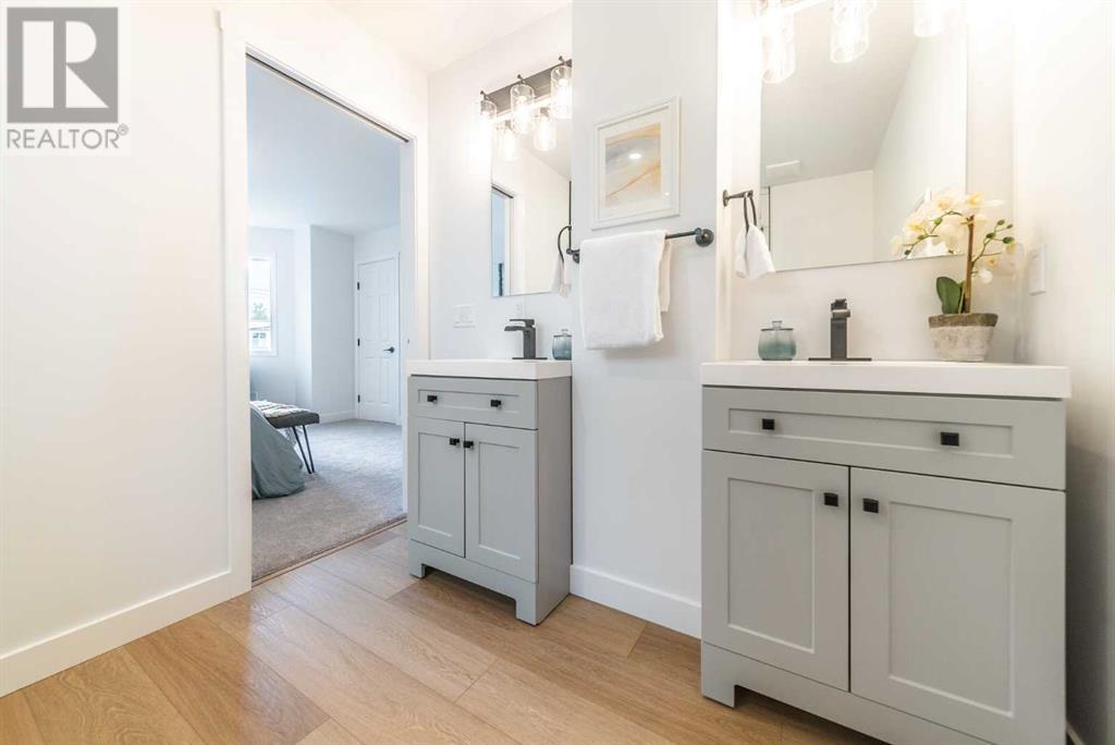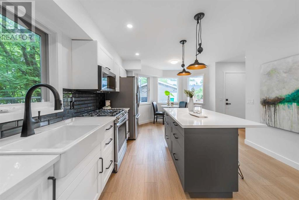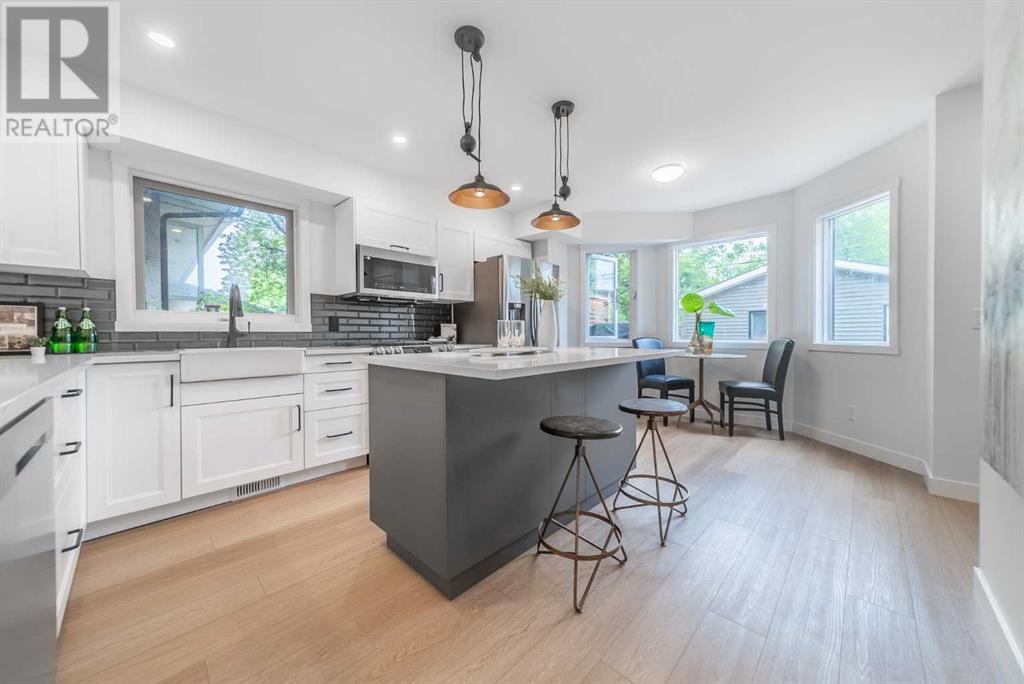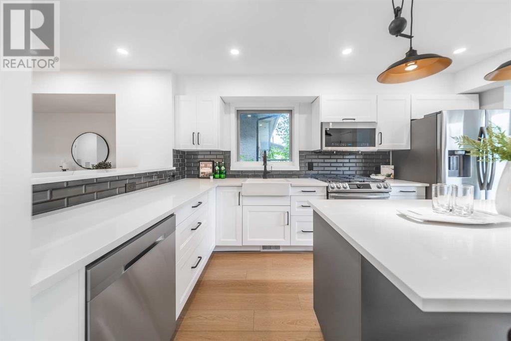 Fully renovated 3-bedroom home. With 2 full and 2 half baths, a spacious rec room with wet bar, and an oversized double detached garage, this property has it all. As you enter, you'll be greeted by the elegance of engineered hardwood flooring on the main floor, large windows bathing the rooms in natural light, and a cozy living room featuring a beautiful fireplace. The dining room offers access to the rear deck, perfect for enjoying outdoor meals. The kitchen is a dream with its large central island, sleek white cabinets, brand new Samsung stainless steel package, and beautiful quartz countertops. Hosting guests is a breeze with the convenient 2-piece bath on this floor. Upstairs, you'll find three bedrooms and a well-appointed shared 4-piece bath. The primary bedroom is a retreat with its own luxurious 4-piece bath, complete with a stunning large format tile shower and dual sinks. The fully finished basement is an entertainment haven, boasting a rec room with wet bar, a den/home office, a convenient 2-piece bath, and laundry facilities. Get ready to embrace the summer in the backyard, featuring a deck and a charming paving stone patio, perfect for hosting gatherings. The oversized double detached garage is fully insulated, ensuring both secure parking and additional storage space. This property is located near exceptional amenities, including the SAIT campus, North Hill shopping, and the picturesque Confederation Park. (id:22211)
