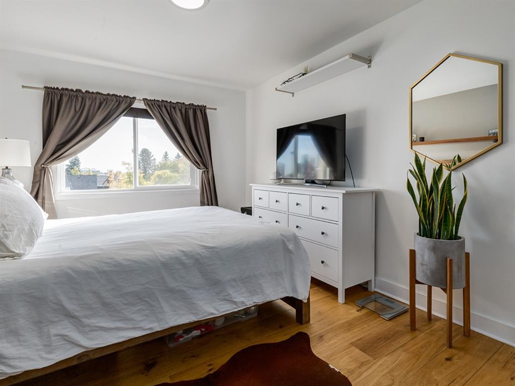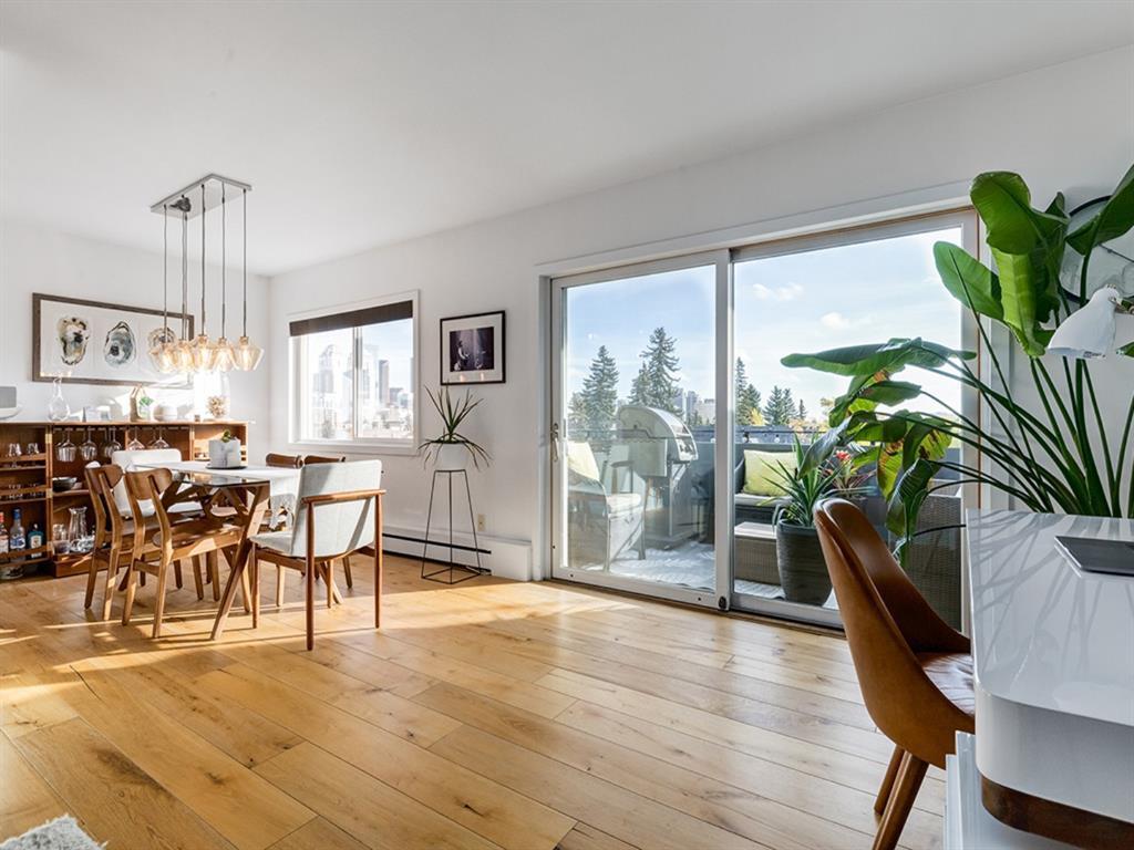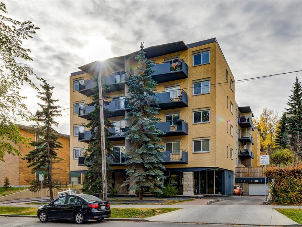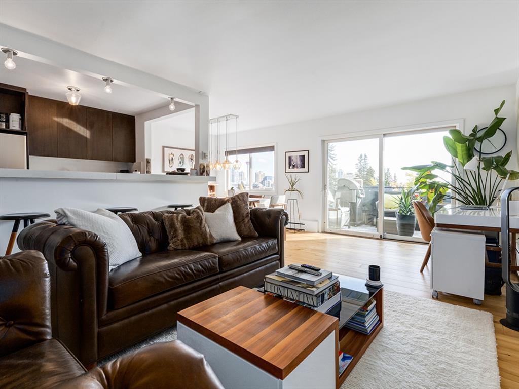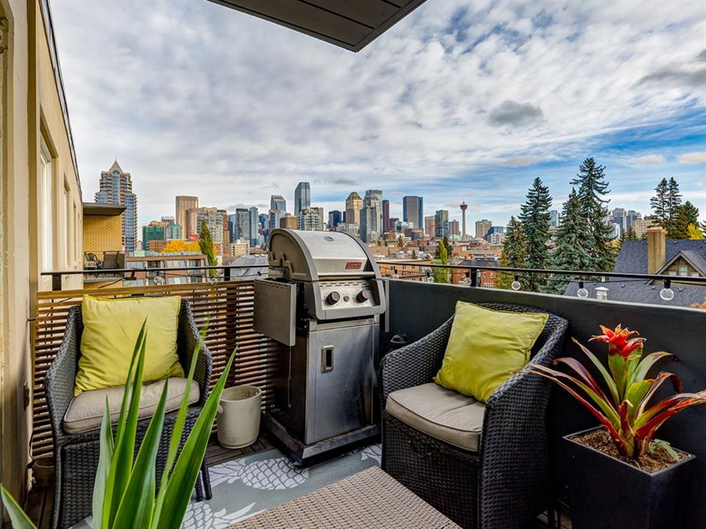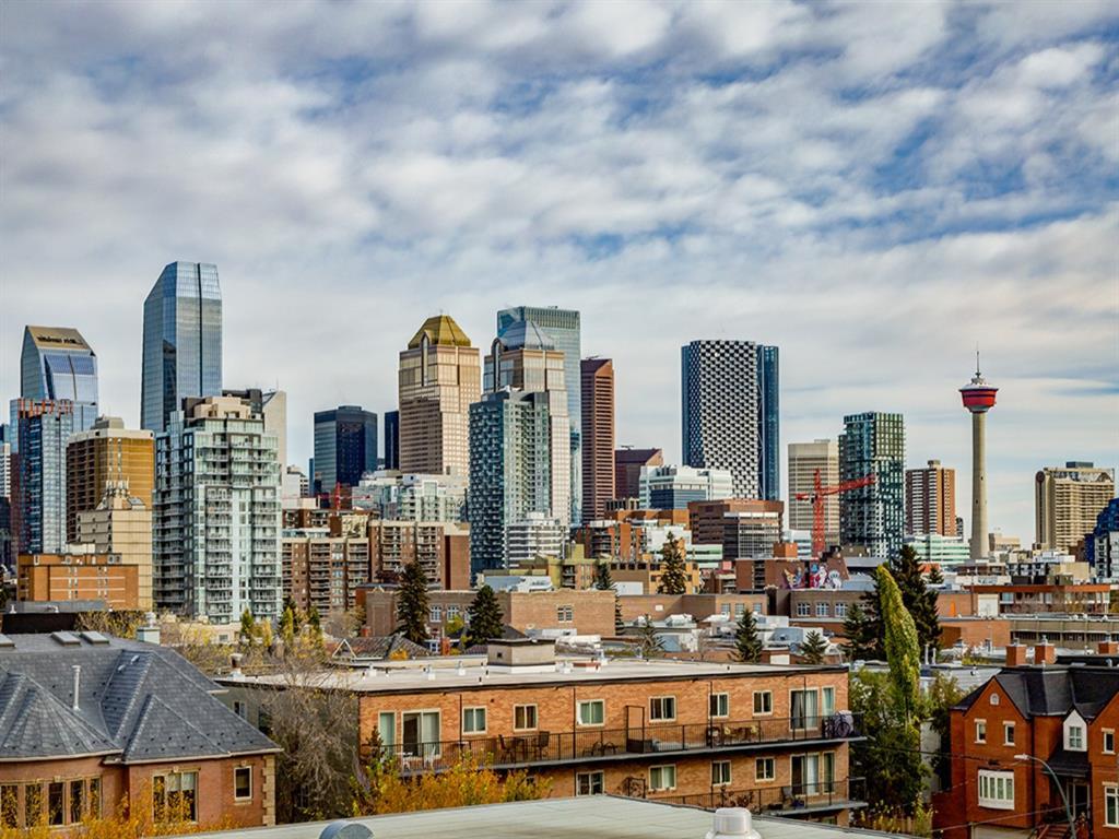 Welcome to this stunning TOP FLOOR two bedroom condo with spectacular views of downtown! This beautifully appointed unit in a CONCRETE building features numerous upgrades throughout. Building is very well managed with a healthy reserve fund (300k+). Wide plank hardwood floors, designer lighting and large windows create a modern, yet warm space. Open concept Denca kitchen boasts plenty of cabinetry, quartz countertops, Jenn-Aire S/S appliances, and under cabinet lighting. Spacious living and dining rooms are perfect for entertaining and feature custom floating walnut shelving. Master bedroom features a walk-in closet with custom built-ins and insuite laundry. Second bedroom is a great size and easily fits a queen bed. 4 piece bath has a beautifully tiled bath/shower combo with a built-in shower caddy, sliding glass doors and infloor heat. Enjoy your morning coffee while taking in the incredible city views from your private balcony. This fantastic condo also comes with underground titled parking and a separate storage unit. Don’t miss out on owning in this well run complex with a healthy reserve in the highly sought after community of Lower Mount Royal, with easy access to all that 17 Avenue, the downtown core and Mission have to offer. Book your private viewing today! (id:22211)