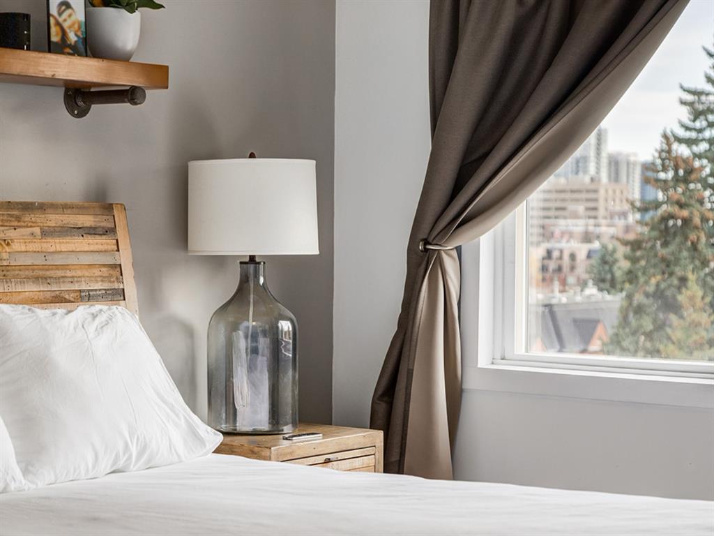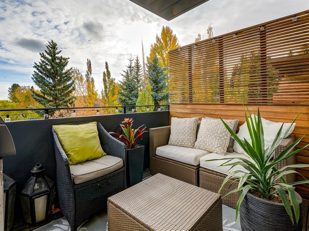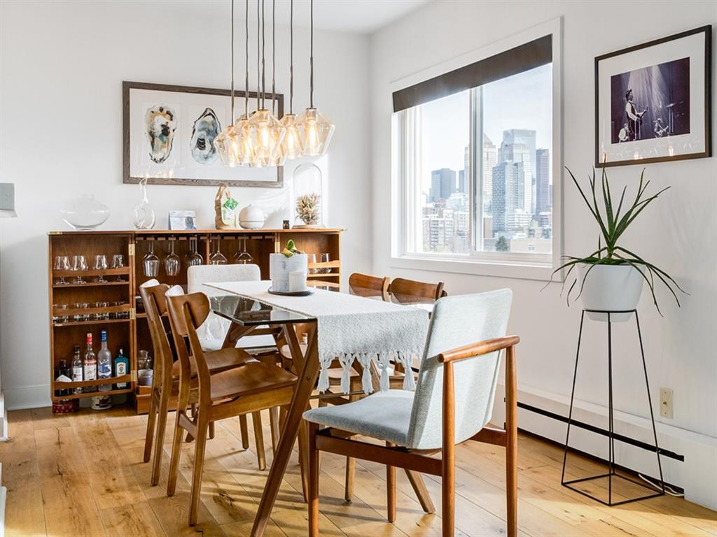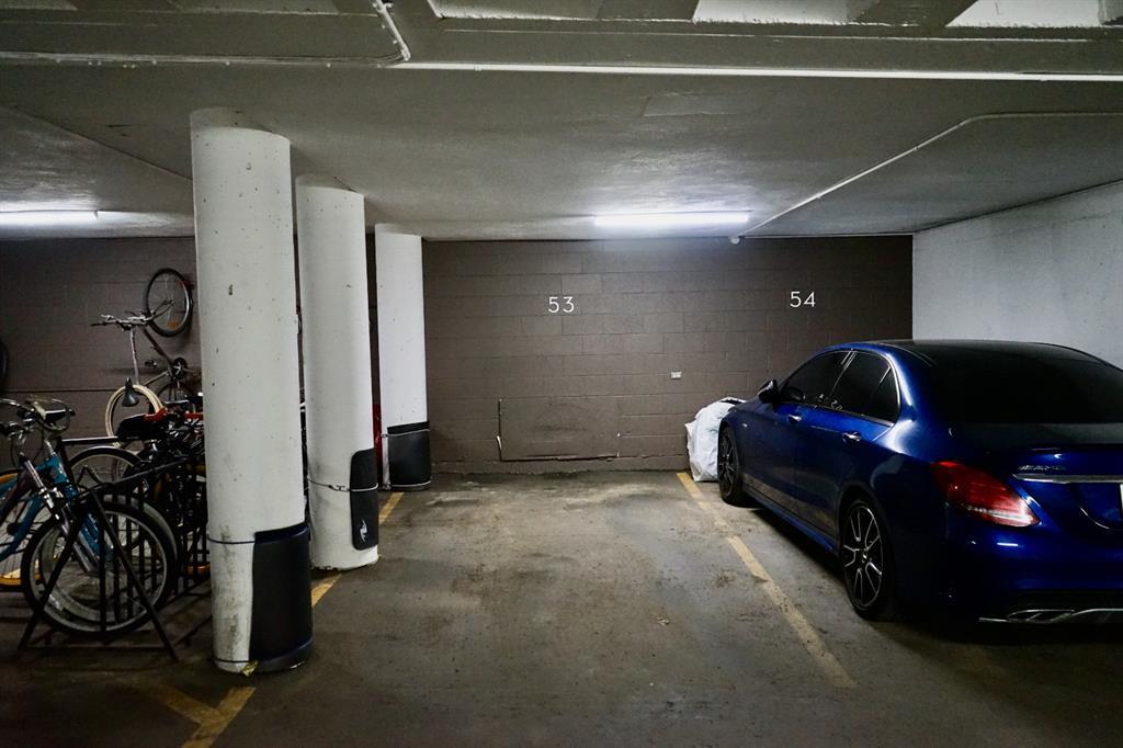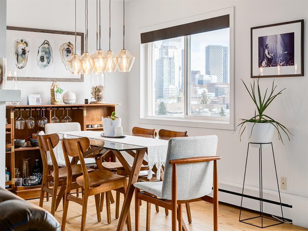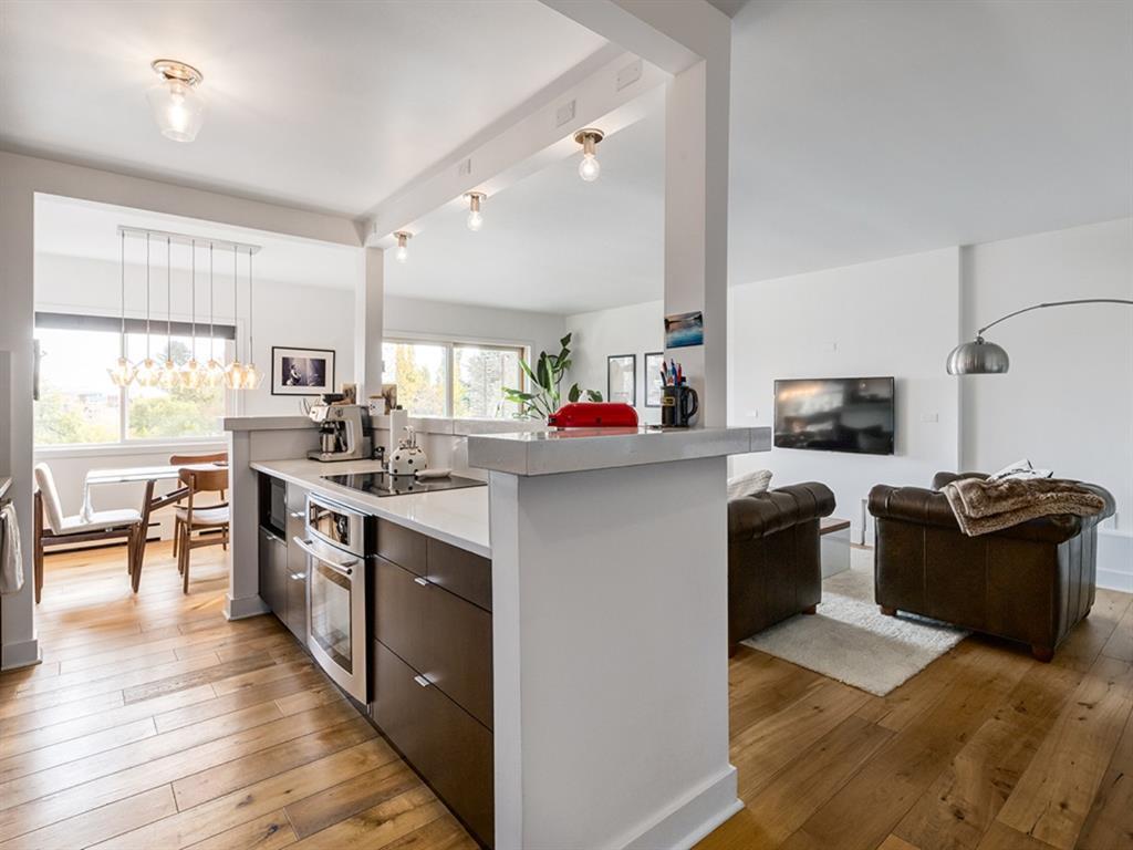 Welcome to this stunning TOP FLOOR two bedroom condo with spectacular views of downtown! This beautifully appointed unit in a CONCRETE building features numerous upgrades throughout. Building is very well managed with a healthy reserve fund (300k+). Wide plank hardwood floors, designer lighting and large windows create a modern, yet warm space. Open concept Denca kitchen boasts plenty of cabinetry, quartz countertops, Jenn-Aire S/S appliances, and under cabinet lighting. Spacious living and dining rooms are perfect for entertaining and feature custom floating walnut shelving. Master bedroom features a walk-in closet with custom built-ins and insuite laundry. Second bedroom is a great size and easily fits a queen bed. 4 piece bath has a beautifully tiled bath/shower combo with a built-in shower caddy, sliding glass doors and infloor heat. Enjoy your morning coffee while taking in the incredible city views from your private balcony. This fantastic condo also comes with underground titled parking and a separate storage unit. Don’t miss out on owning in this well run complex with a healthy reserve in the highly sought after community of Lower Mount Royal, with easy access to all that 17 Avenue, the downtown core and Mission have to offer. Book your private viewing today! (id:22211)