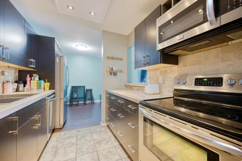 FANTASTIC TOP floor UPDATED condo overlooking GREEN SPACE. You will be impressed by this completely updated unit. The kitchen features dark espresso maple cabinets with granite tile countertops and STAINLESS STEEL appliances with an adjacent dining area. The living room features warm laminate flooring and patio doors that lead to your BALCONY that over looks green space. The bedroom is very spacious. There’s also barge into storage which could accommodate the addition of in suite laundry with board approval. This is a very desirable complex with incredible amenities including: an outdoor POOL, TENNIS courts and rec centre. The building has had newer windows, elevator and other maintenance items done. Excellent location close to shopping, transit and an easy commute to the city centre! (id:22211)