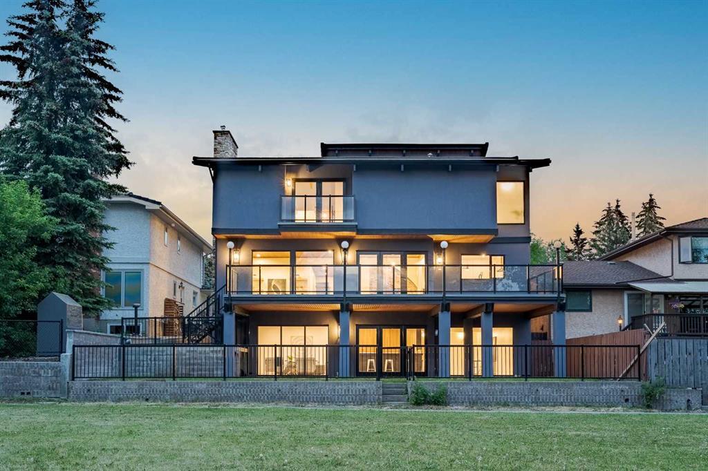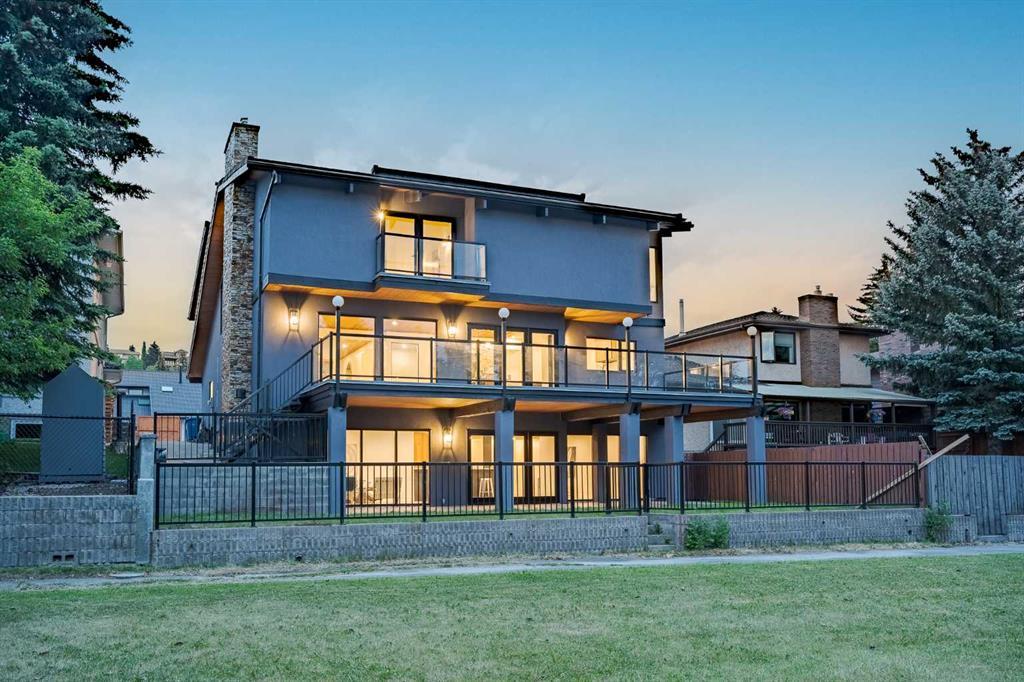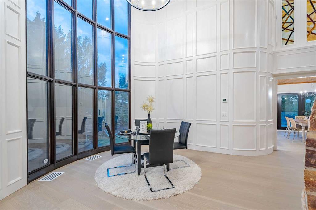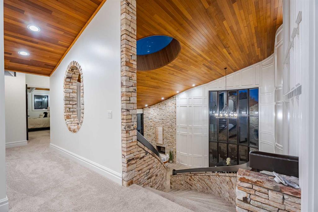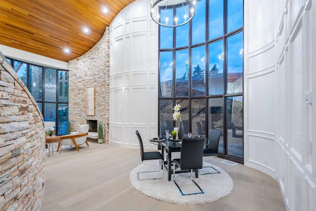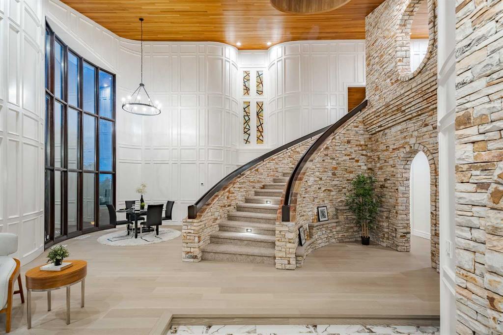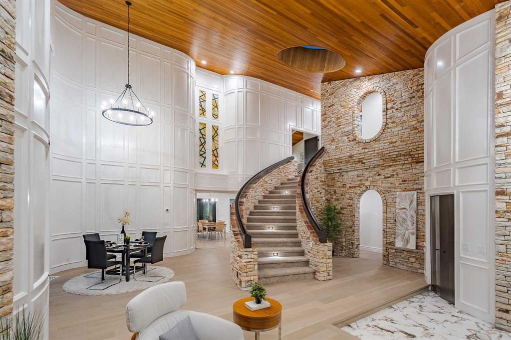 Every dream is fulfilled in this stunning modern-day Edgemont castle. Inside, a breathtaking family room is the start of nearly 5500 sq. ft. of living space. Soaring shiplap ceilings and a circular skylight bring the sky inside. Featuring metal clad windows throughout with a value of over $100,000. Curved, panelled walls are an engineering marvel, while stone elements in the hearth of the wood-burning fireplace and the stairway ground the space. Oval window peeks and arches in the feature walls enhance the castle's aesthetic. Curved windows along the front and dining area are a premium design choice that adds to the juxtaposition. In the kitchen, a waterfall island is a gorgeous centrepiece. The gas range has a pot filler faucet and a custom hood fan, and a hidden panel French door refrigerator is a coveted selection. Next to the breakfast nook, a glass tasting room displays your fine wines and spirits. French doors to the deck and picture windows create an open-air feel. The conversation will flow around the gas fireplace in the sunken living area. The powder room is beautifully appointed, and the oversized double attached garage entry contains a laundry room to complete this level. Upstairs, 22-foot shiplap ceilings and open rafters are both cozy and expansive. The primary retreat is a serene oasis with built-in dressers, a sitting area, and a balcony. A dressing room features a vanity with a sink opposite the ample walk-in closet. An epic shower dominates the ensuite, with a bench, a window, rainfall and angled shower-heads, and body jets. The freestanding soaker tub enjoys a secluded corner and a private laundry room here. The second and third bedrooms have walk-in closets and share Jack and Jill access to a phenomenal bathroom with a triple vanity and a separate wash closet holding the toilet, tub, and shower. A curved anteroom is an ideal desk space next to the bedrooms, and there is a fantastic den at the head of the stairs. Sconces line the stairwell curving down to the walkout basement, where a rec area with a wet bar and a covered patio are a quintessential setup for entertaining. A custom theatre room offers the ultimate movie night setting. Two more bedrooms have a Jack and Jill ensuite and a powder room, too. The utility area has four furnaces: main floor, primary bedroom, top level, and basement. A cold room is also ideal for a more extensive wine collection or pantry. Outside, the yard backs onto a green space, doubling the lawn area, and you have phenomenal views of westward skies from the patio or the deck. Set on the edge of Edgemont Estates, there is a sprawling network of parks and pathways to all sides. Iconic Nose Hill Park is within walking distance, as is the local athletic centre. Nearby, Northland Mall, Dalhousie, and Crowfoot Crossing offer a plethora of shops and dining options, and commuters will love the easy drive to downtown. Of course, the mountains are also a draw; you can be out of town in less than ten minutes. See this one today! (id:22211)