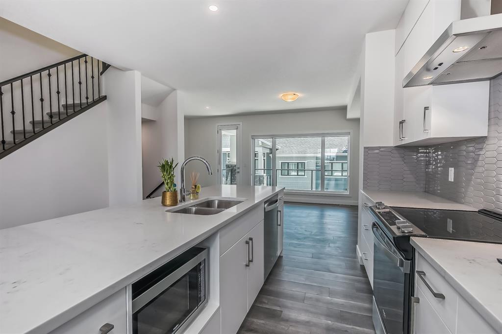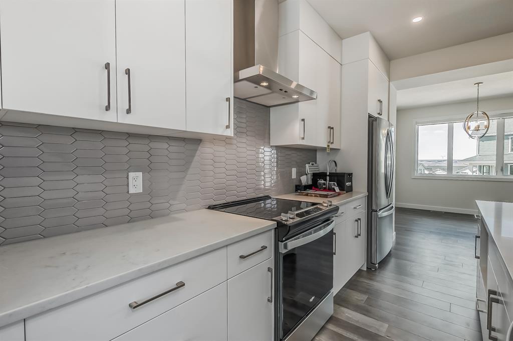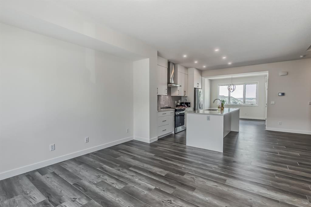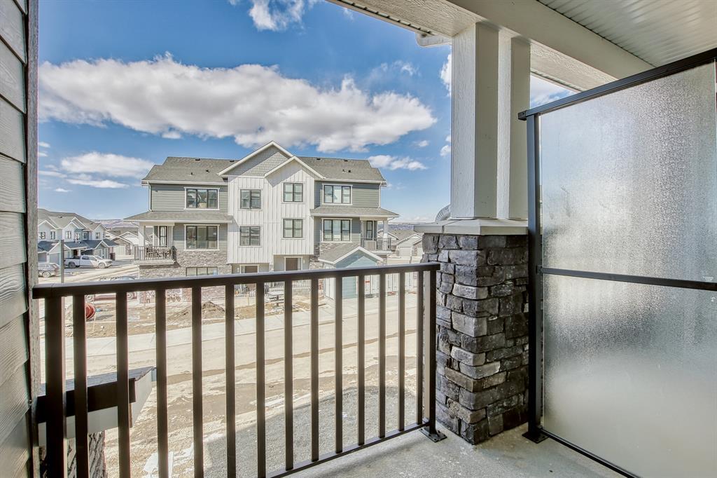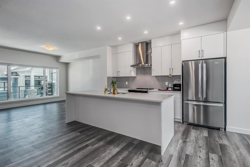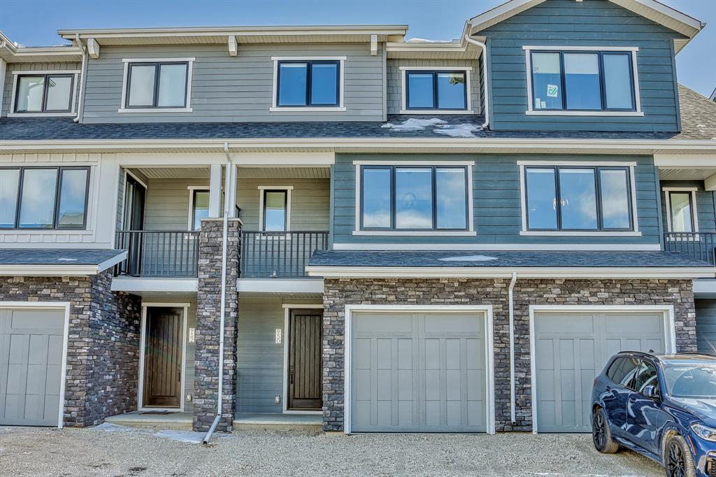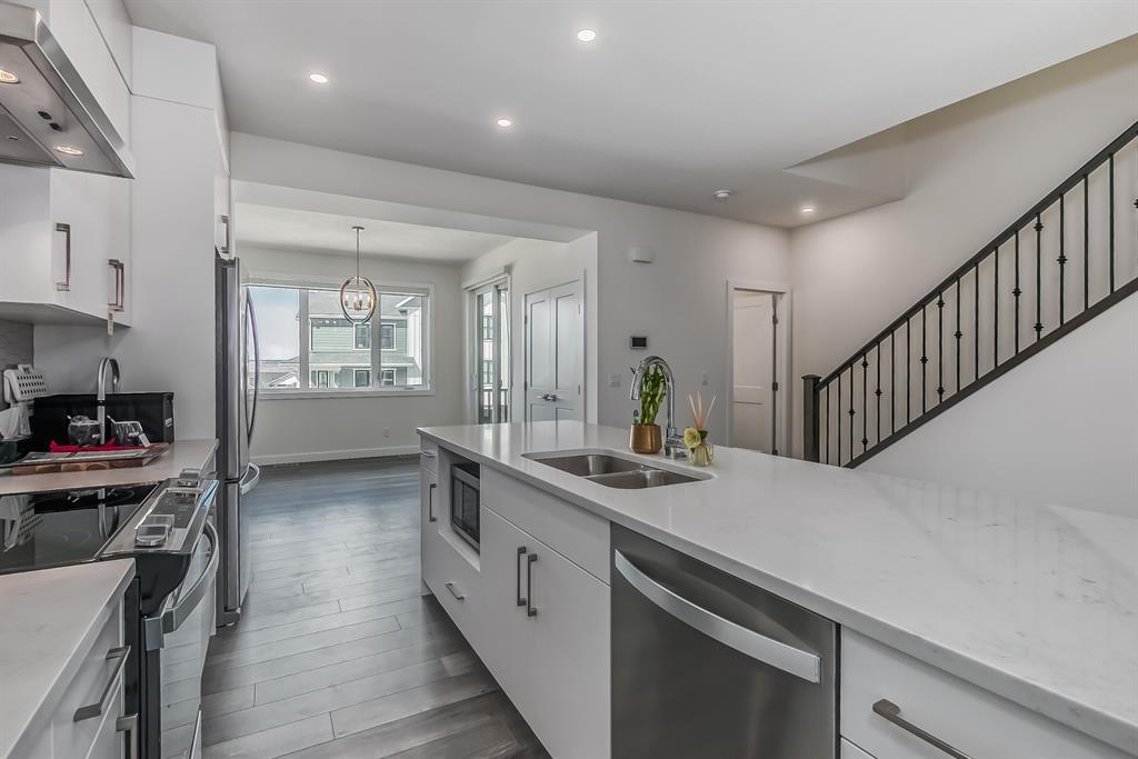 Welcome to one of the most desirable floorplans in the complex, with views, this over 1864 sq ft finished walkout home will not disappoint you. This amazing home is ready for you, and all three floors are developed. Driving up to the home you will enjoy the extra long garage and full-size driveway. Walking into the main floor there’s a good-sized rec room with sliding doors to a private large patio with full railing. Upstairs is where the magic happens in the home. The huge open floor plan with the kitchen in the center, high ceilings, HUGE WINDOWS, amazing brightness, luxury wide plank vinyl, covered balconies on each end, one being a very good size for entertaining, the other smaller, one with gas outlet. This LUXURIOUS KITCHEN WILL PLEASE EVEN FUSSY CHEFS: FULL HEIGHT CABINETRY, GORGEOUS QUARTZ COUNTERS, EXTRA LONG 9 FT ISLAND SEATING AT LEAST 5, UPGRADED APPLIANCE PACKAGE, CHIMNEY STYLE HOOD FAN, UNDERMOUNT SINK AND PANTRY. These rooms are huge, the living with a Gas fireplace and stone surround. The dining room will fit big furniture and a desk plus another area in the kitchen for a desk or cabinet. Upstairs, you'll find upgraded carpet, HIGH CEILINGS, a primary bdrm with a walk in closet and dual sink vanity with quartz counters, private water room, walk in shower, and a VIEW of the mountains. The other two bedrooms upstairs also have VIEWS, and the other 4-piece bath also has quartz counters and a soaker tub. THIS HOME IS COVERED BY A FULL HOME WARRANTY, with cement fiber siding. ARRIVE has a retail village which includes a Child Care Centre, professional offices and convenient stores just walking distance from your door. Fantastic access to Banff, COP, Aspen landing, Westhills and Westside Recreation center, Callaway Park, and Calgary farmer’s market. Easily connect to 6 km of nature pathways, neighborhood pond, extensive green space and several playgrounds. Its QUIET, PEACEFUL AND WILL SURPRISE YOU IN THE BEST WAY. Don't miss this wonderful chance to o wn in a beautiful area of SW Calgary in an amazing home with an amazing floor plan. (id:22211)