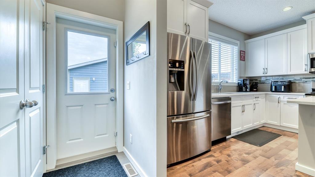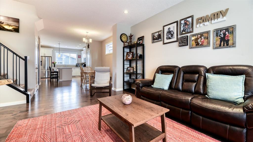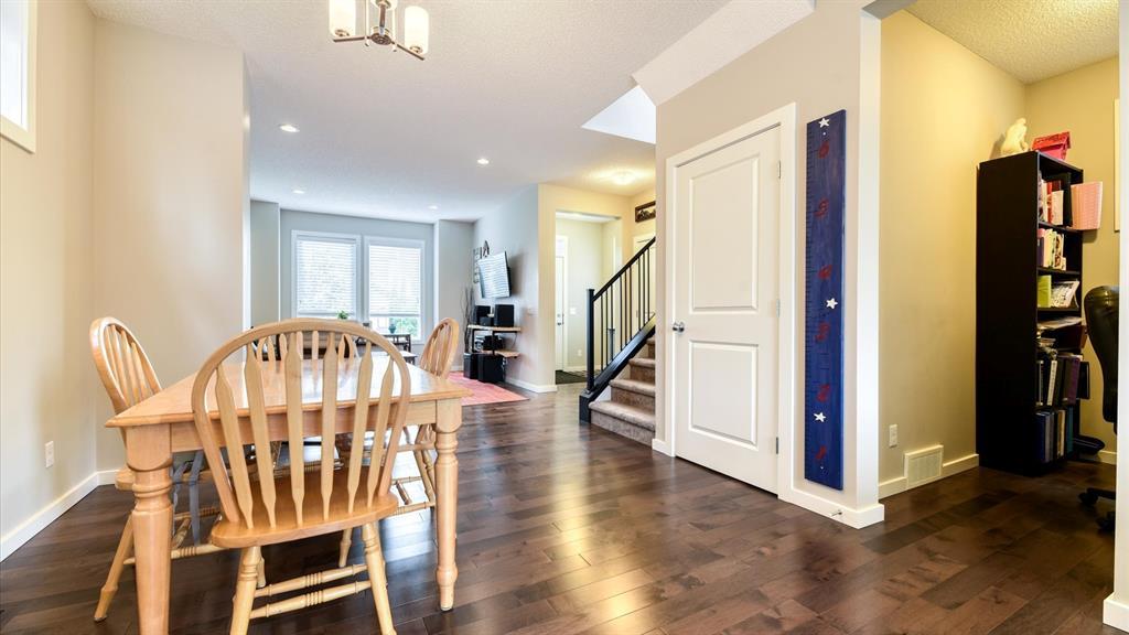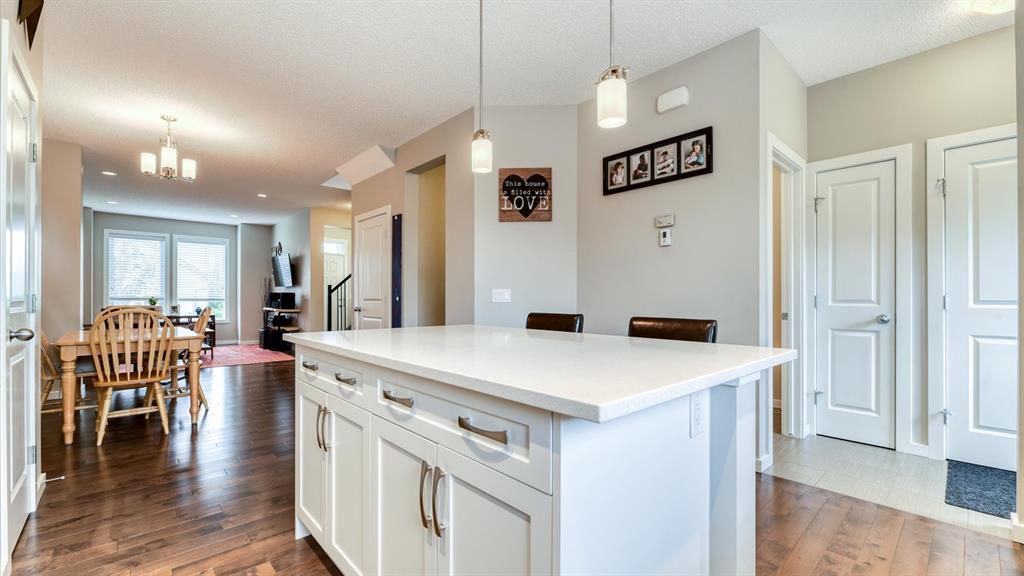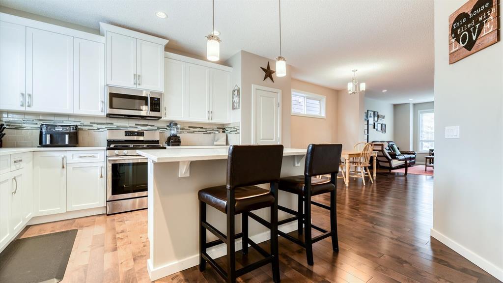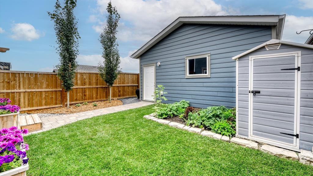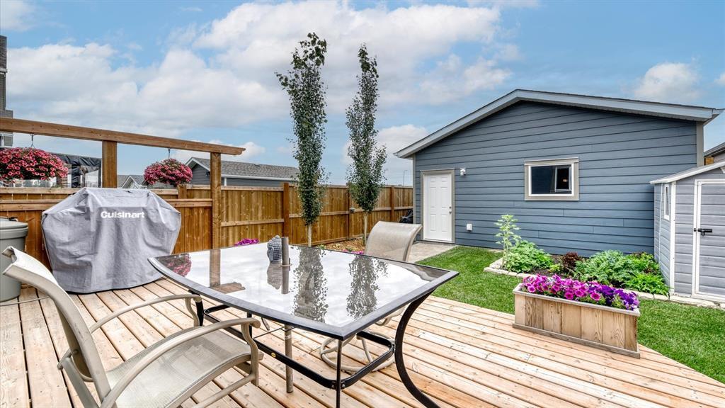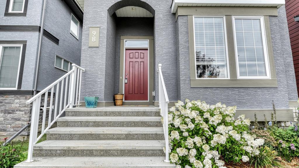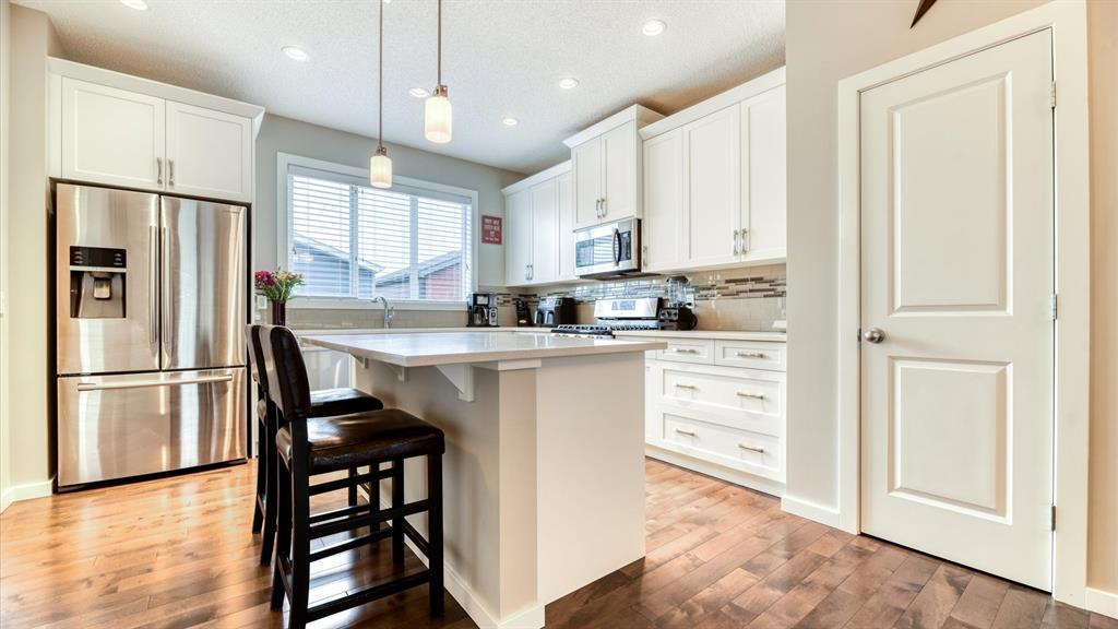 Welcome to 98 Marquis Heights SE, a stunning Mahogany laned home with air conditioning, a detached two car garage, and top floor laundry. You will notice the great use of space throughout, with an open main floor flowing seamlessly from living, to dining, to kitchen, and out into the backyard, but not sacrificing the extras, such as a pocket office and a two-piece powder room. The kitchen offers a considerable island for all the prep space you need, plus large drawers, a pantry, and lots of cabinets. The stainless steel appliances, tile backsplash, and stone counters are beautiful and low maintenance. Upstairs, you’ll find the primary suite with a good-sized walk-in closet and a five-piece ensuite with soaker tub and large walk-in shower. The laundry room offers open shelving for additional storage and a high efficiency front loading laundry pair. There are two extra bedrooms, and a four-piece bathroom upstairs. The backyard is fully fenced and nicely landscaped, with back lane access, a large wood deck with privacy partition, and wood planter boxes. The garage was built in 2021, and is finished with low-maintenance Hardie Board. Mahogany is a vibrant and beautiful master-planned community with a lake, private beach club, wetlands, schools, shopping, and dining. (id:22211)