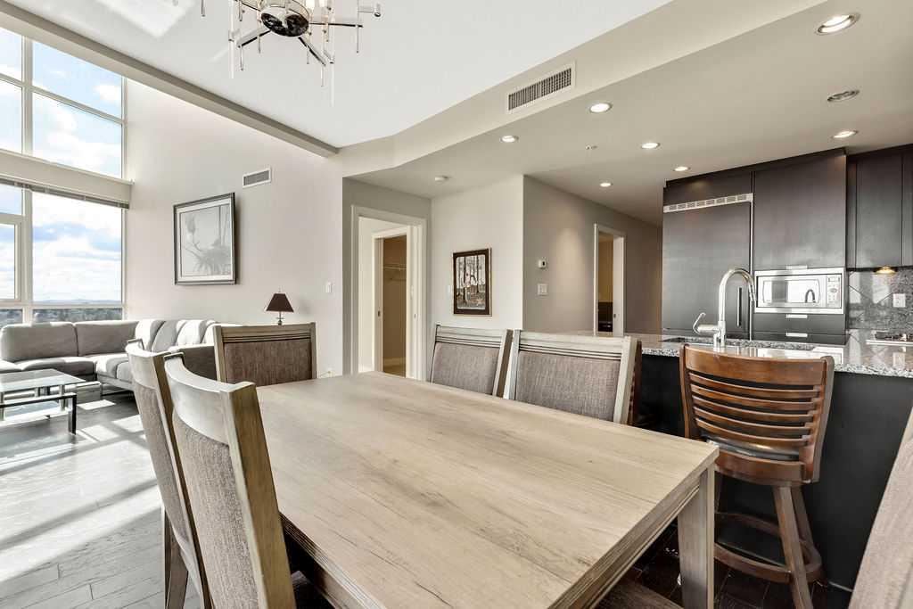 Situated on the 15th floor of the Ovation Tower, this exceptional two-storey condo offers an extraordinary lifestyle defined by wall-to-wall windows, show-stopping views, and refined comfort. From sunrise over downtown Calgary to sunset behind the Rockies, the panoramic scenery is simply unmatched. The sweeping view of the golf course provides peace and tranquility….and you might even catch a golfer achieve the elusive hole in one!