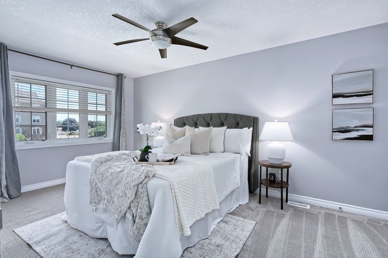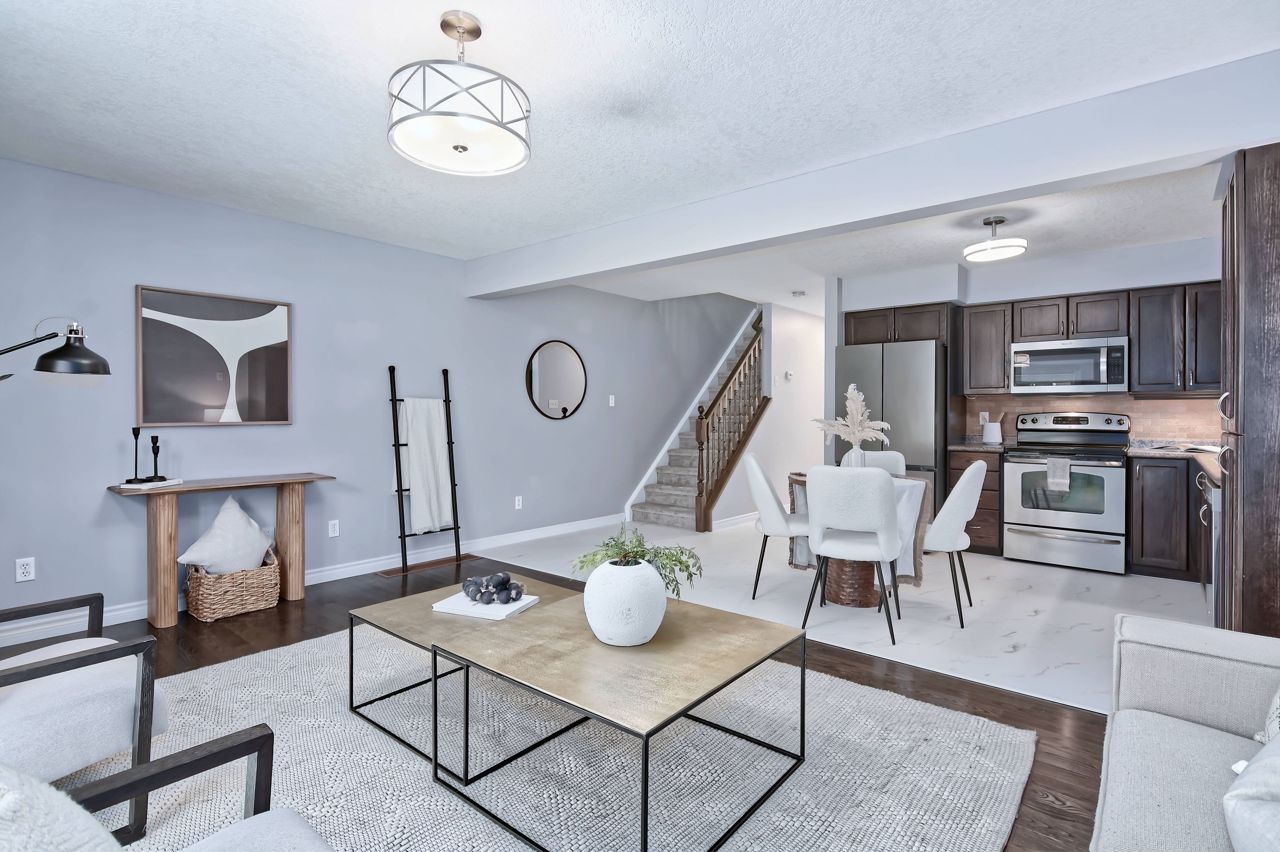 Welcome to this beautifully updated freehold townhouse, located in one of Cambridge's most family-friendly neighbourhoods. Move-in ready with extensive upgrades: brand-new furnace, air conditioner, carpet upstairs, and main level flooring (2025); new washing machine and fridge (2025); new light fixtures (2025); new roof (2022); plus, fresh paint throughout. Walk-in to the bright open concept main floor with a deck off the living area. Head upstairs to the 3 bedrooms including a generous sized master with ensuite. The basement already has subflooring, framing, and a roughed-in bathroom -- ready to finish to your taste. Condo fee of $160 includes grass mowing & snow removal, additional parking spots can be rented. Inside garage access and plenty of storage. Bright and functional with modern appliances, this home is steps from parks, splash pads, and walking trails and just minutes from the 401. A rare opportunity to enjoy modern living, a welcoming community, and exceptional value in Cambridge.