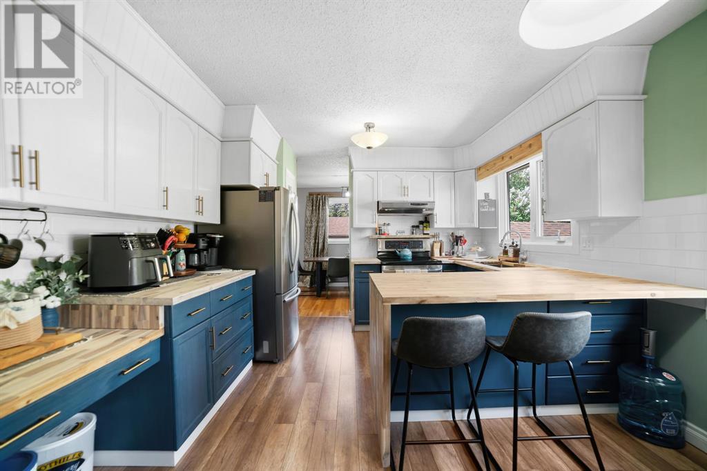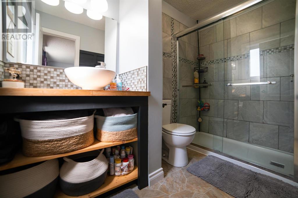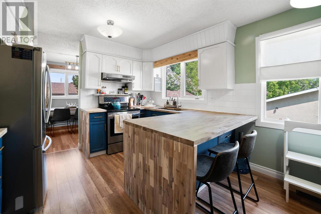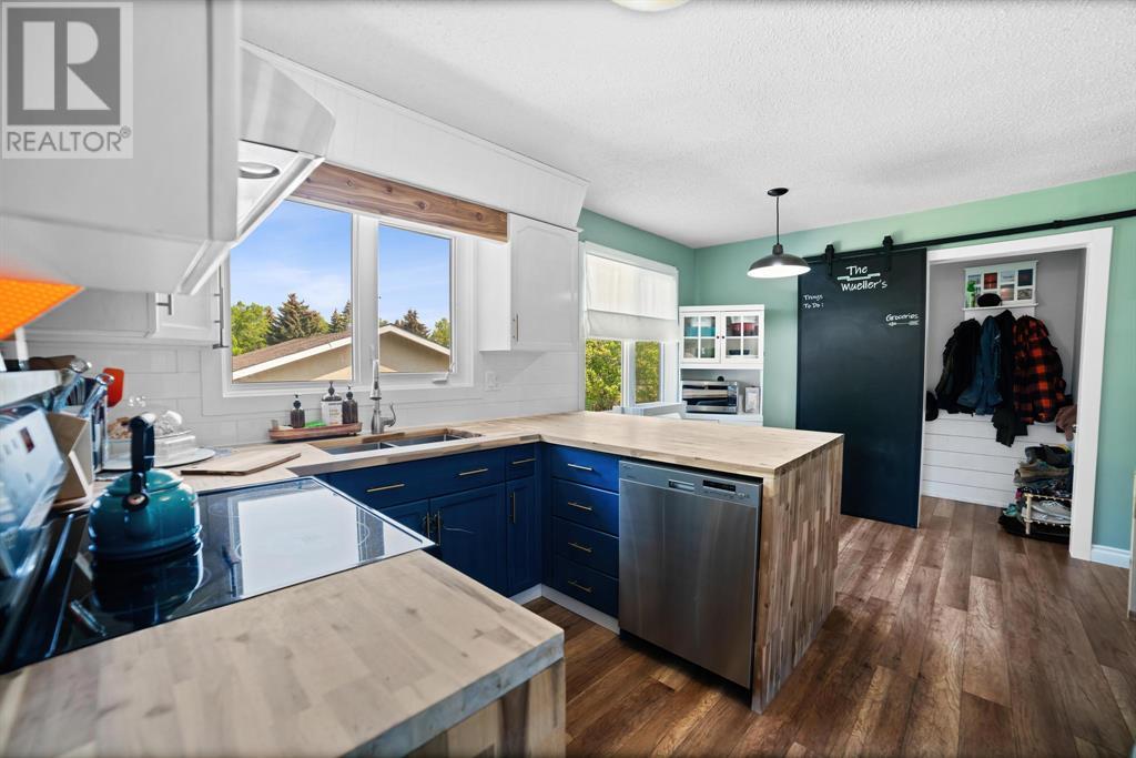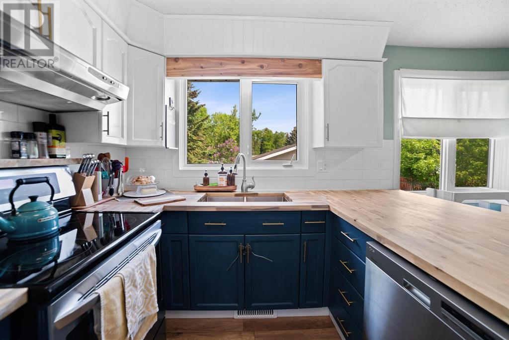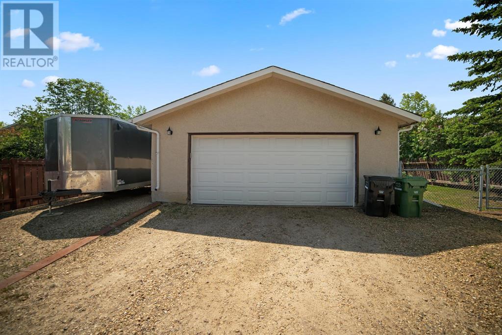 Excellent 5 bedroom, 3 bathroom family home located in a sought after mature neighborhood, with all the features and updates a growing family would want. You'll notice the curb appeal of this attractive home the moment you drive up, having a recent front foyer extension, beautiful new entrance door w/ side lite, siding & added insulation and vinyl windows. The extended front foyer allows for plenty storage and opens the entrance up into the bright living room which features a natural gas fireplace, and hardwood floors. Off this space is the dining room and a stylish renovated kitchen with butcher block counters, new tile backsplash and new modern appliances. Under the waterfall countertop is additional storage and an ideal sitting space for kitchen conversations, homework, and meals & snacks. You'll love the extra bonus space this kitchen offers where you can fit a second table, additional storage, or just family gatherings. There are 3 bedrooms on the main floor, a full updated main floor bathroom, plus a primary bedroom ensuite with a beautiful walk in shower. The new flooring, paint, fixtures & craftsman details such as the wainscoting paneling, and accent wood features throughout give this home a custom quality move-in ready feeling. The lower level of the house is accessed not only from the front foyer, but a second stair off the back door. This ties the lower level to the main with ease of access. This lower level has an additional 2 large bedrooms, another full bathroom, and a large family room where you can fit several living spaces including a bar area, play area, TV sitting space, and cozy gatherings around the wood stove. Again new vinyl windows allow natural light into all these spaces. The mechanical room has the new high efficiency furnace (2016), HWT (2020), washer & dryer (2015), and plenty of built in storage. There is a private mature landscaped yard that is fully fenced, with patio area, custom shed, and the 24' x 24' heated garage. There are 2 s paces for RV parking or additional vehicle storage, with back alley access. This is a beautiful property overall with a tastefully renovated house, practical living spaces, yard and garage! (id:22211)