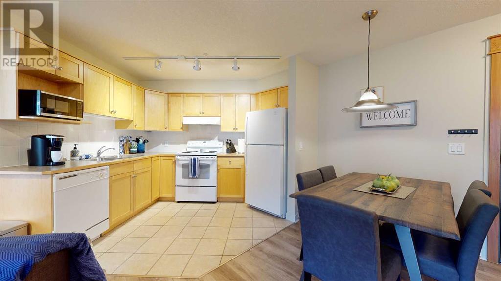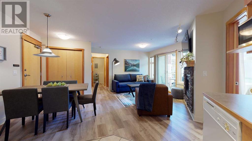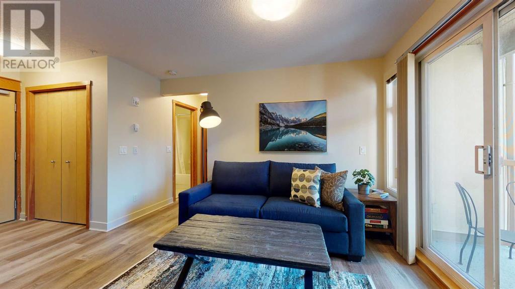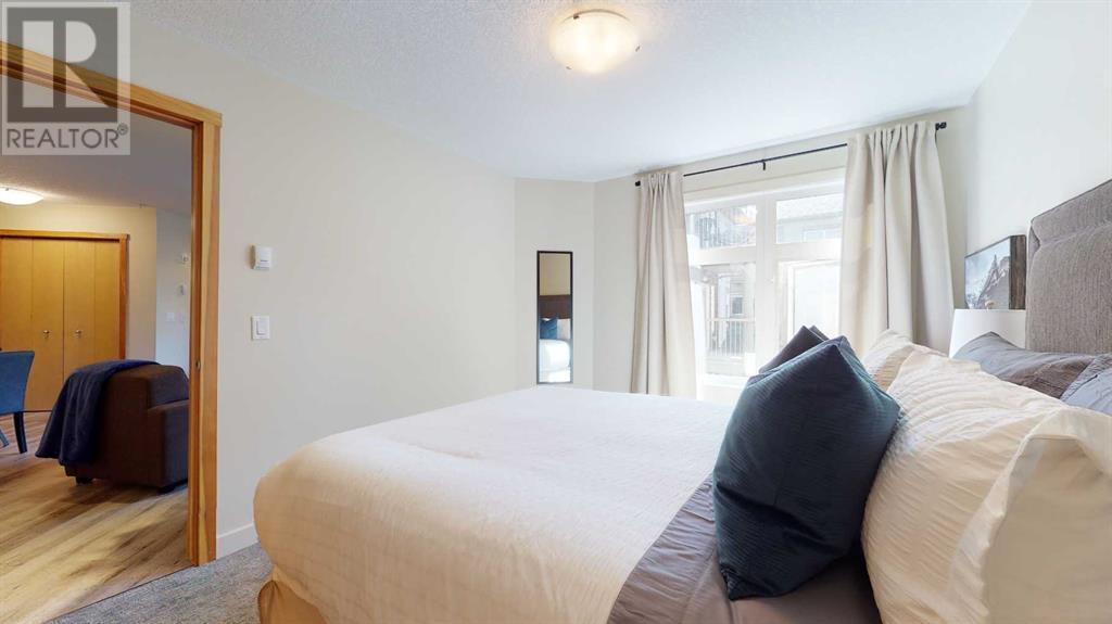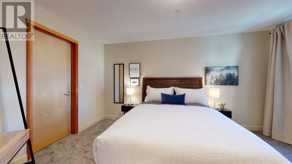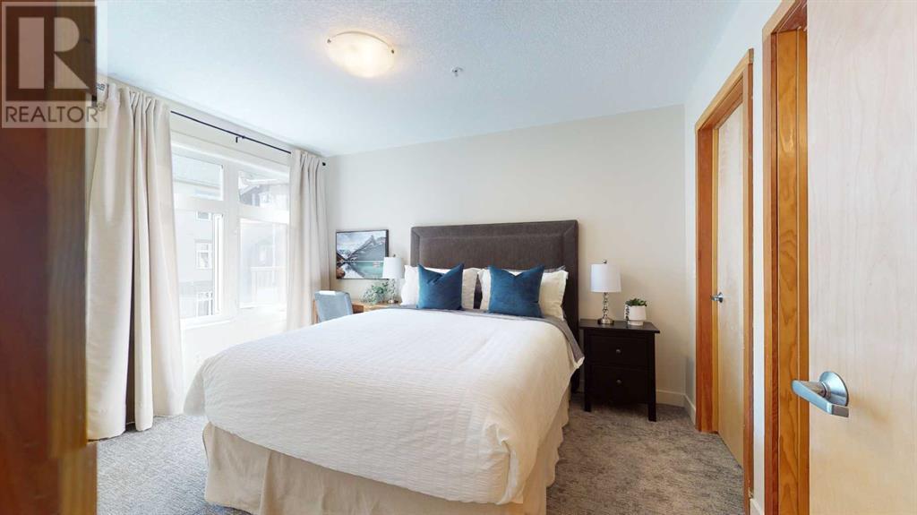 Professionally renovated and decorated to greet your guests. Bright suite over 800 sqft boasts spacious living area south facing windows flooding the space with sunlight. Sensible floorplan separates the two bedrooms for optimal privacy. Open concept kitchen and dining area with south facing deck and mountain views. Large closets for extra storage & in suite laundry complete this condo. Any work is eliminated w/new flooring, window coverings, light fixtures, newer appliances & freshly painted throughout. Windtower offers secure underground titled parking and a fitness room. Desirable zoning allows for fulltime living or nightly short term rentals. Perfect for the first time home buyer, investor or weekend getaway. A short walk to amenities including restaurants, spa, gyms, dog park, public transit & extensive network of trails. (id:22211)