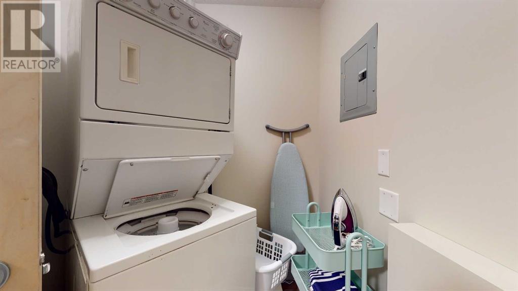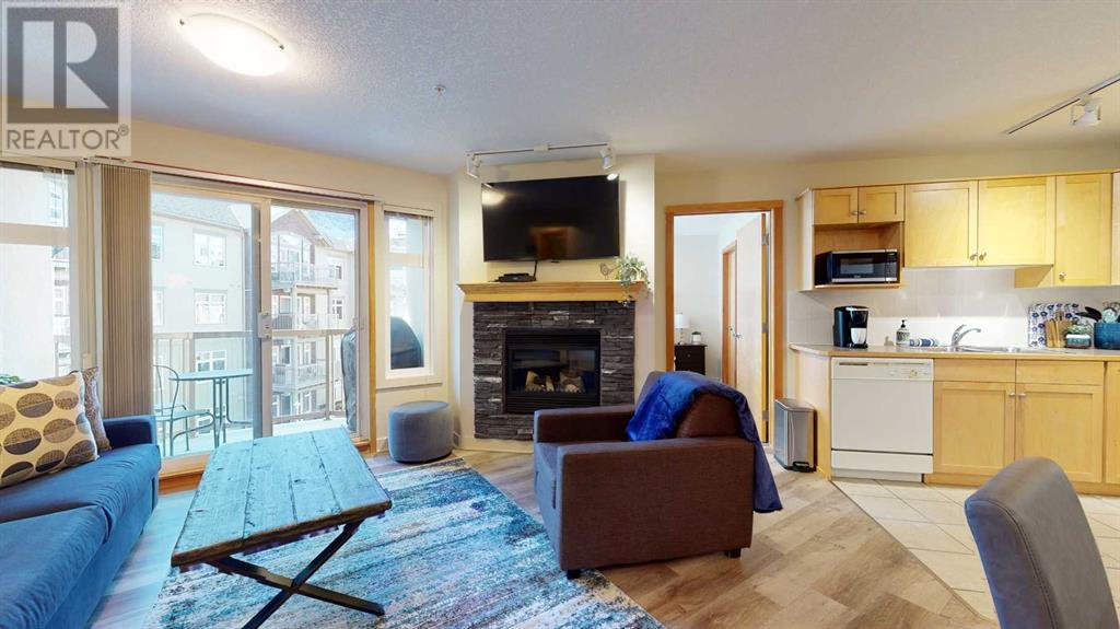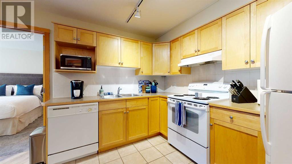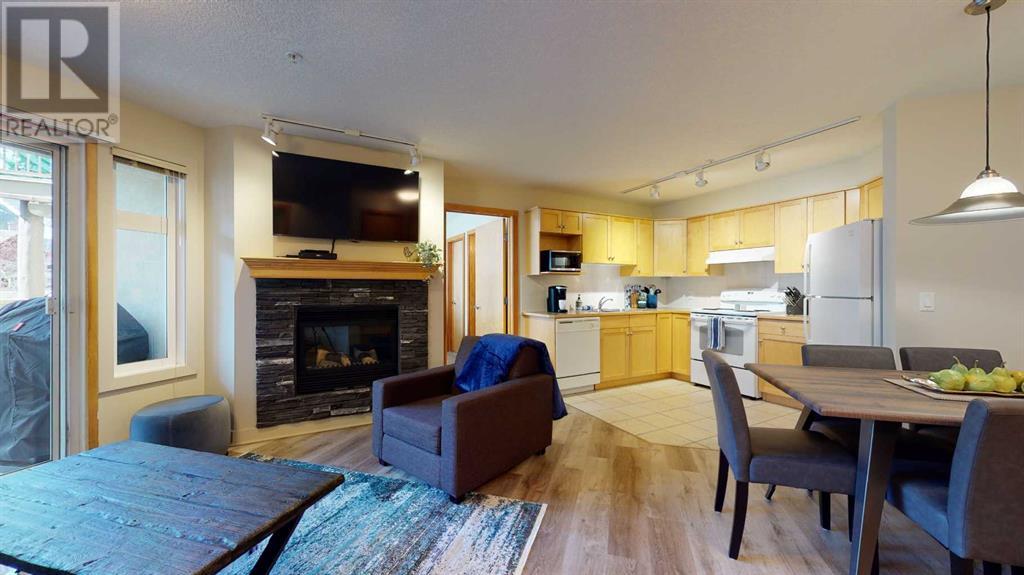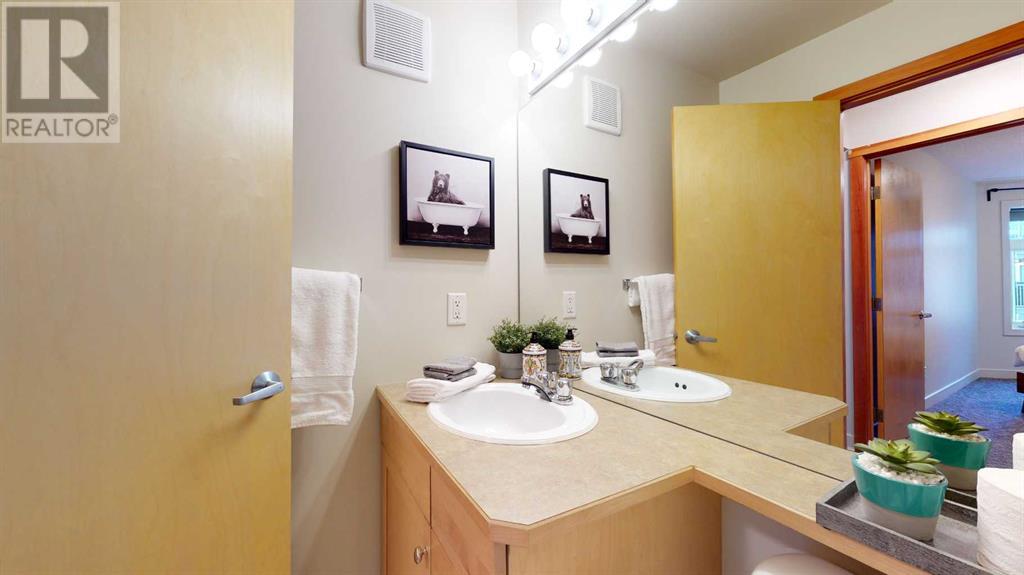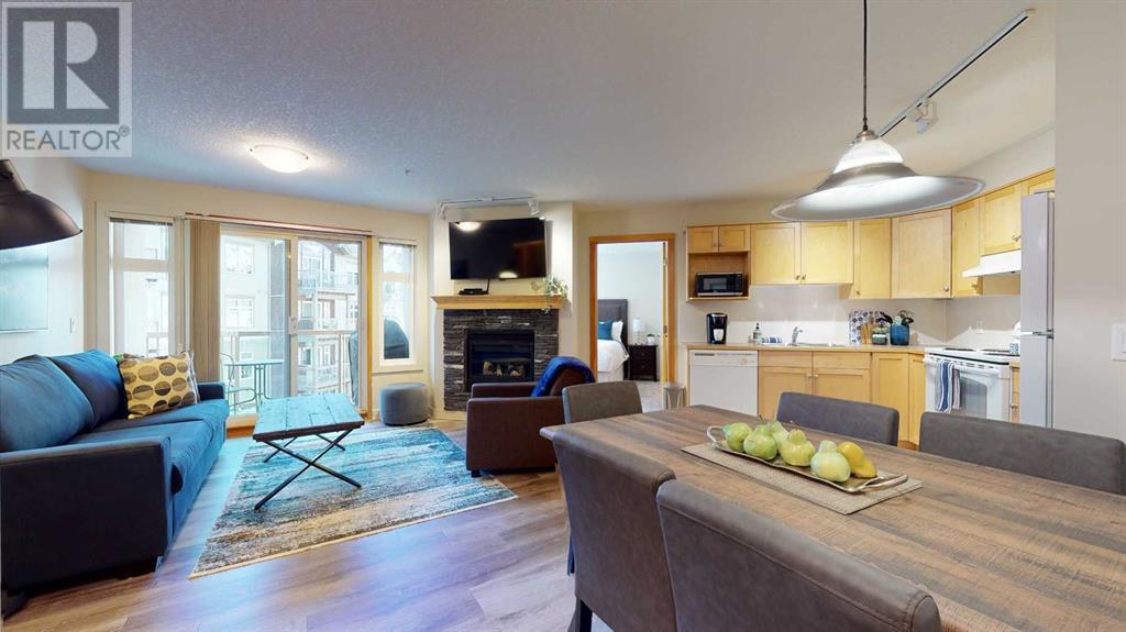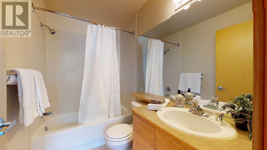 Professionally renovated and decorated to greet your guests. Bright suite over 800 sqft boasts spacious living area south facing windows flooding the space with sunlight. Sensible floorplan separates the two bedrooms for optimal privacy. Open concept kitchen and dining area with south facing deck and mountain views. Large closets for extra storage & in suite laundry complete this condo. Any work is eliminated w/new flooring, window coverings, light fixtures, newer appliances & freshly painted throughout. Windtower offers secure underground titled parking and a fitness room. Desirable zoning allows for fulltime living or nightly short term rentals. Perfect for the first time home buyer, investor or weekend getaway. A short walk to amenities including restaurants, spa, gyms, dog park, public transit & extensive network of trails. (id:22211)
