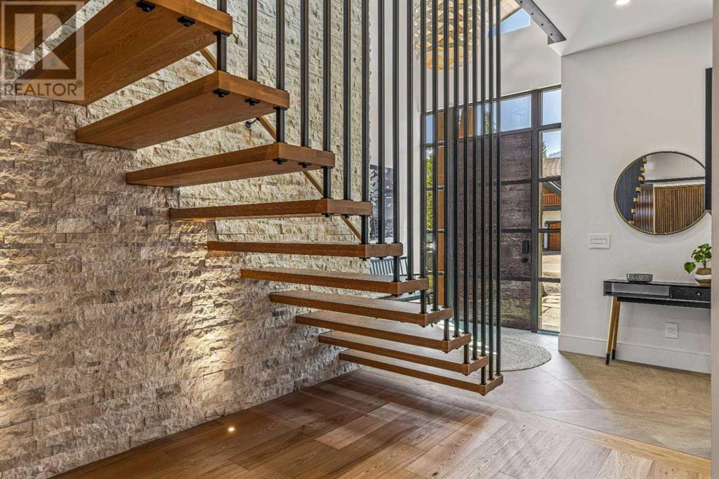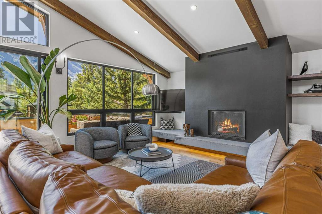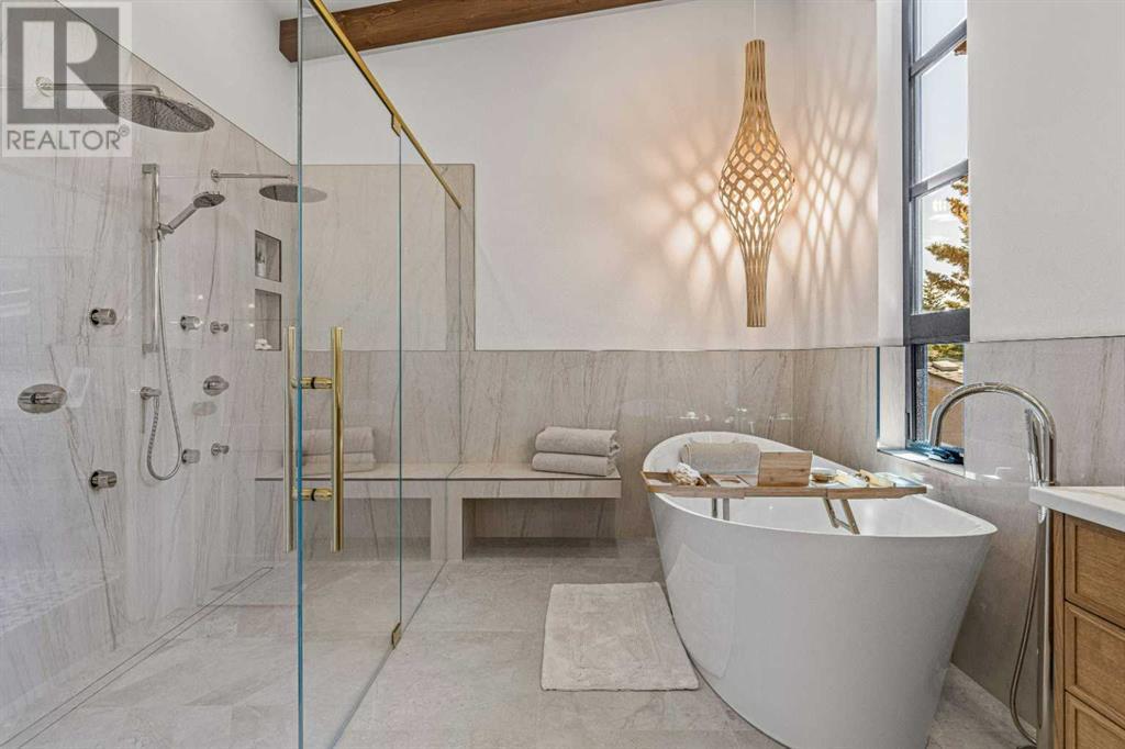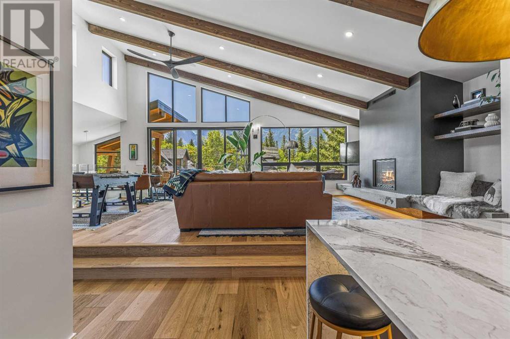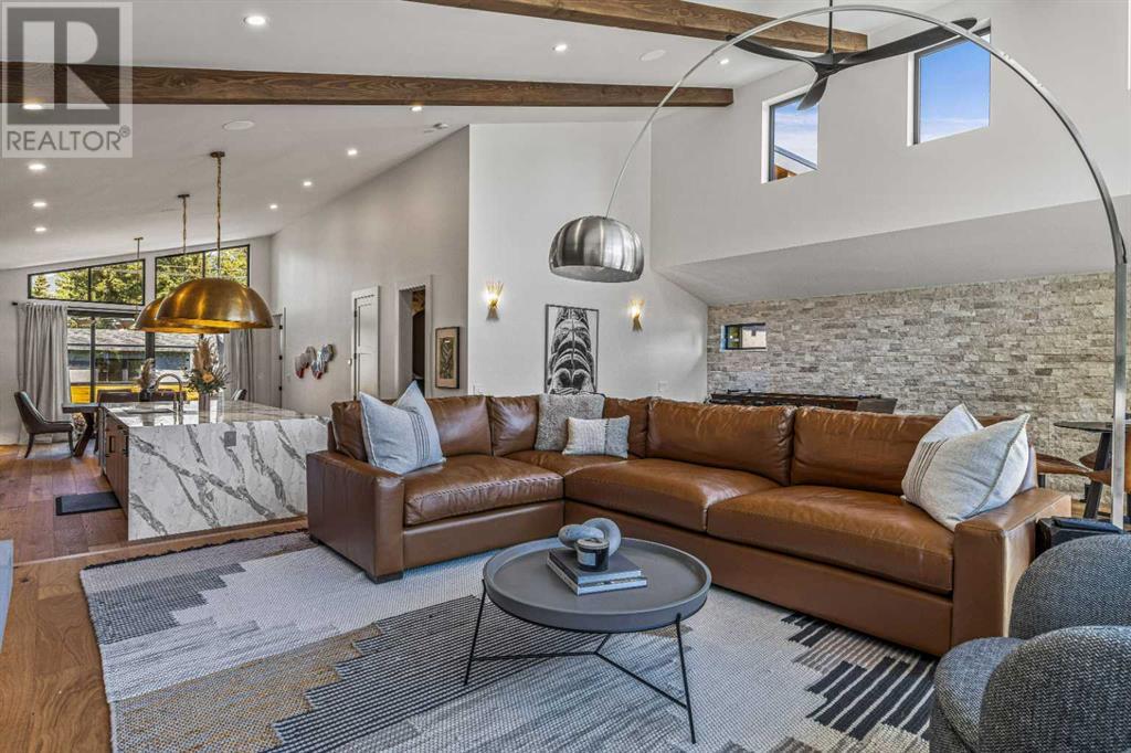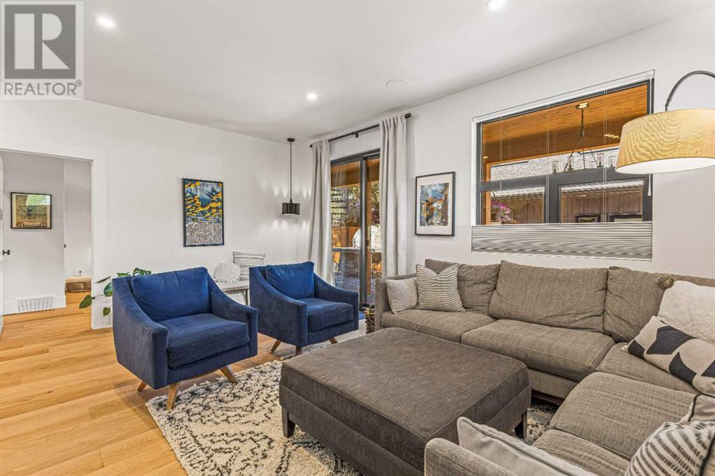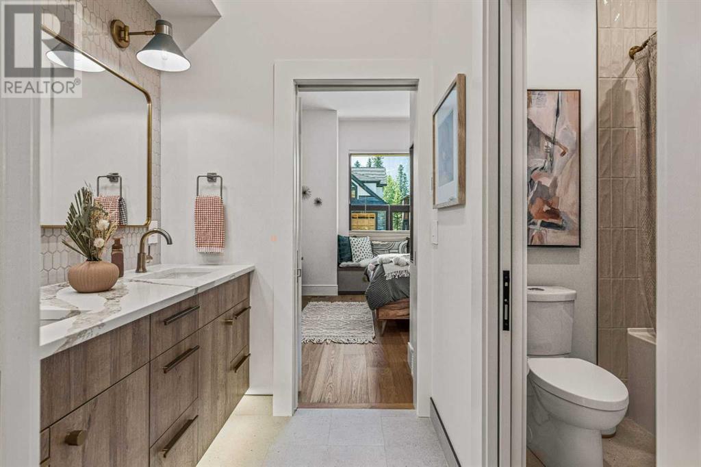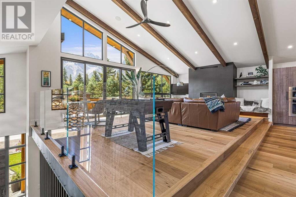Custom Crafted Home with Legal Carriage Suite! Meticulously curated with only the finest materials, this newly built 7-bedroom, 5.5 bath home is breathtaking! Designed with a large family in mind, the main floor features a gorgeous mud room, an office/den/guest room with King size murphy bed, 3 additional bedrooms with ensuites, laundry area and a family room with access to the backyard hot tub and pizza oven. Greeted by an 8’ solid fir door, a dramatic suspended staircase leads to an upper floor like no other. The top floor features an open concept kitchen/living/dining area, half bath and primary suite with a spa-inspired ensuite. View focused and shielded by 600 SF of privacy decks, the upper level is awe-inspiring with no shortage of panoramic mountain views. Design elements include artistic lighting by New Zealand Designer, David Trubridge, high-end lighting package including brass dome statement pendants from Restoration Hardware, marble feature wall, white oak hardwood floors throughout, custom walnut barn door and slat walls, stylish tiles, cabinetry by Bow Valley Kitchens, waterfall quartz countertops in the kitchen and primary ensuite, Miele appliances, LG WashTower, Hunter Douglas blinds, BC fir timber beams. Upgrades include heated bathroom floors, 6’ Bain Ultra air jet soaker tub with heated backrest, Legrand switches and outlets, a Sonos sound system, air conditioning, water softener, hot water on demand, a custom spiral staircase, and impressively, 1,500 SF of heated crawl space offering an enormous amount of storage. The heated garage further features a gear room, a flex space for a home gym or another guest bedroom with King size murphy bed and 3-piece ensuite. The detached garage can be used with a rental suite above or is ideal as a guest house, for the most discerning buyers. The legal Accessory Dwelling Unit (carriage suite) currently generates $2,500/month. Seller is a licensed Associate in the Province of Alberta. (id:22211)