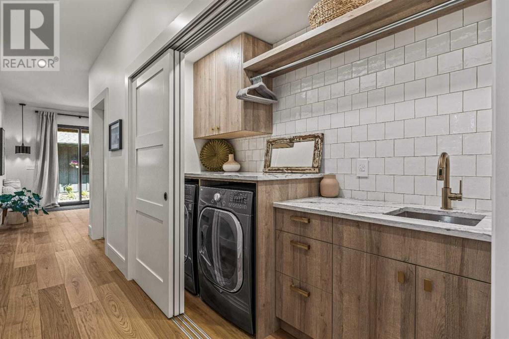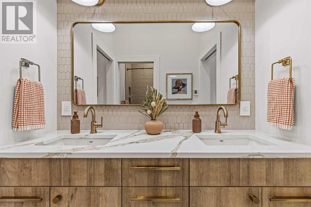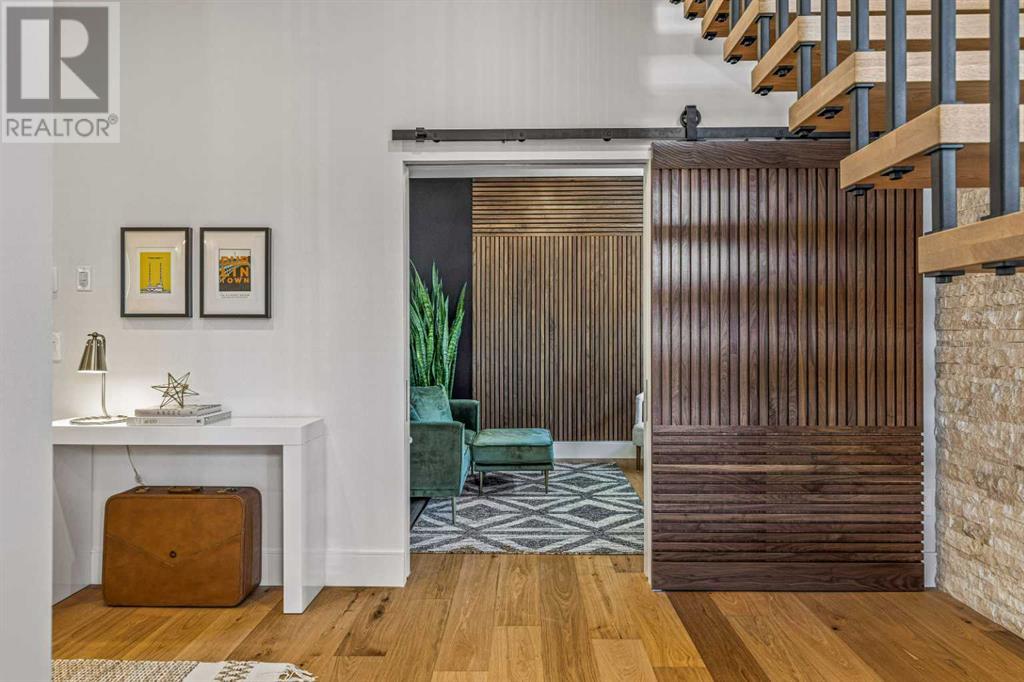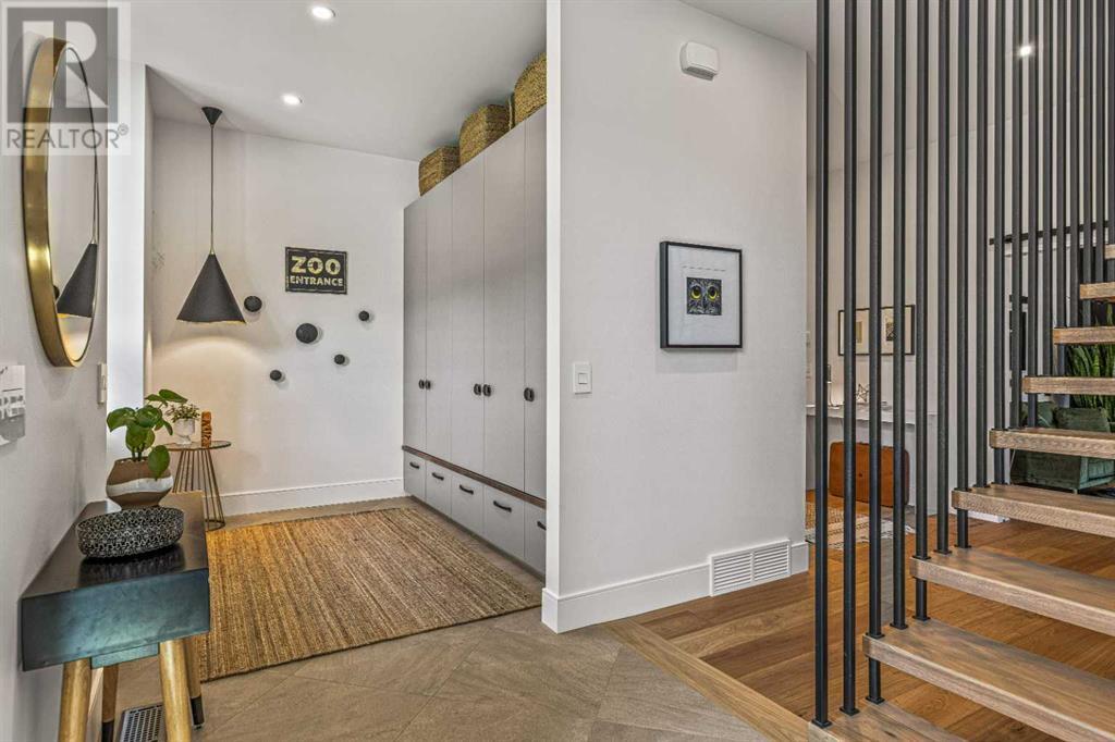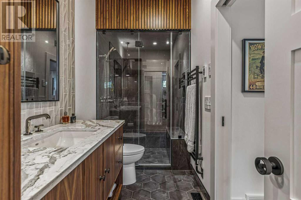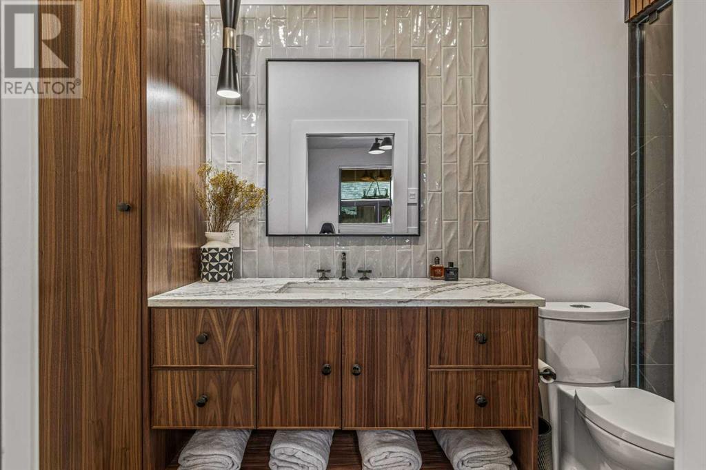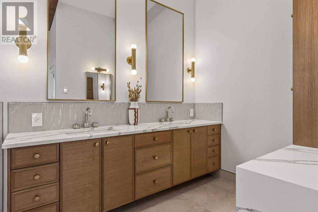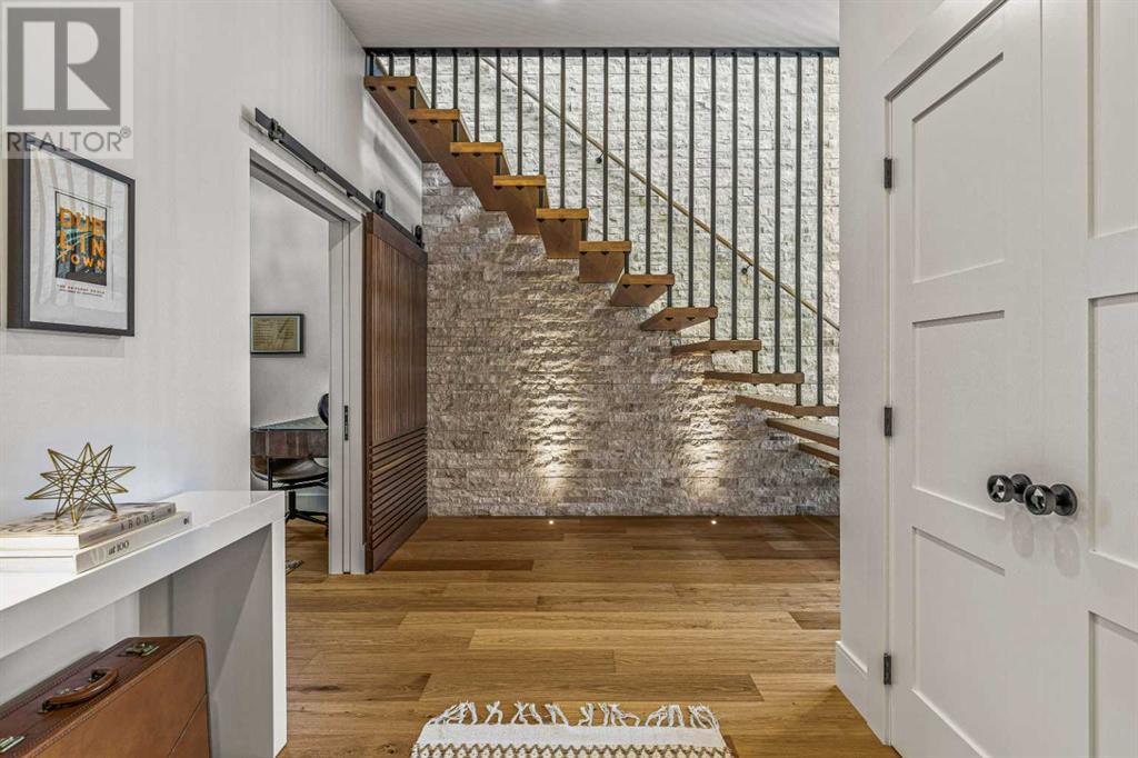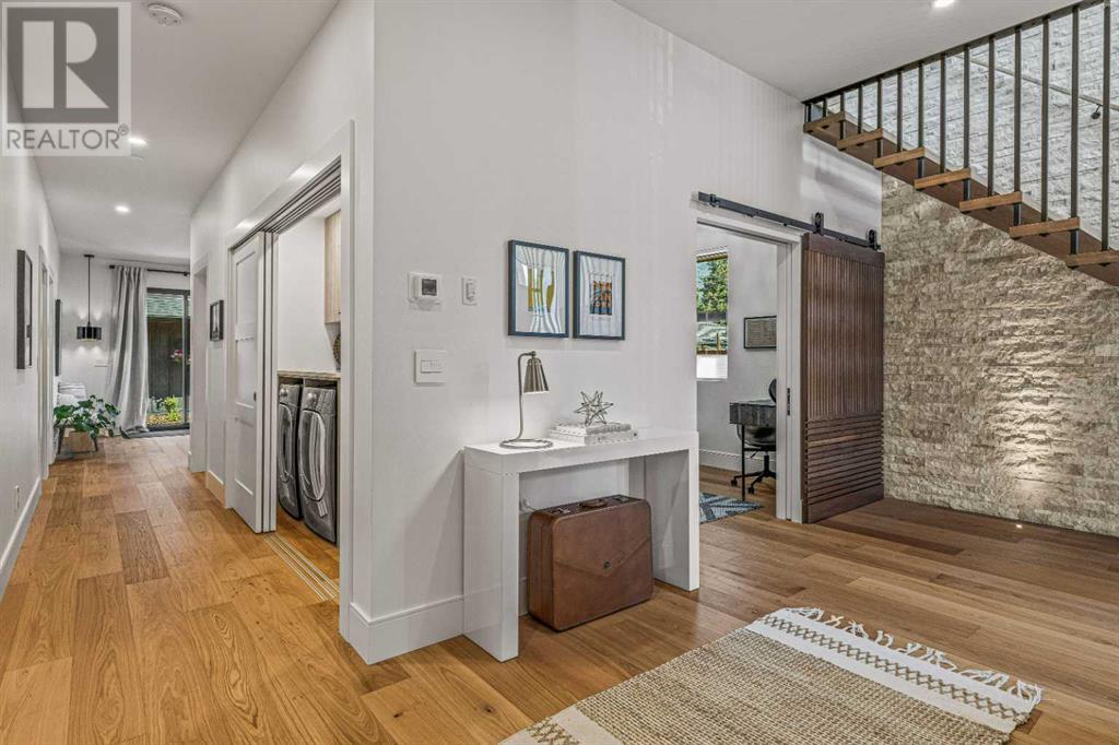 Custom Crafted Home with Legal Carriage Suite! Meticulously curated with only the finest materials, this newly built 7-bedroom, 5.5 bath home is breathtaking! Designed with a large family in mind, the main floor features a gorgeous mud room, an office/den/guest room with King size murphy bed, 3 additional bedrooms with ensuites, laundry area and a family room with access to the backyard hot tub and pizza oven. Greeted by an 8’ solid fir door, a dramatic suspended staircase leads to an upper floor like no other. The top floor features an open concept kitchen/living/dining area, half bath and primary suite with a spa-inspired ensuite. View focused and shielded by 600 SF of privacy decks, the upper level is awe-inspiring with no shortage of panoramic mountain views. Design elements include artistic lighting by New Zealand Designer, David Trubridge, high-end lighting package including brass dome statement pendants from Restoration Hardware, marble feature wall, white oak hardwood floors throughout, custom walnut barn door and slat walls, stylish tiles, cabinetry by Bow Valley Kitchens, waterfall quartz countertops in the kitchen and primary ensuite, Miele appliances, LG WashTower, Hunter Douglas blinds, BC fir timber beams. Upgrades include heated bathroom floors, 6’ Bain Ultra air jet soaker tub with heated backrest, Legrand switches and outlets, a Sonos sound system, air conditioning, water softener, hot water on demand, a custom spiral staircase, and impressively, 1,500 SF of heated crawl space offering an enormous amount of storage. The heated garage further features a gear room, a flex space for a home gym or another guest bedroom with King size murphy bed and 3-piece ensuite. The detached garage can be used with a rental suite above or is ideal as a guest house, for the most discerning buyers. The legal Accessory Dwelling Unit (carriage suite) currently generates $2,500/month. Seller is a licensed Associate in the Province of Alberta. (id:22211)